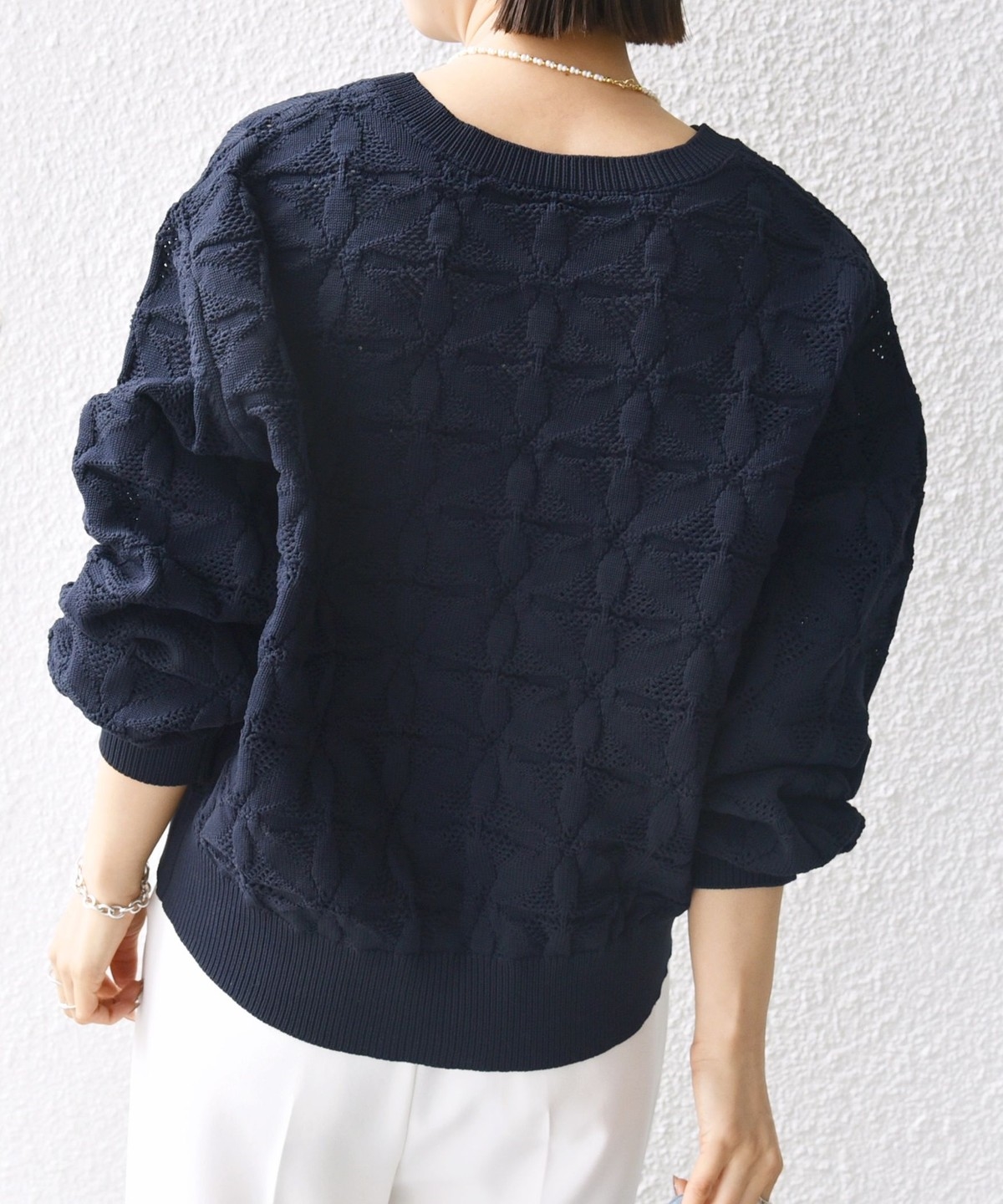 フラワーモチーフの柄編みが素敵なニットプルオーバー。