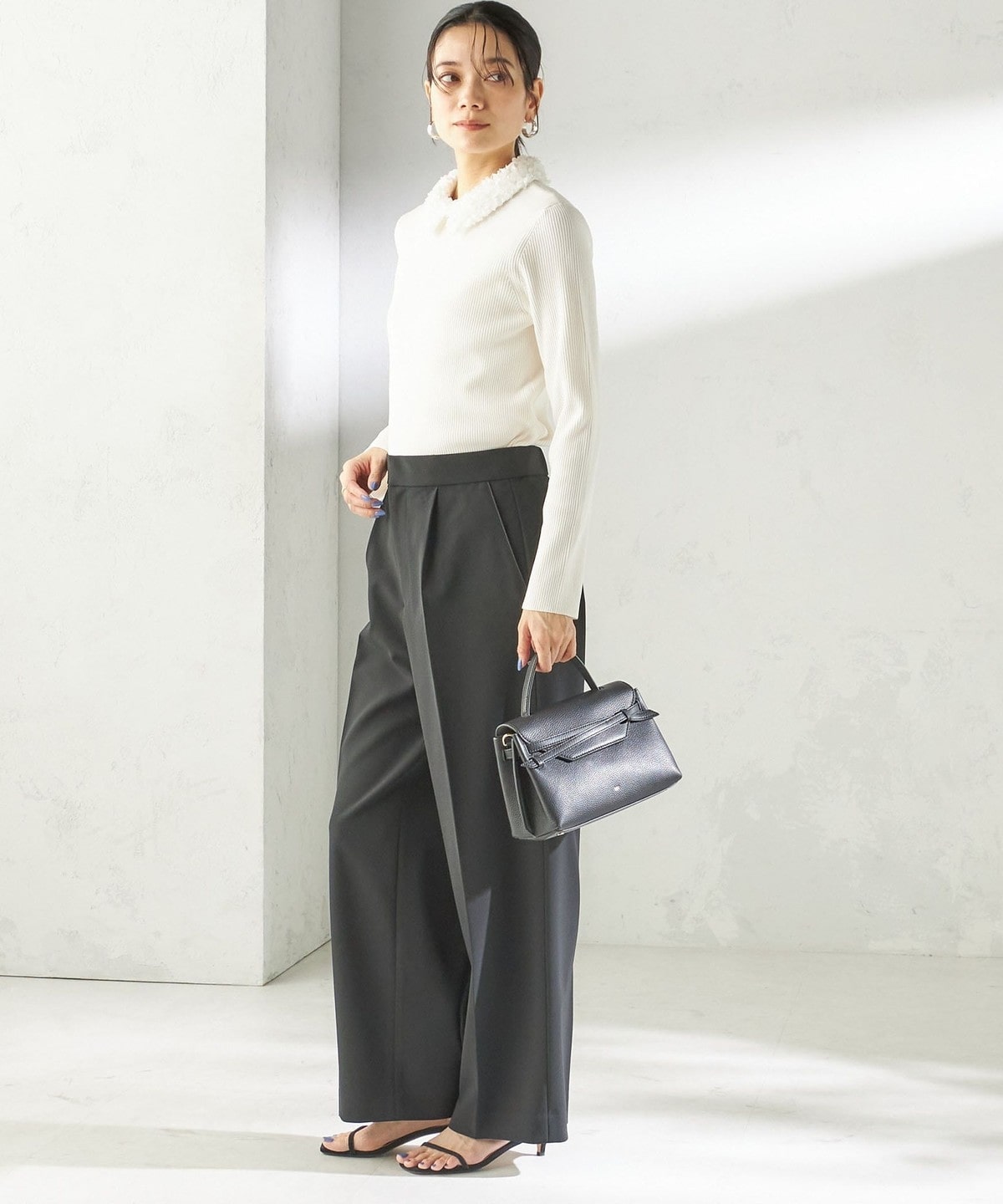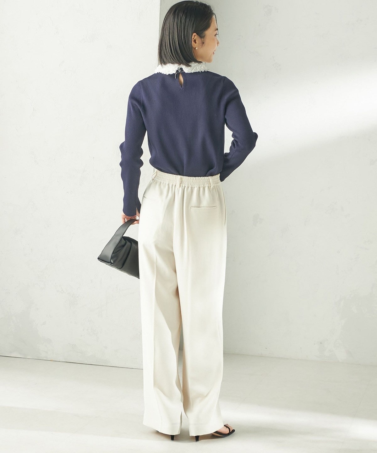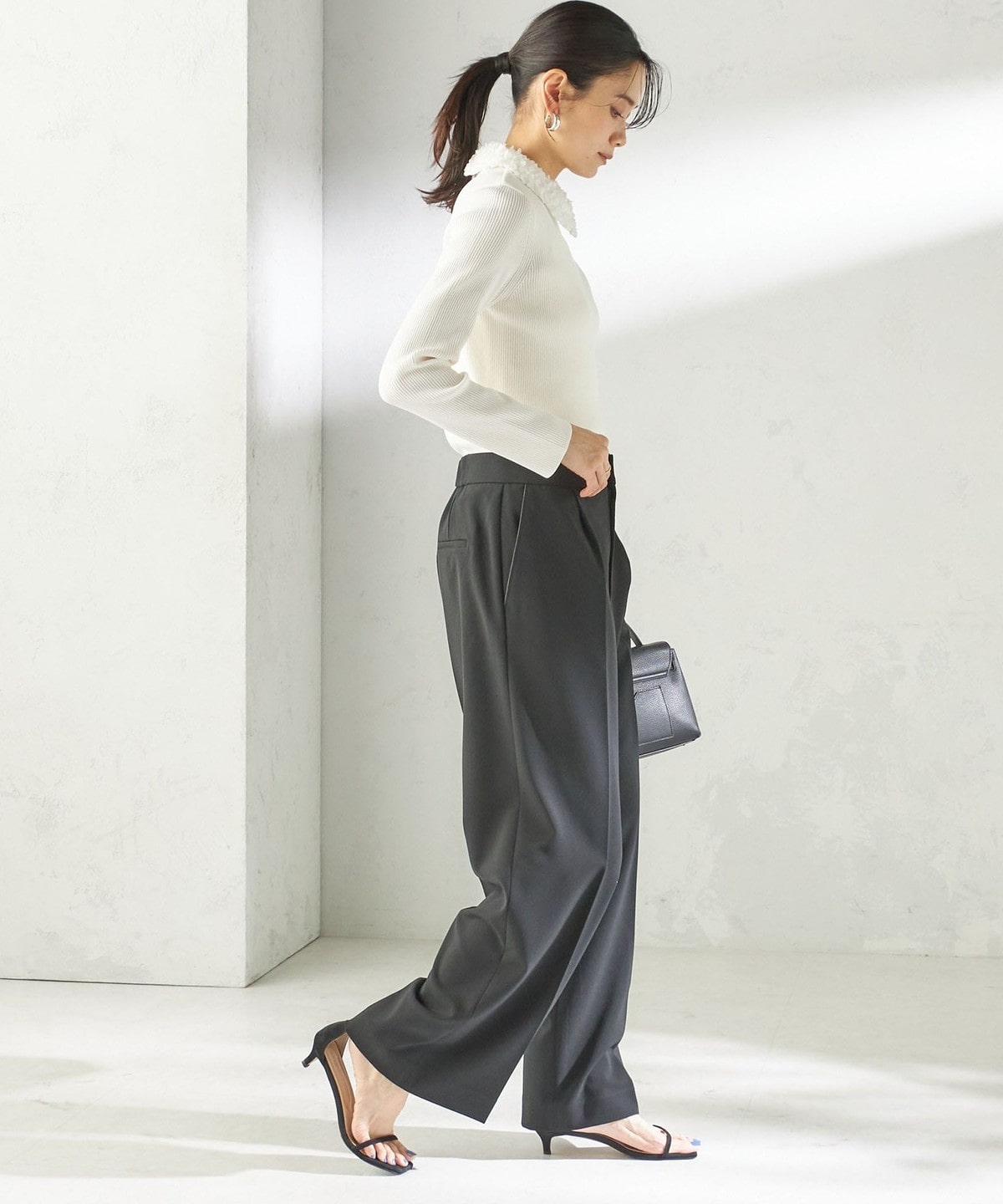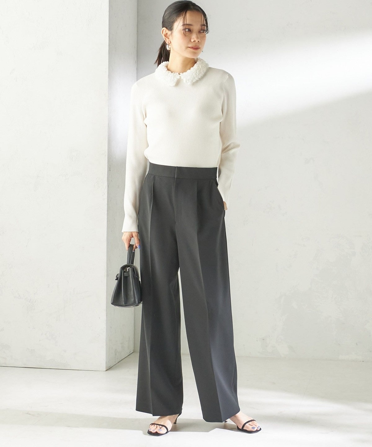 定番のキレイめパンツに合わせたクラシカルなコーディネートでは、フラワーモチーフの衿がフェミニンな優しさを演出し、上品ながら華やかなコーディネートになります。