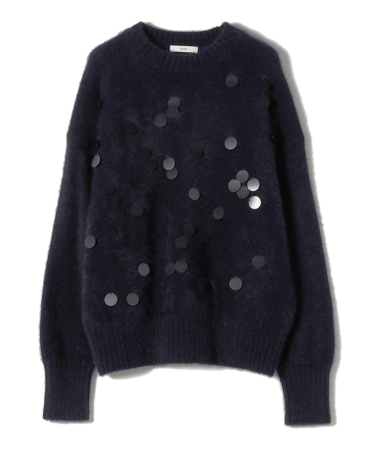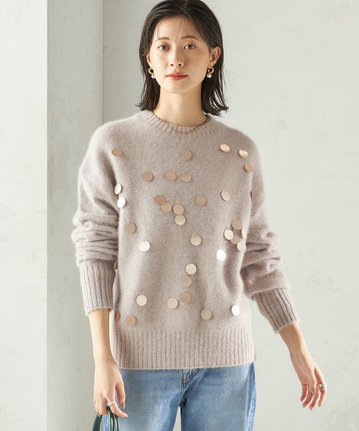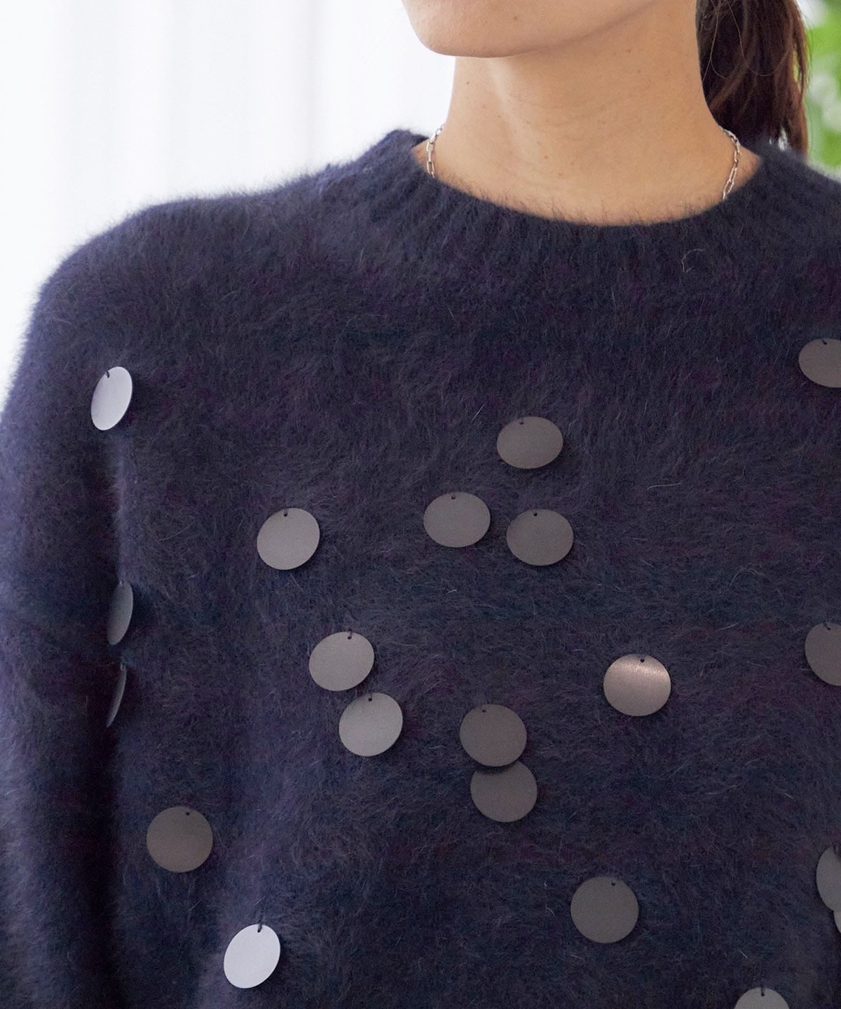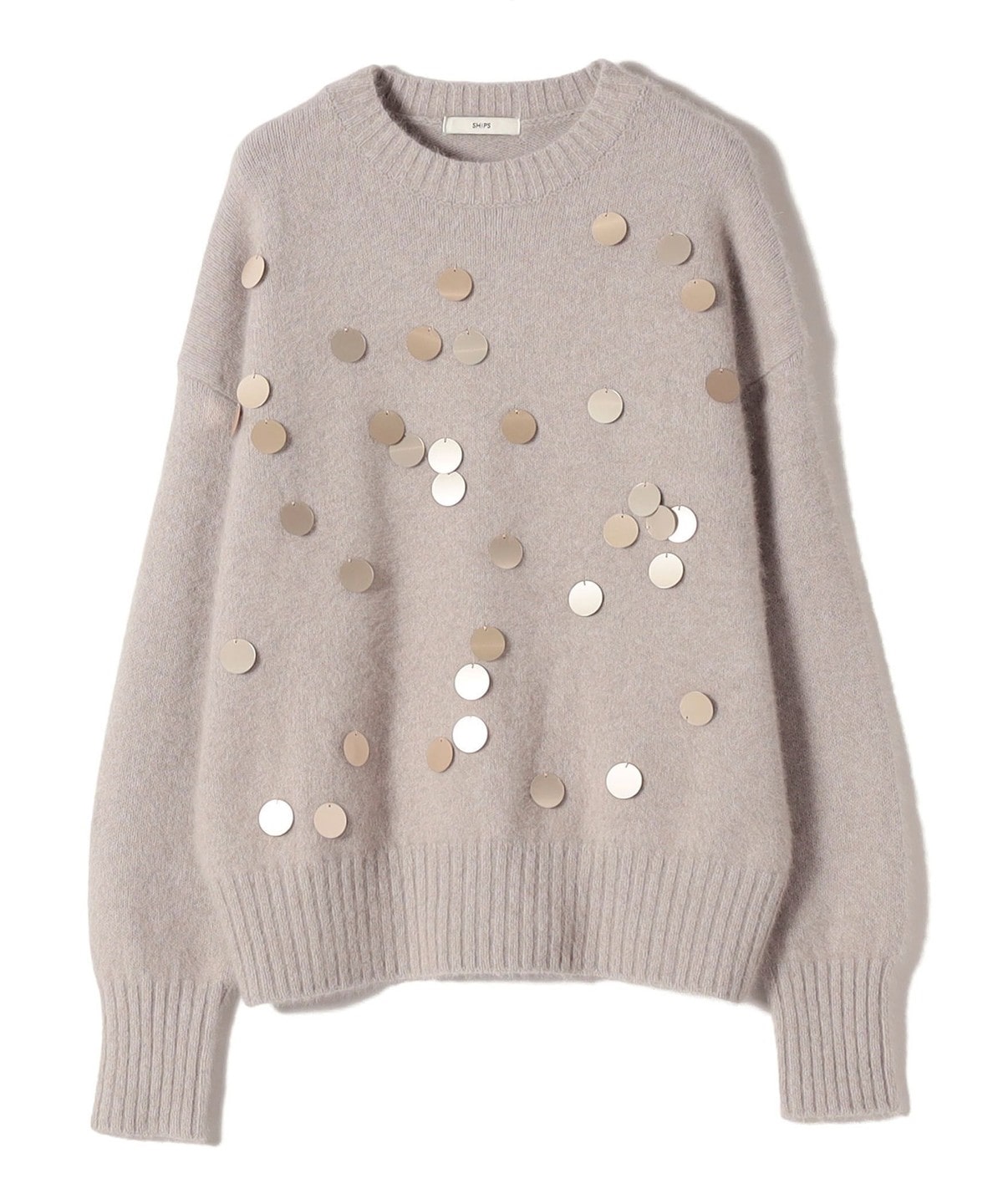 前身頃全体に大きめのスパンコールをランダムに配した、リラックス感のあるニットプルオーバーです。