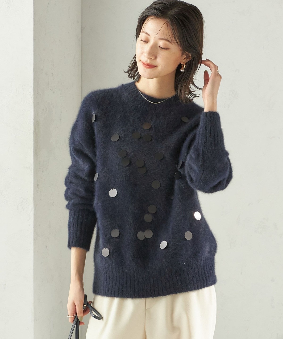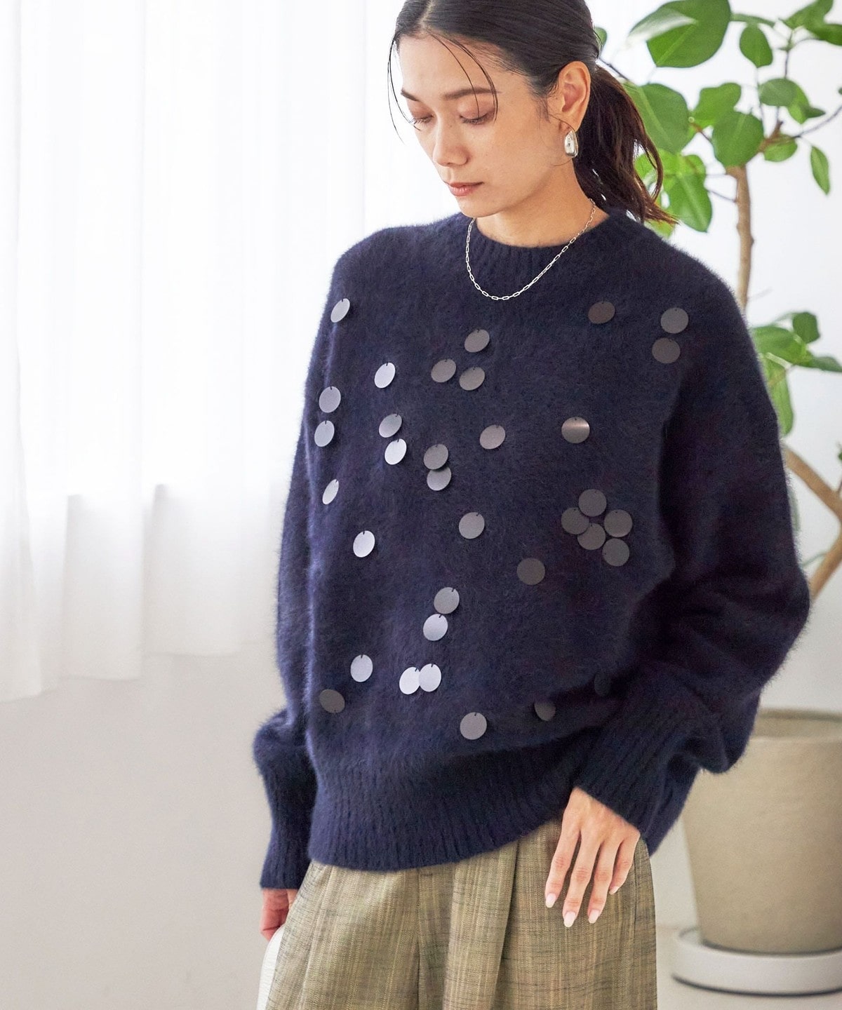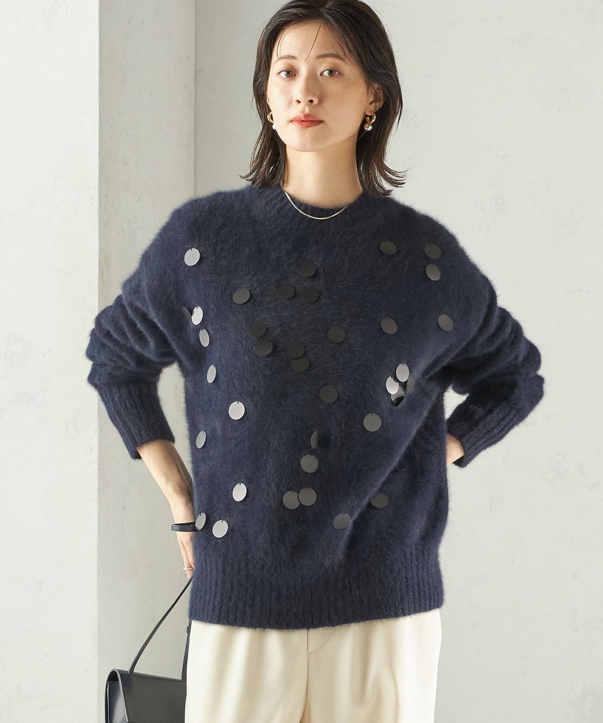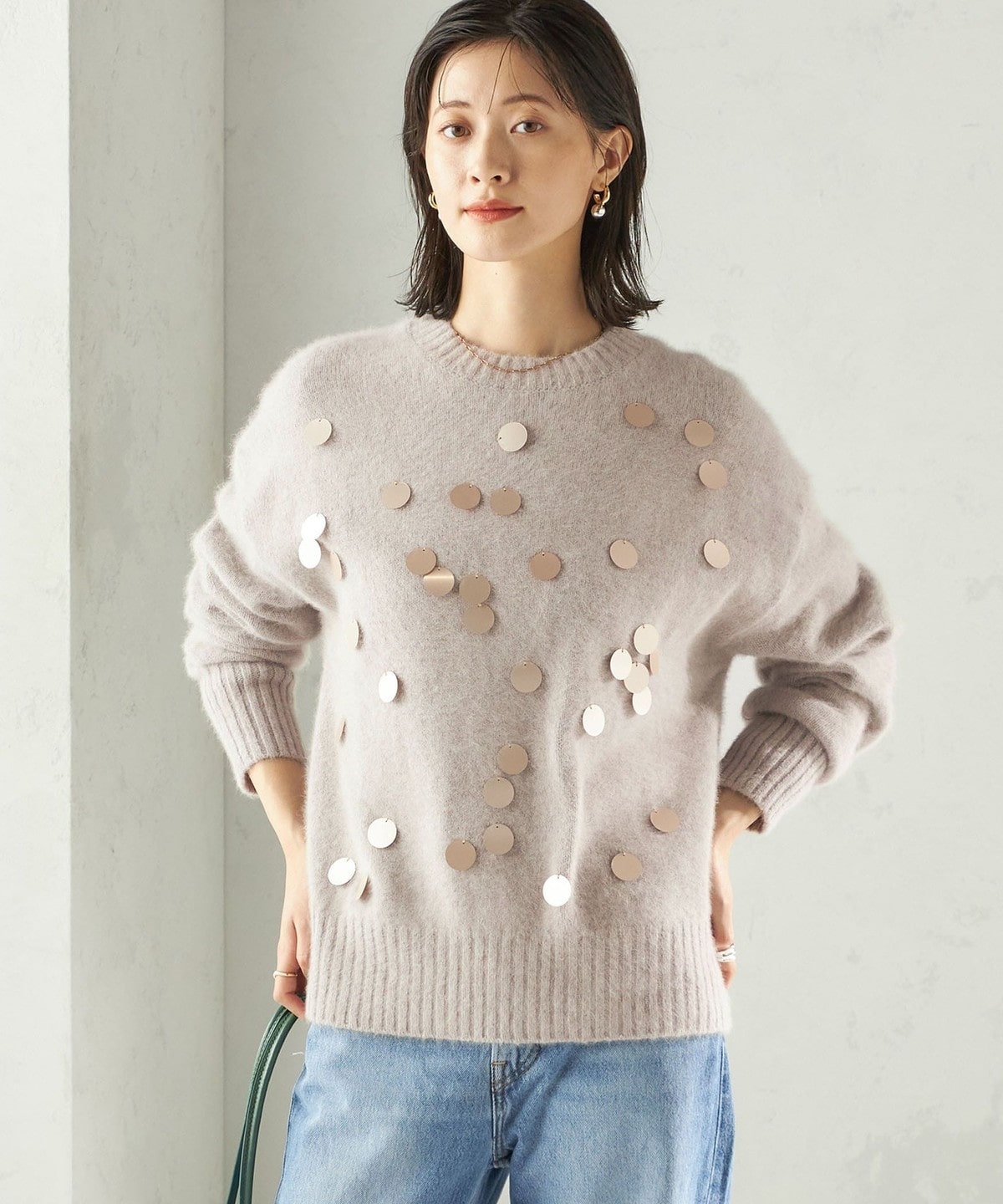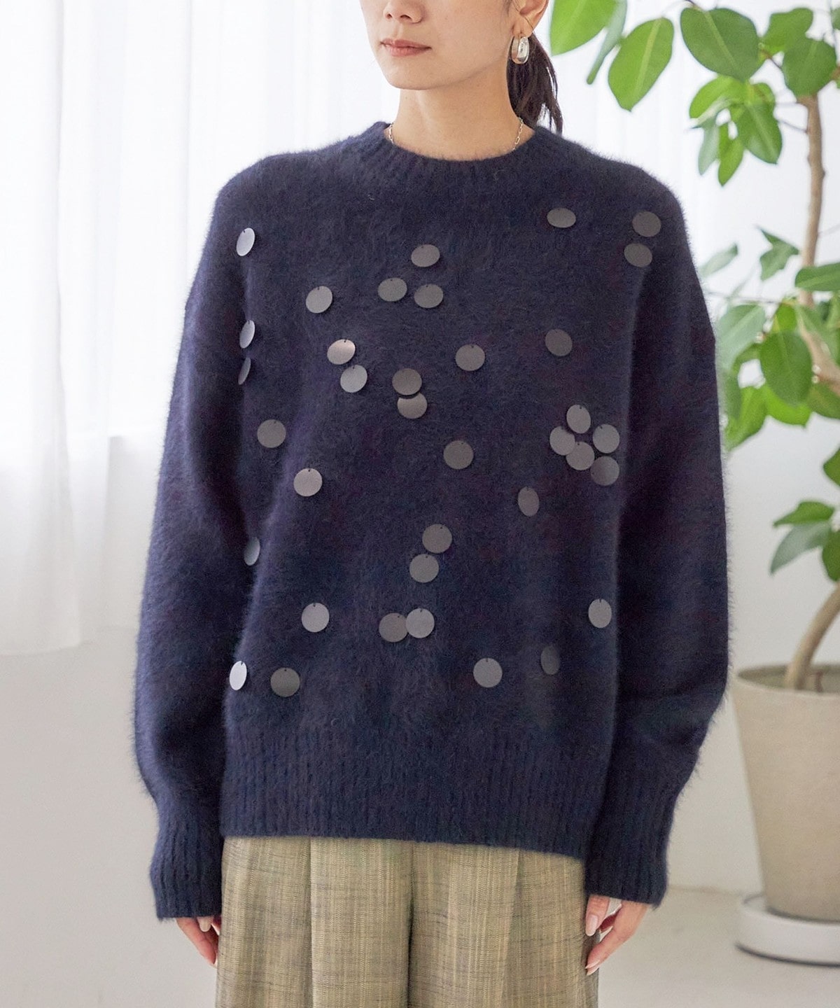前身頃全体に大きめのスパンコールをランダムに配した、リラックス感のあるニットプルオーバーです。