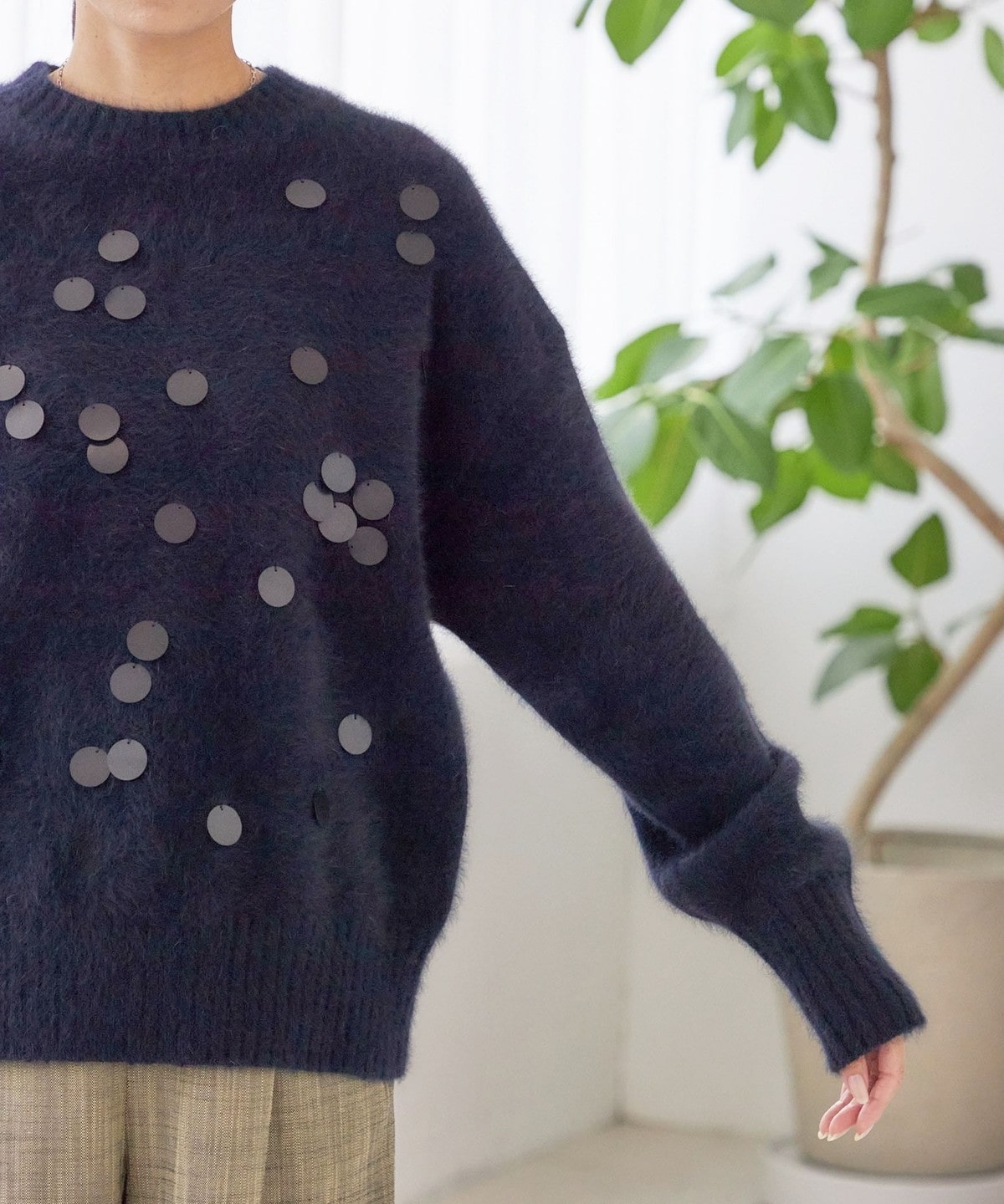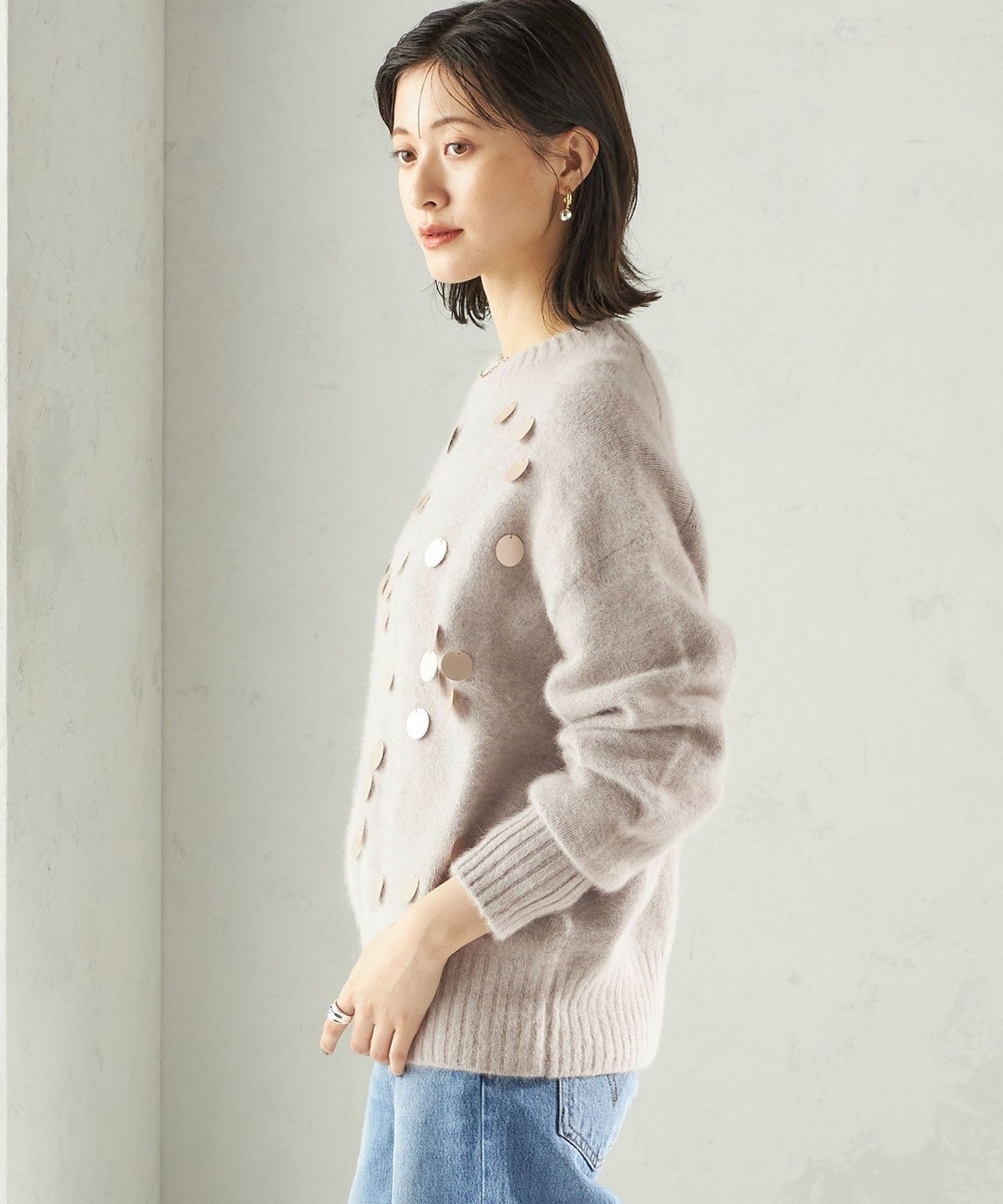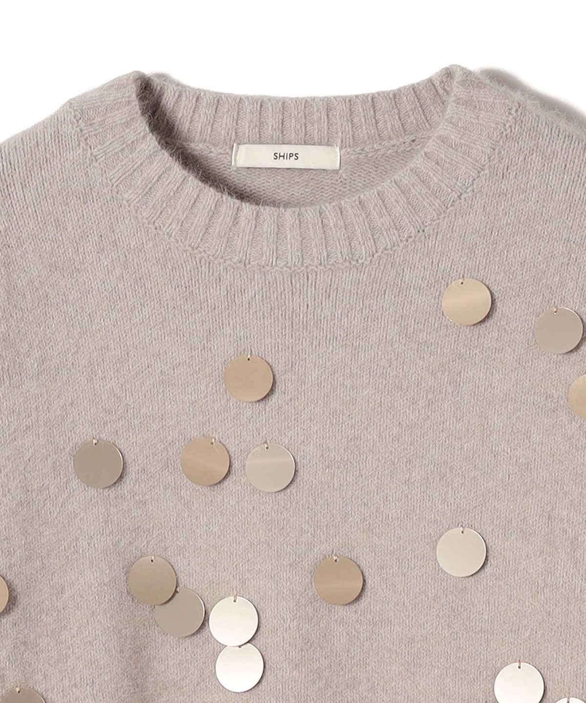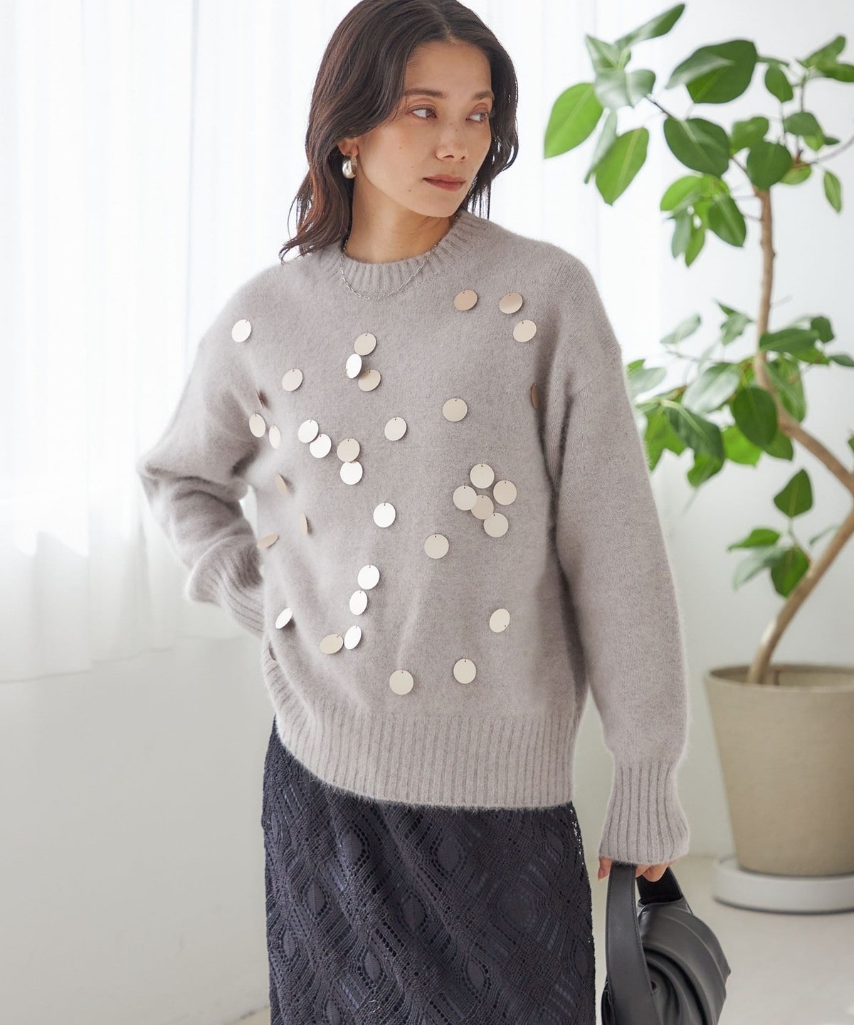 前身頃全体に大きめのスパンコールをランダムに配した、リラックス感のあるニットプルオーバーです。