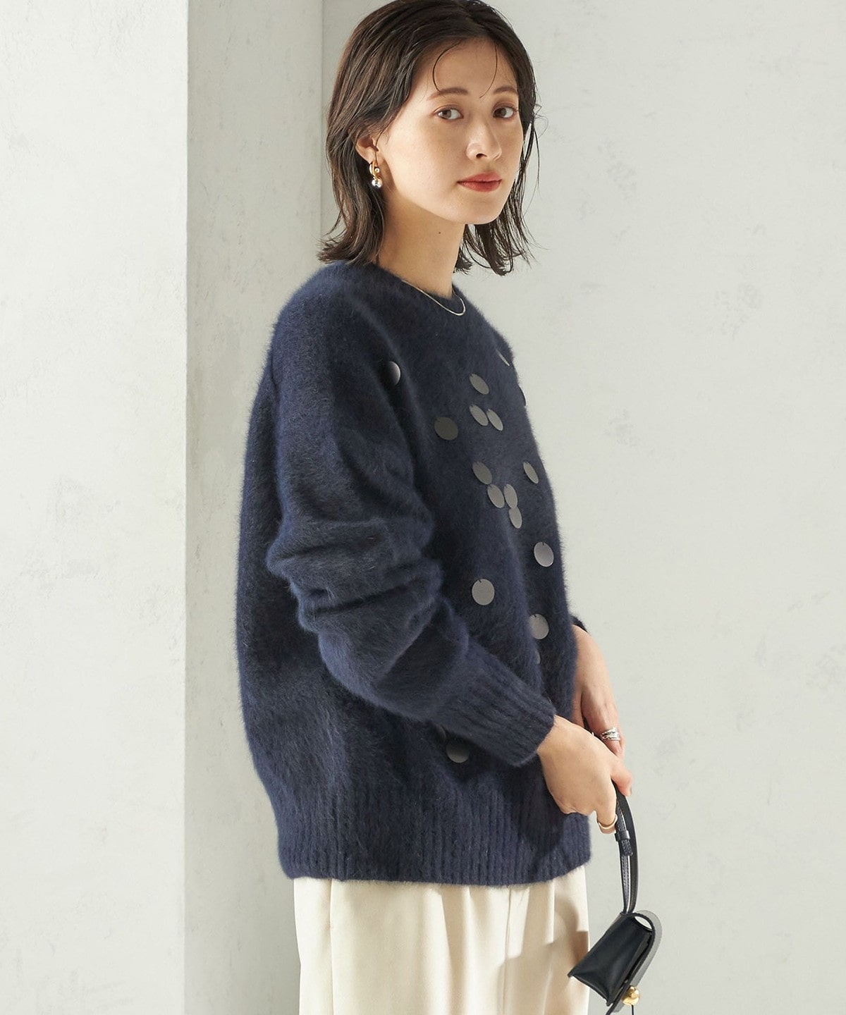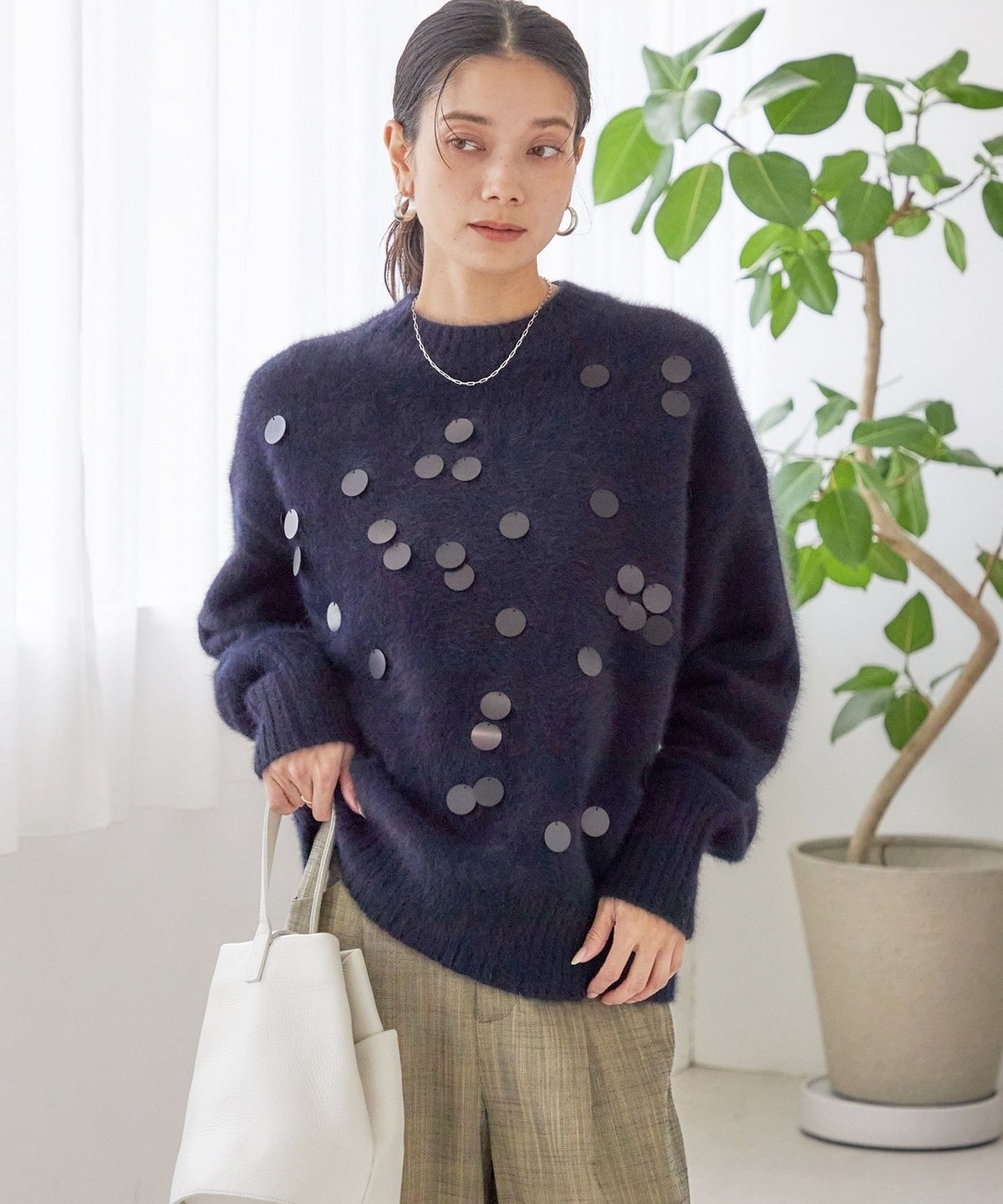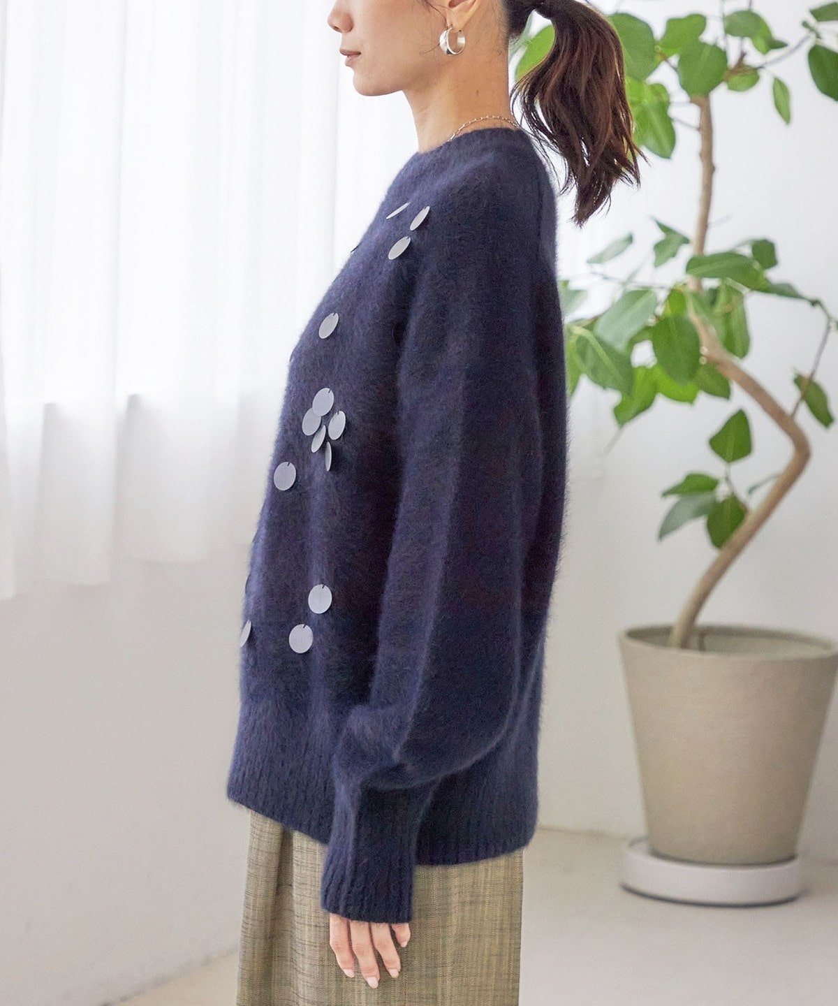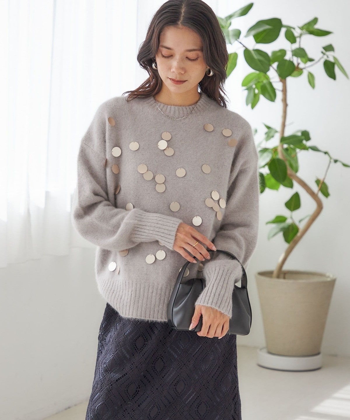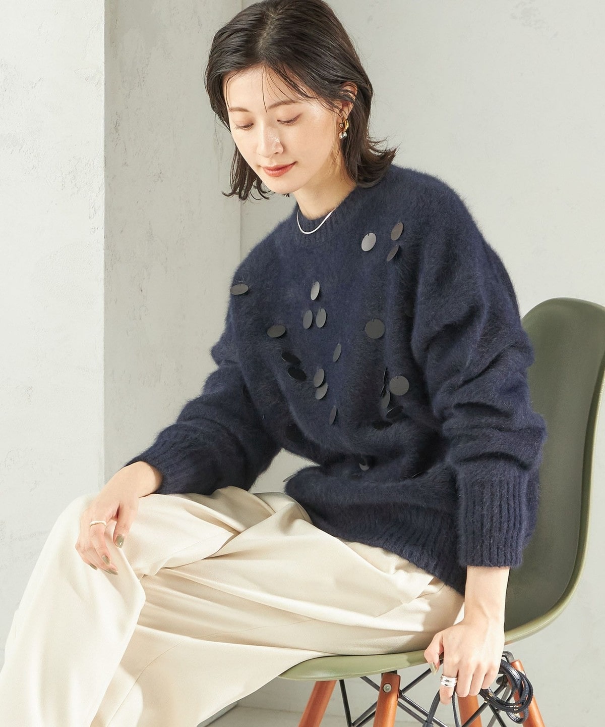 前身頃全体に大きめのスパンコールをランダムに配した、リラックス感のあるニットプルオーバーです。