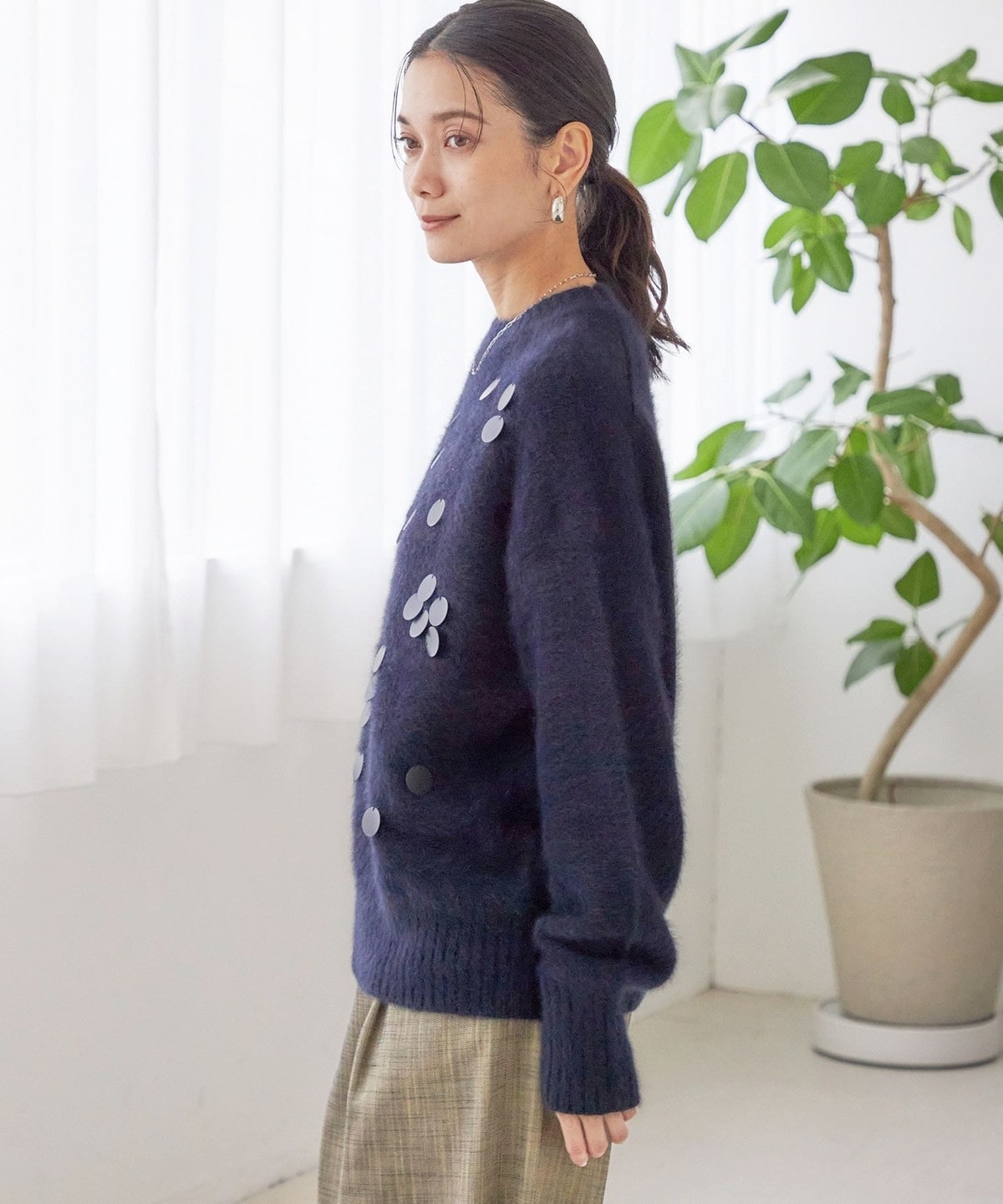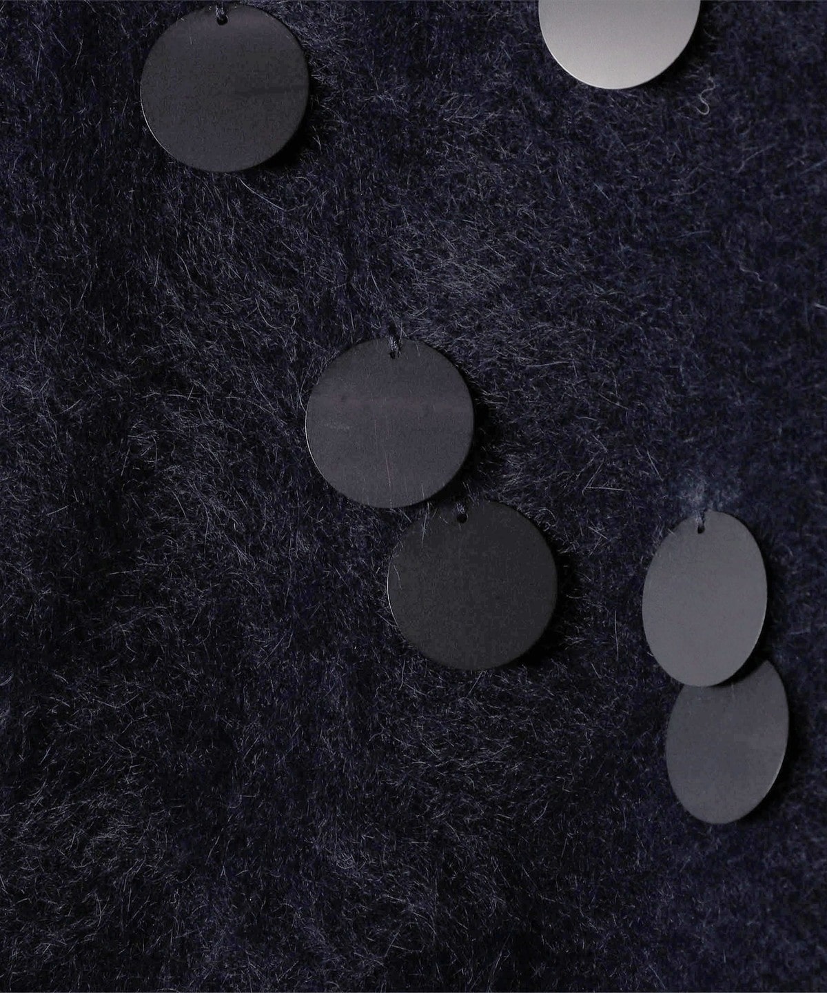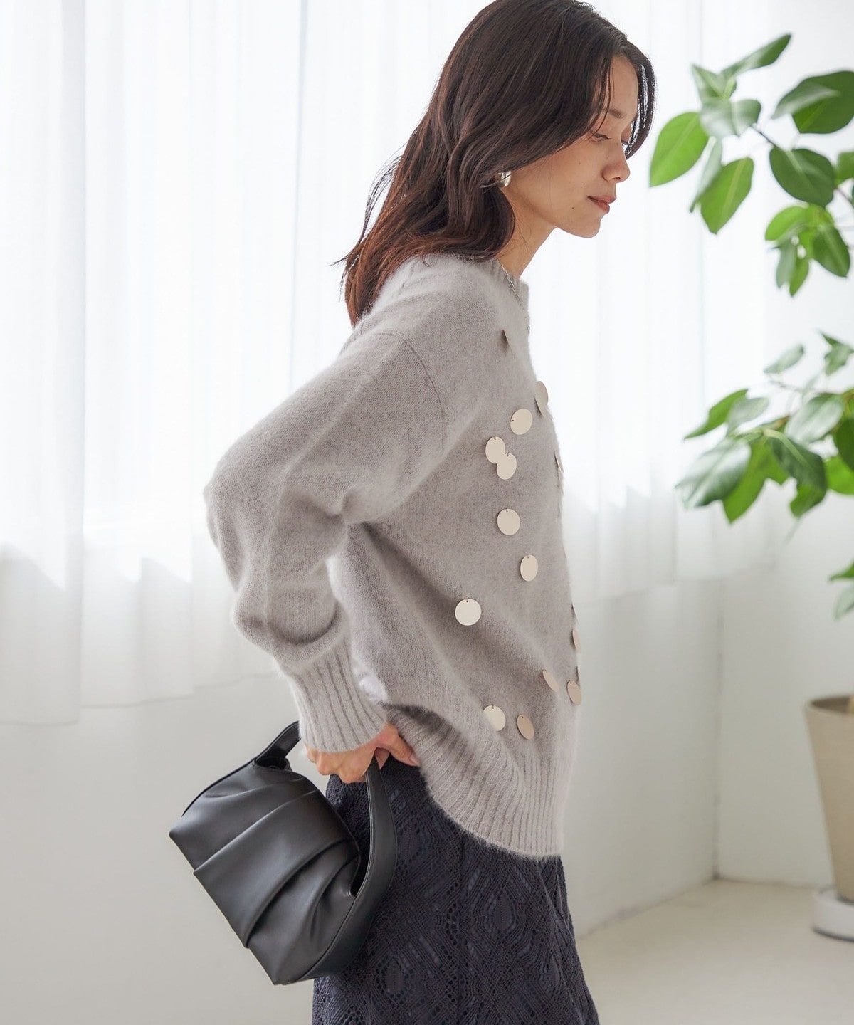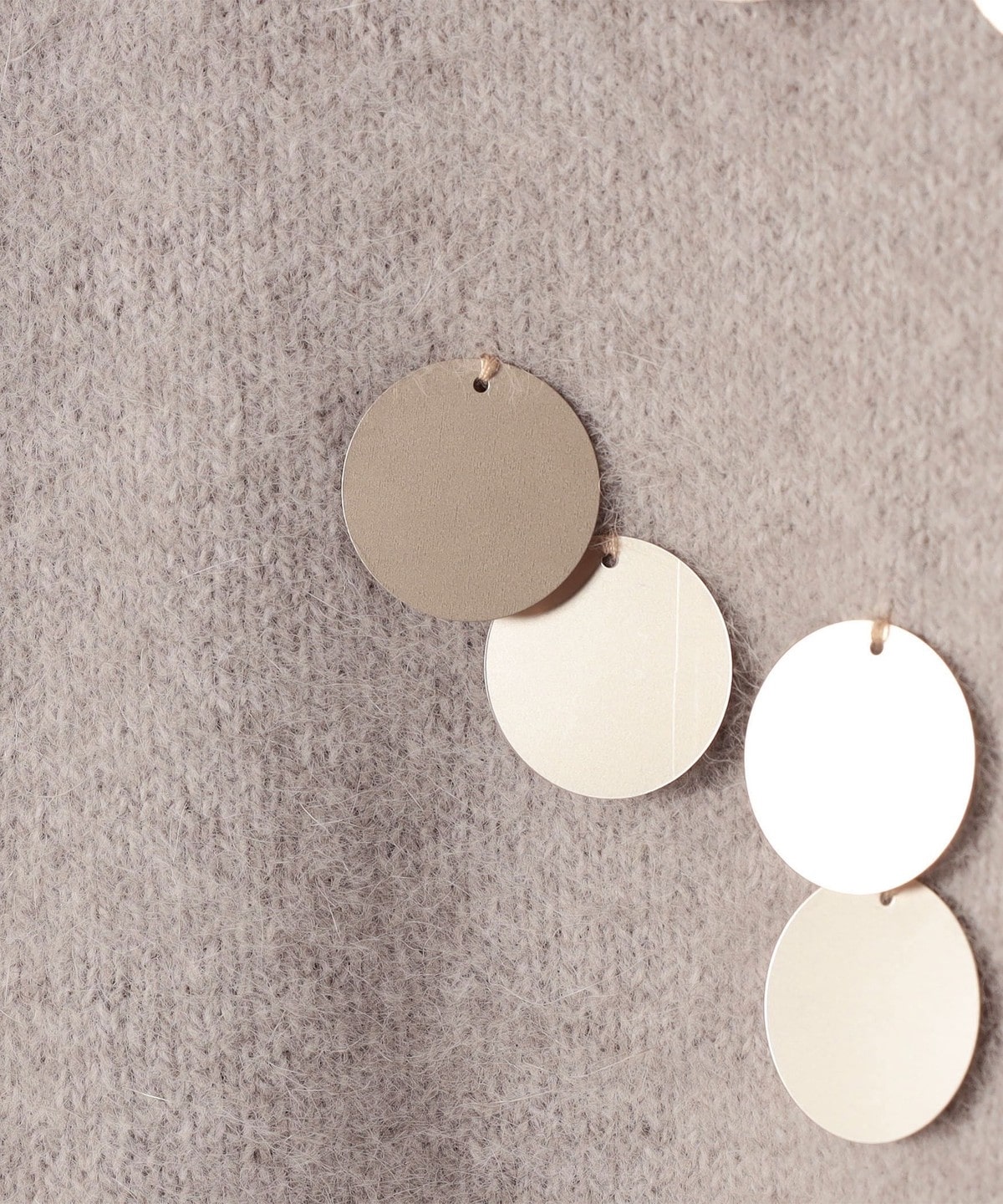前身頃全体に大きめのスパンコールをランダムに配した、リラックス感のあるニットプルオーバーです。