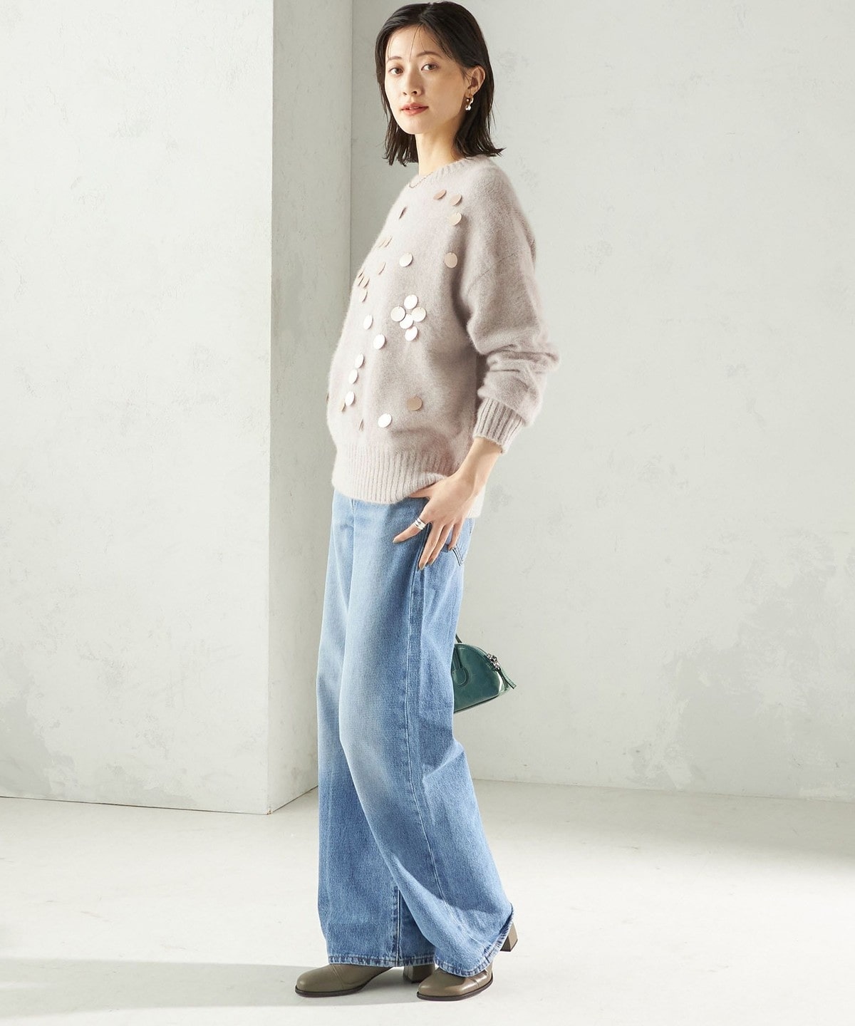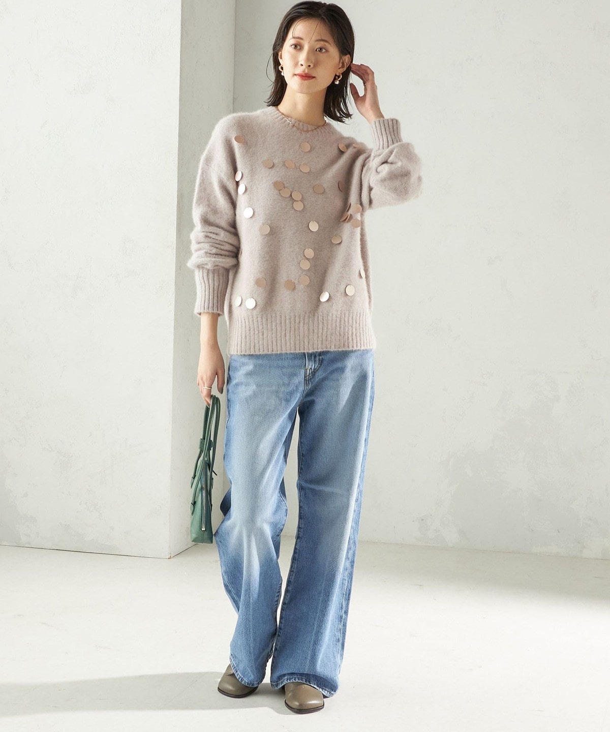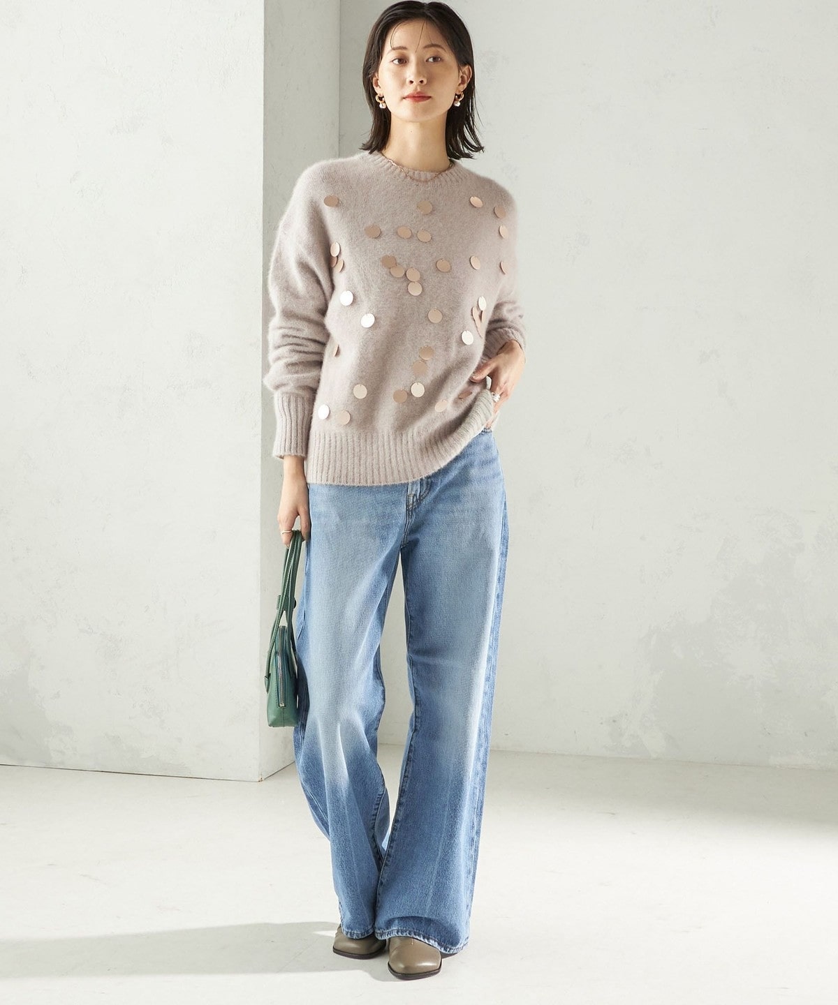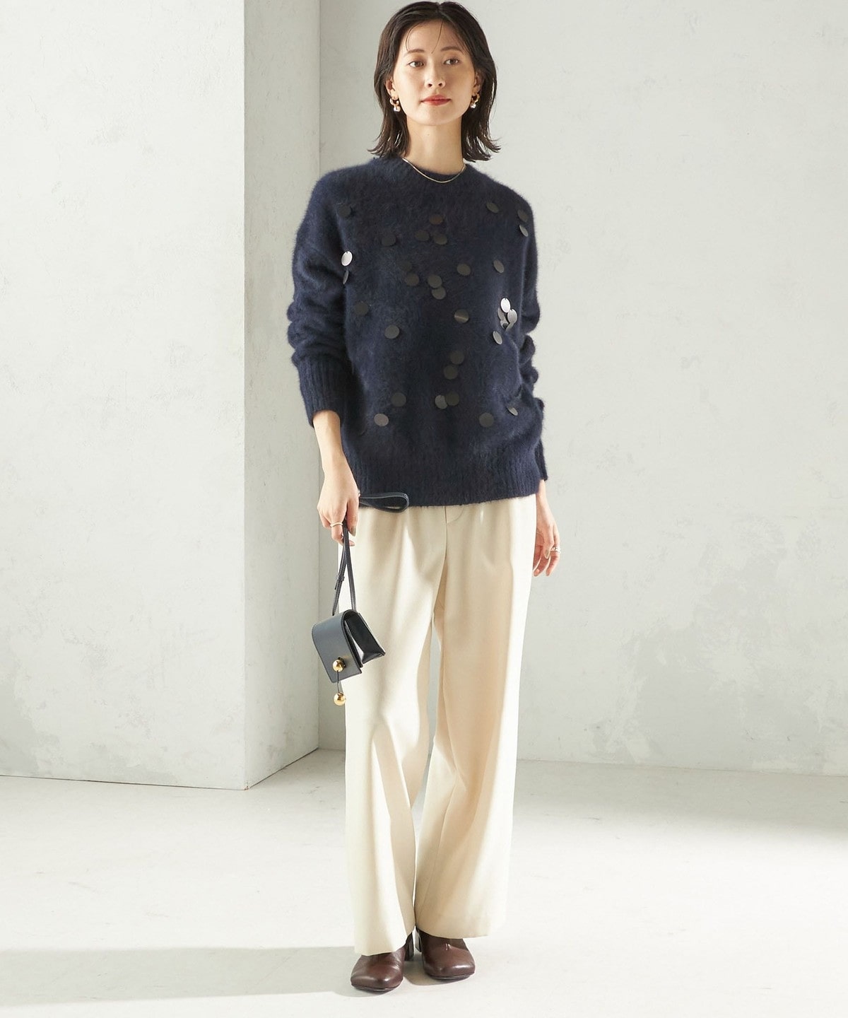 華やかさがありつつ、ランダムなスパンコールとサイズ感で程よくカジュアルダウンし、普段使いにおすすめです。