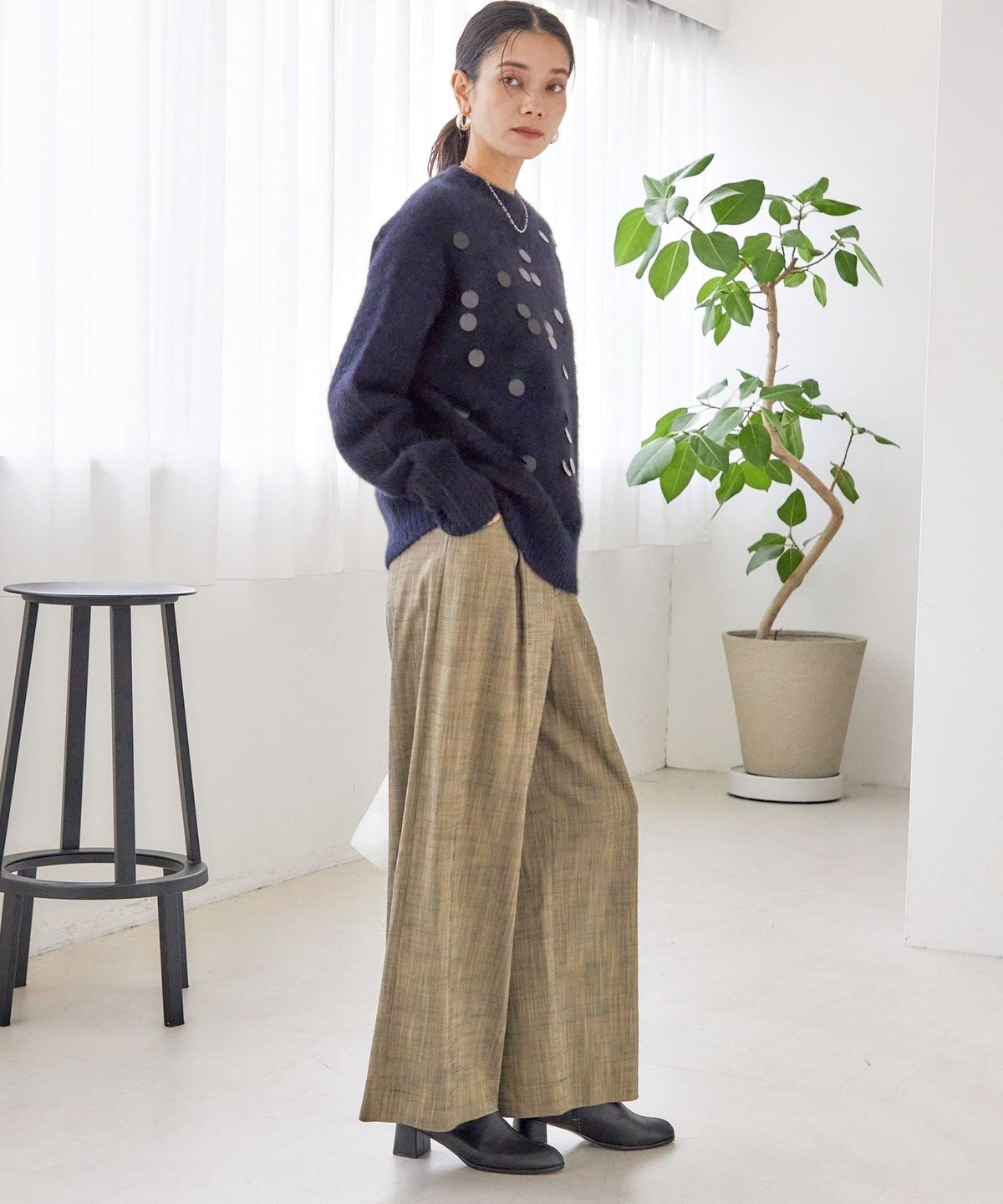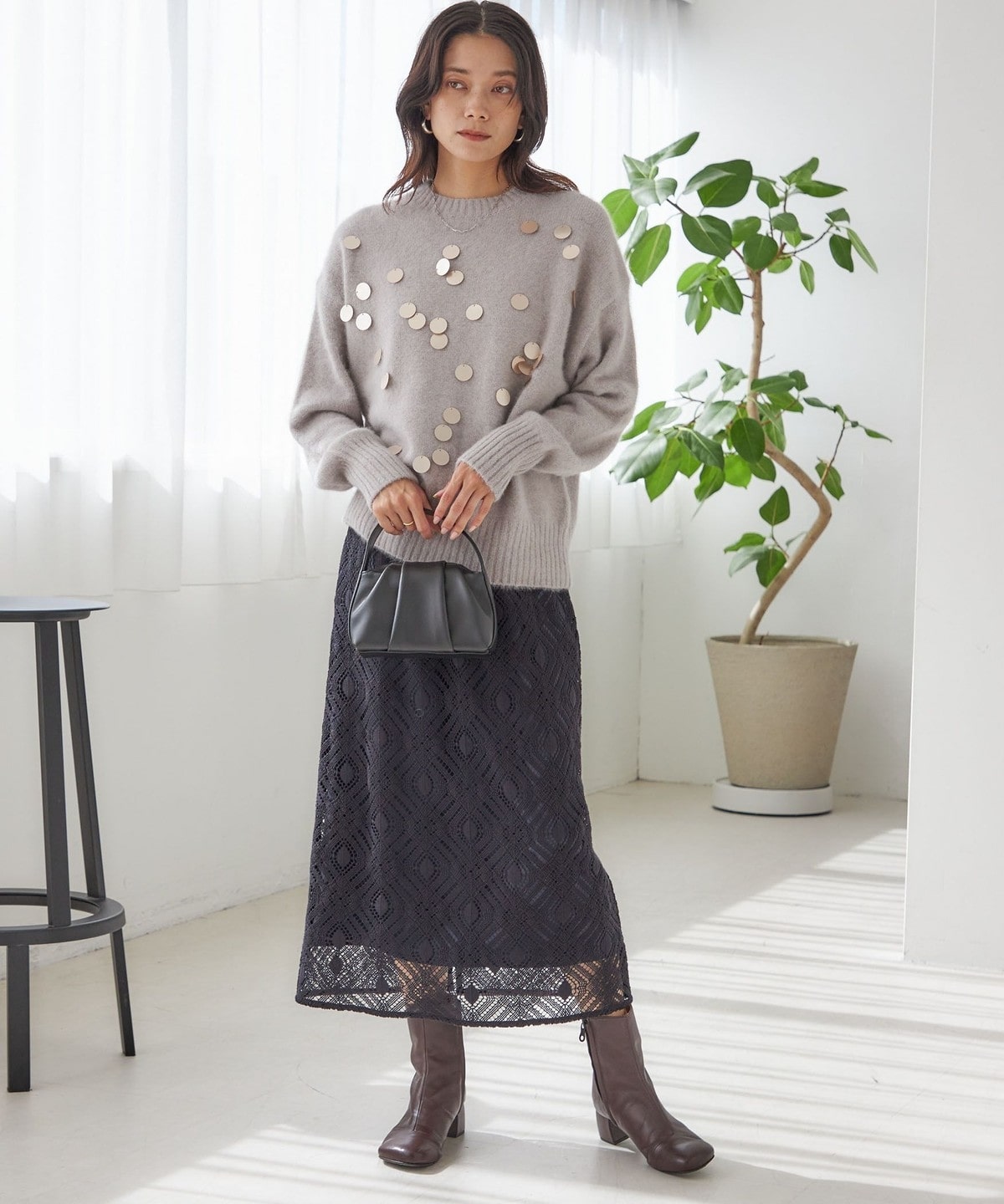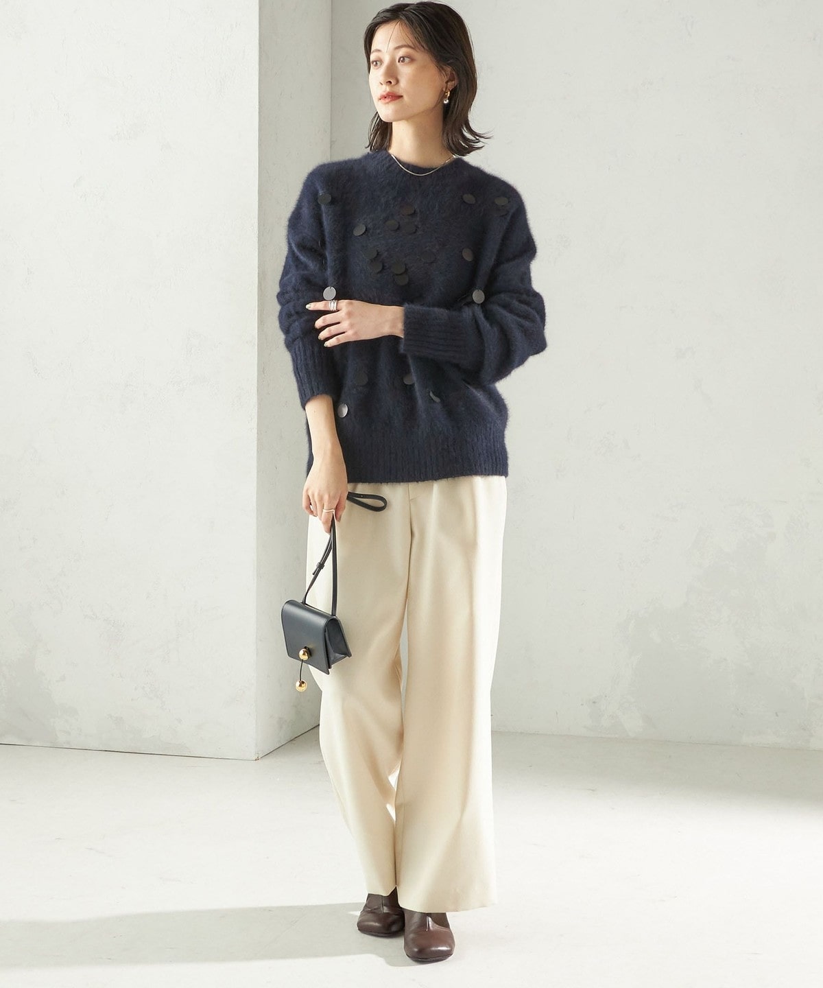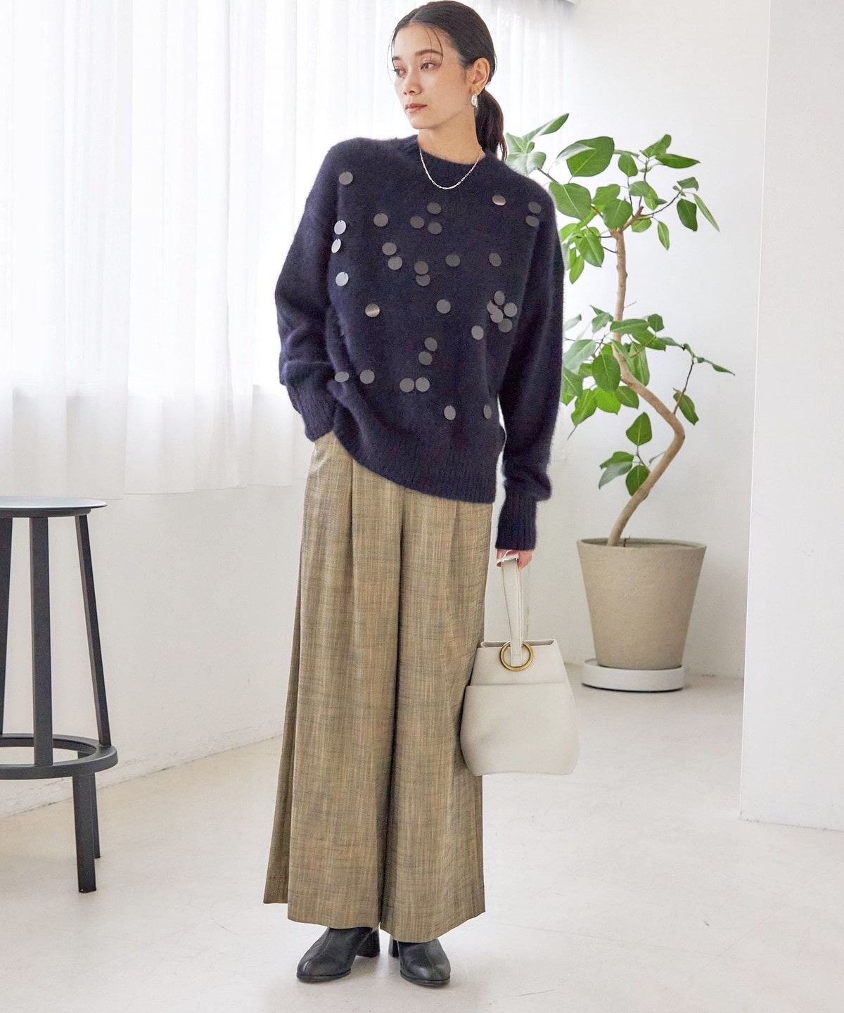 華やかさがありつつ、ランダムなスパンコールとサイズ感で程よくカジュアルダウンし、普段使いにおすすめです。