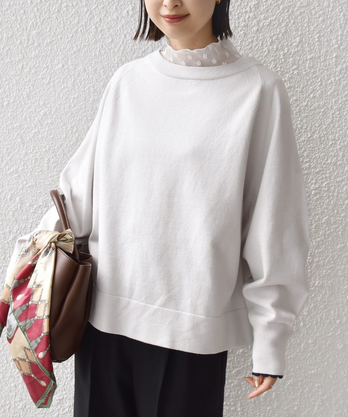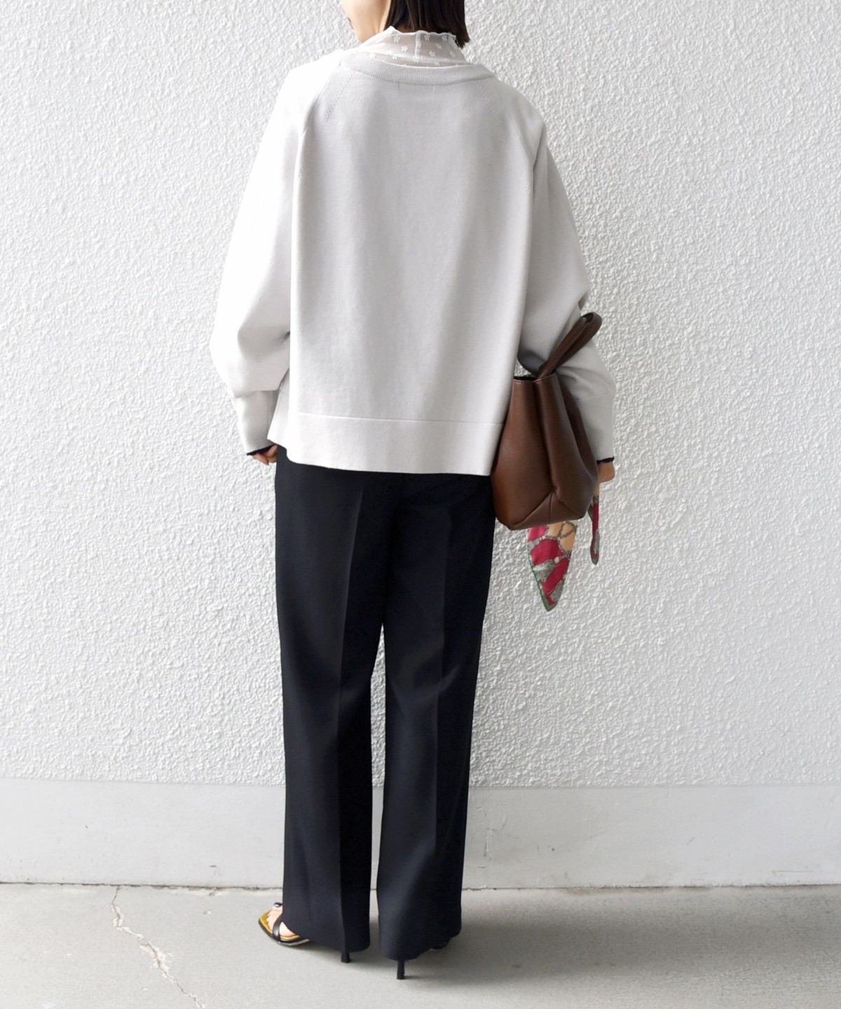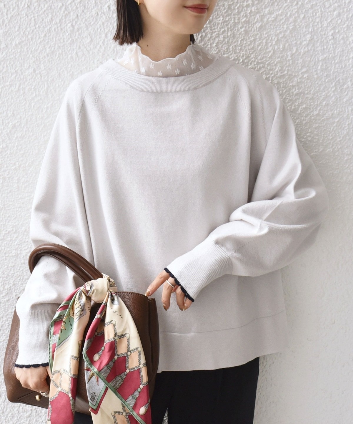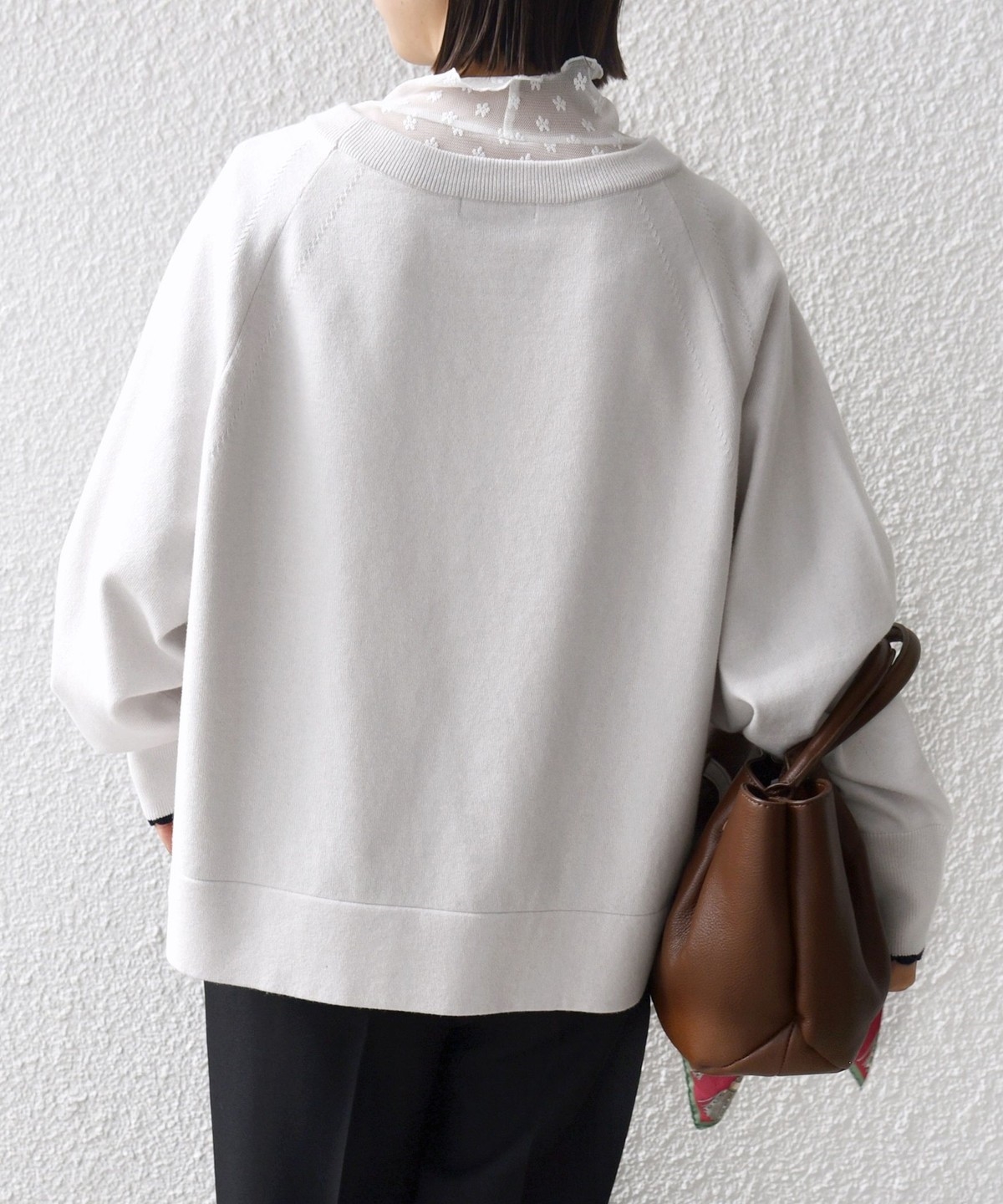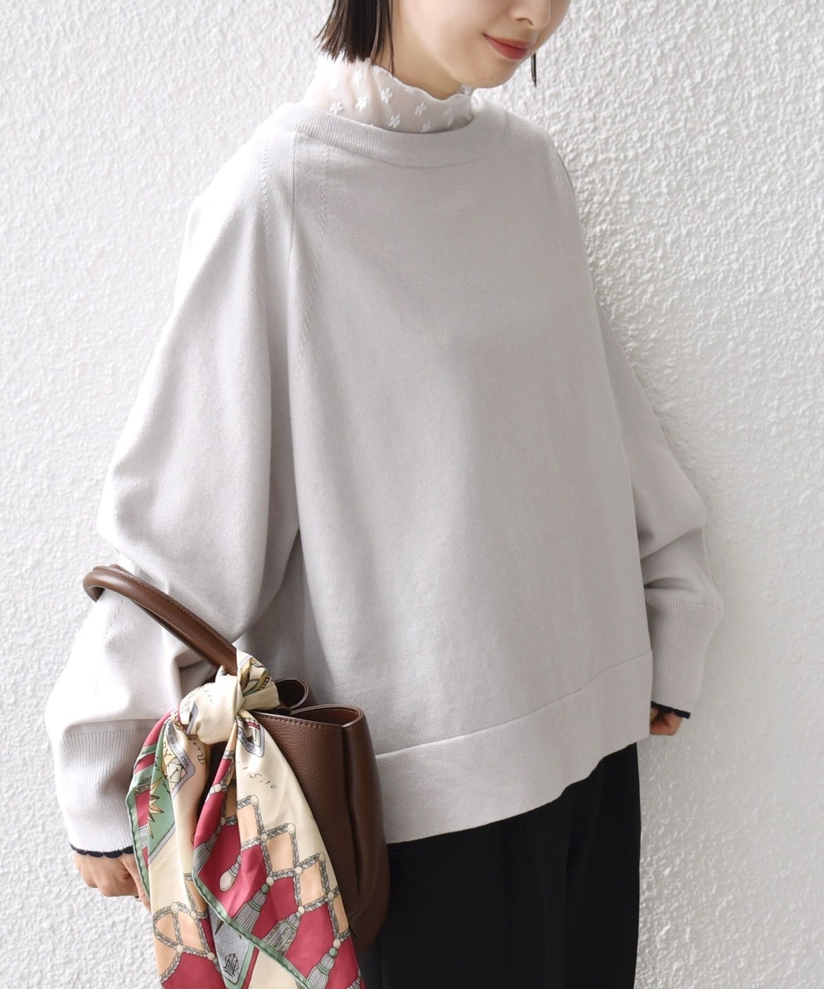 コンパクト目のサイズなので、ボトムはボリュームのあるスカートやパンツ合わせで大人なリラックス感のある着こなしが◎