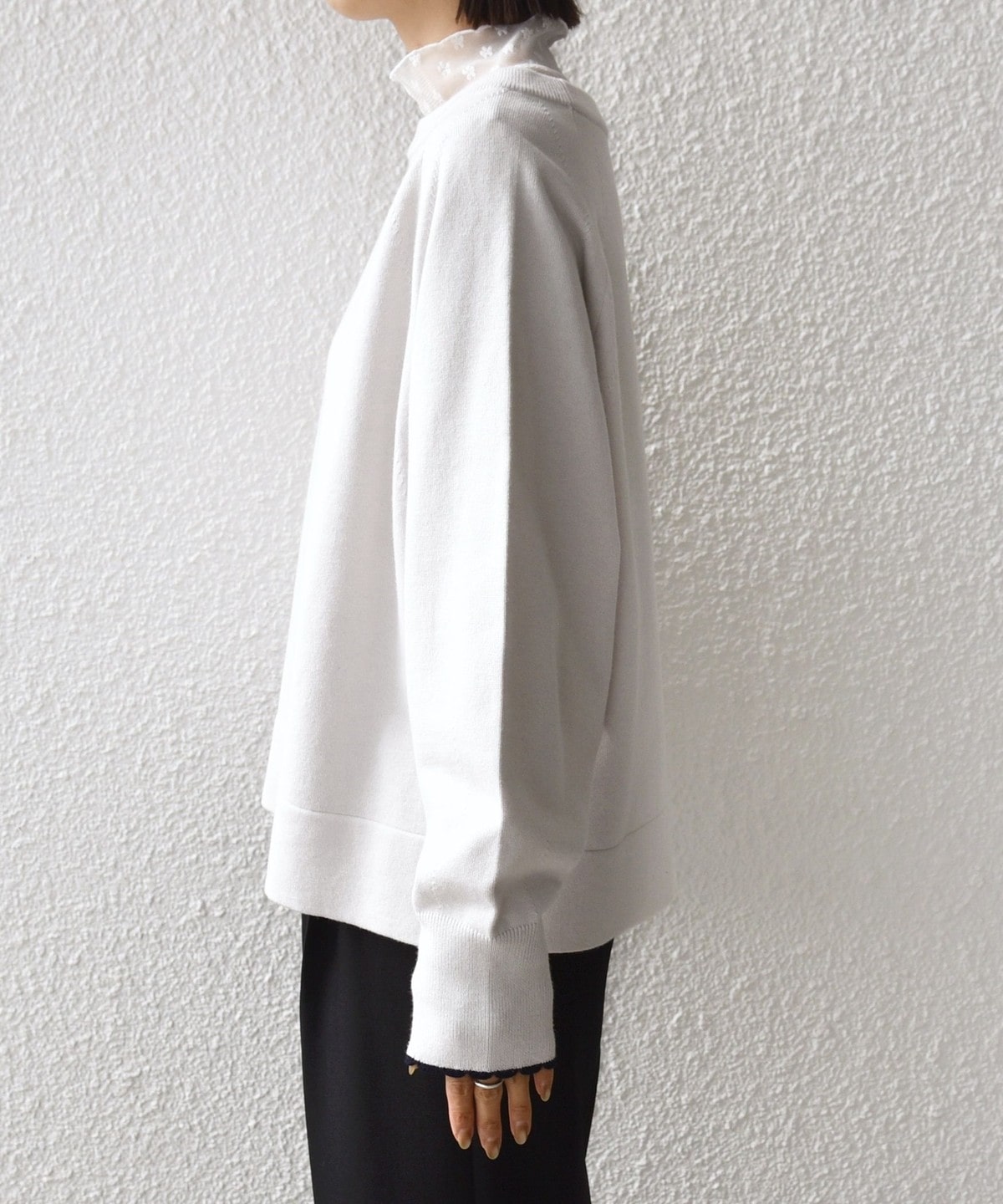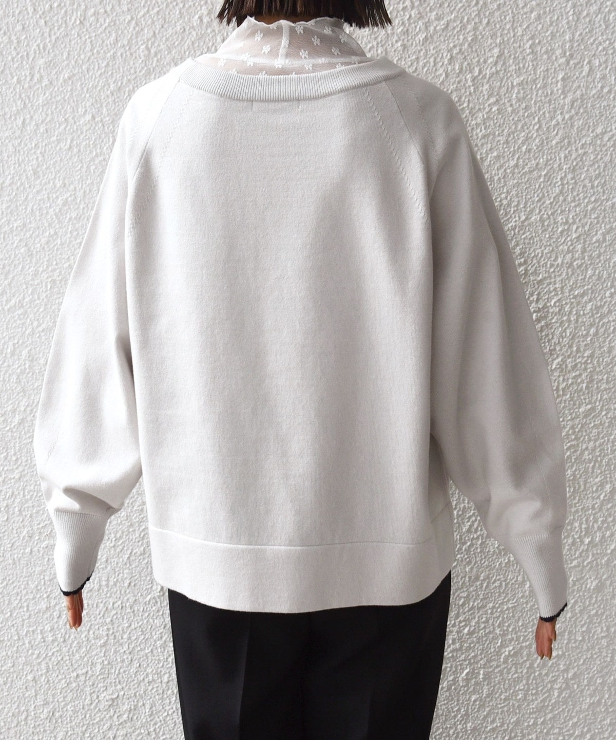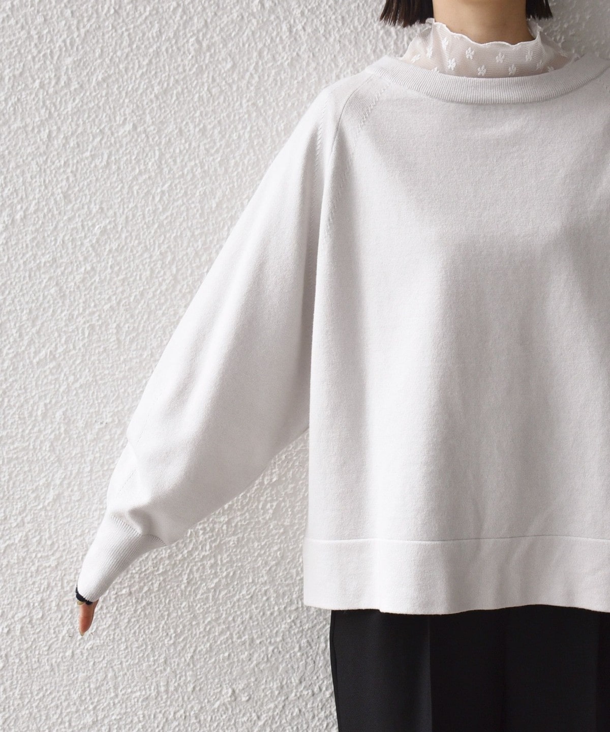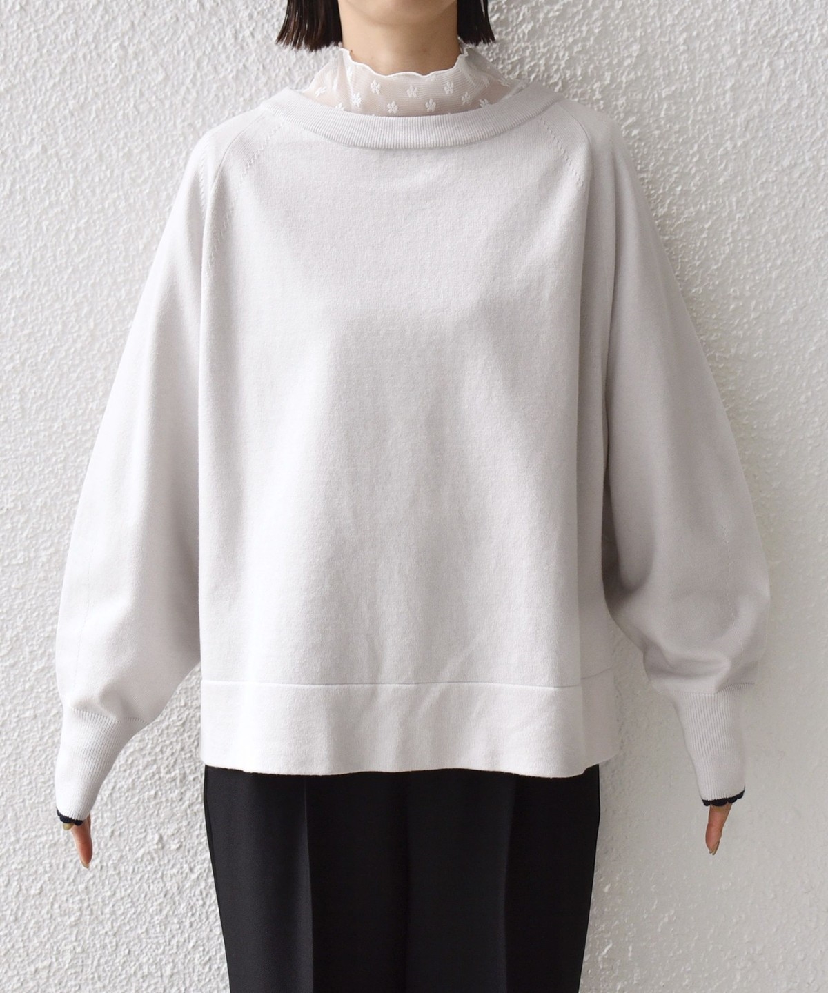 袖口がスカラップ編みになっており、トレンドのロマンティックテイストをさりげなく取り入れたデザインです。