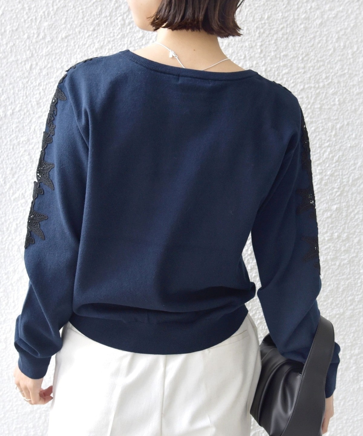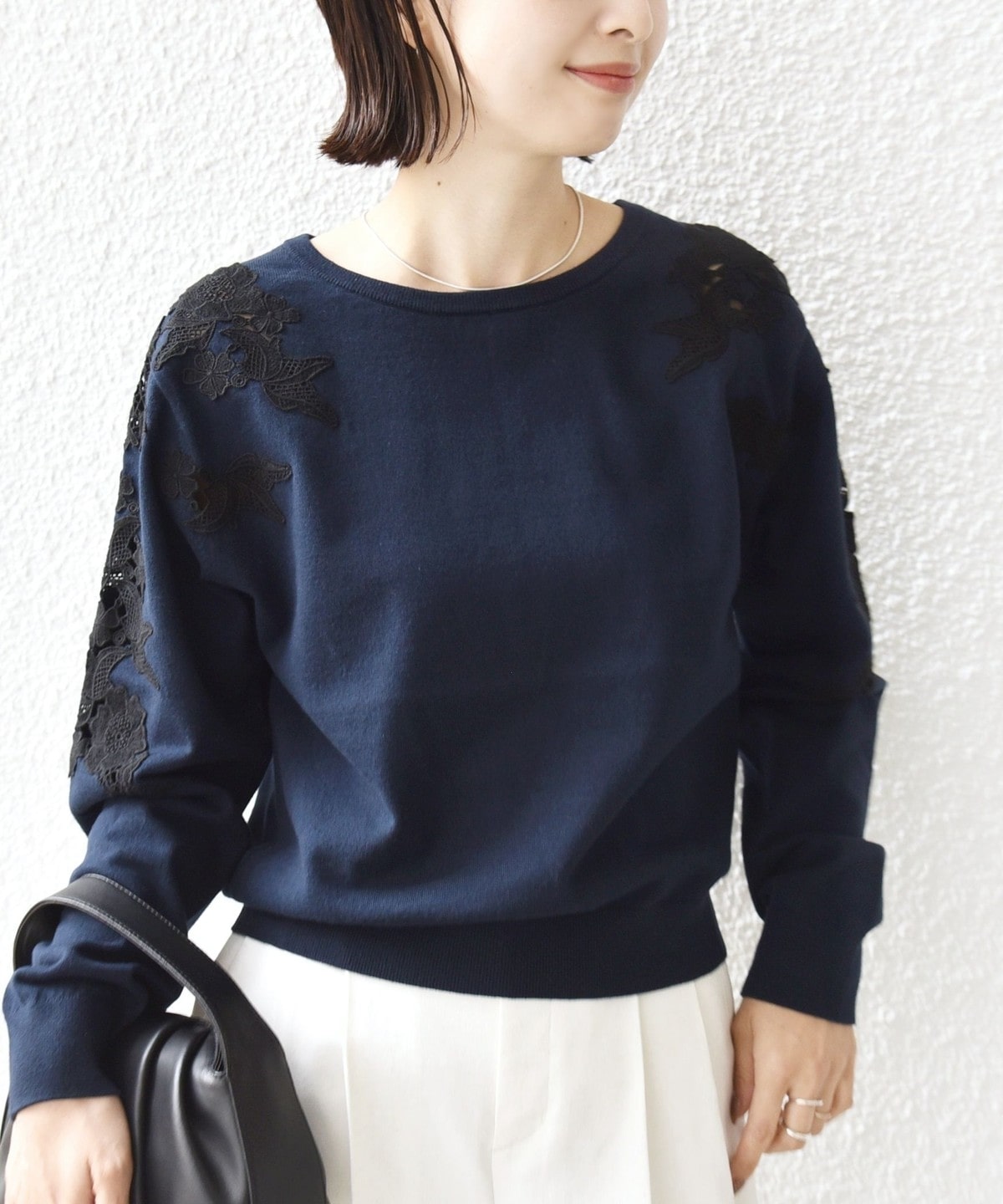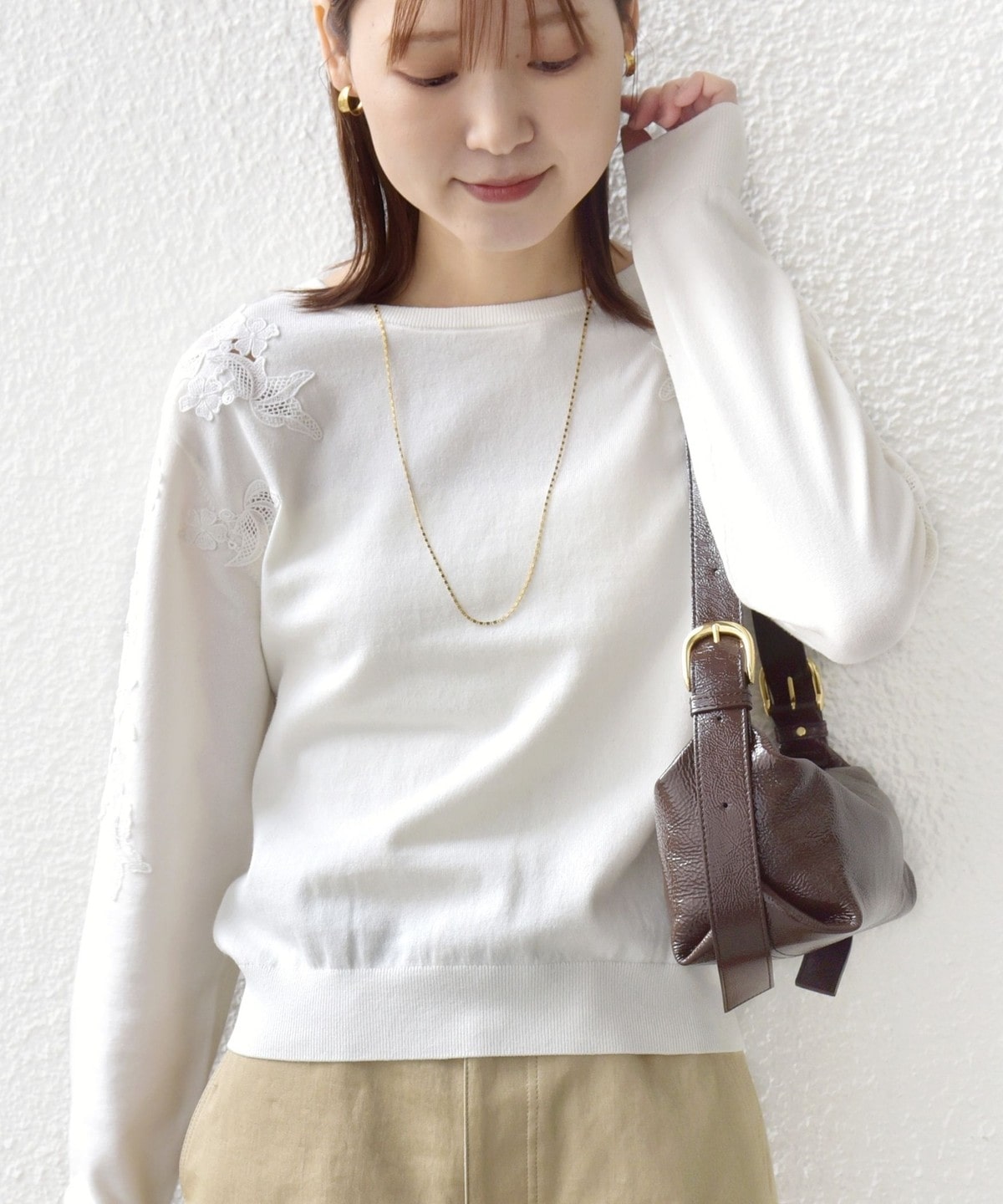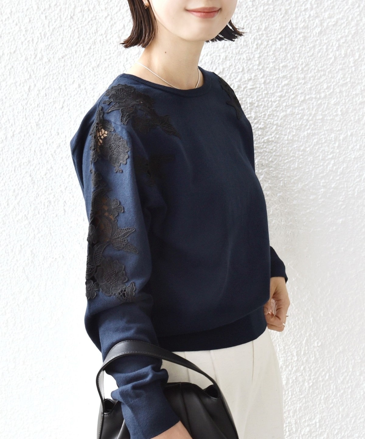 肩から二の腕に掛かるレースが春らしいニットプルオーバー。