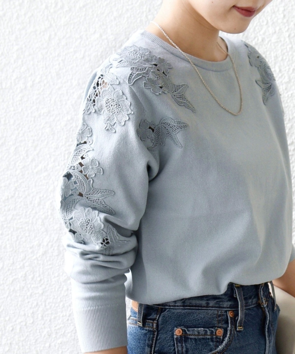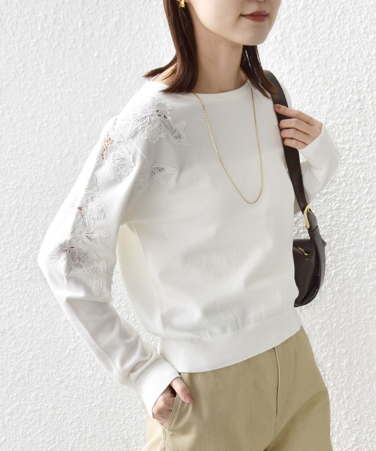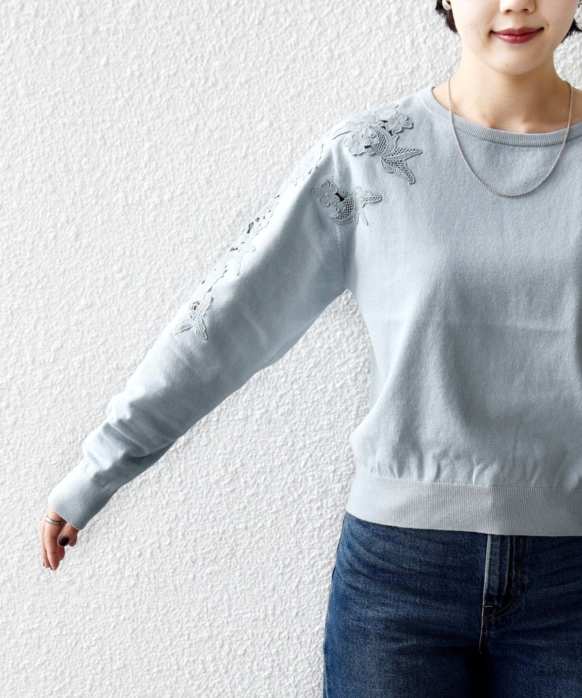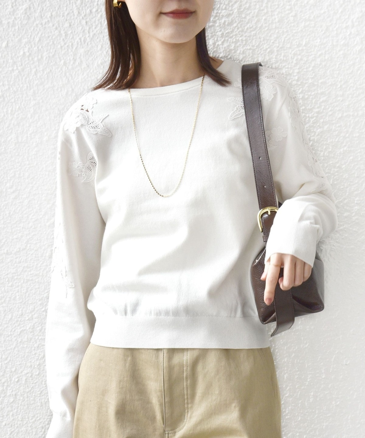 肩から二の腕に掛かるレースが春らしいニットプルオーバー。