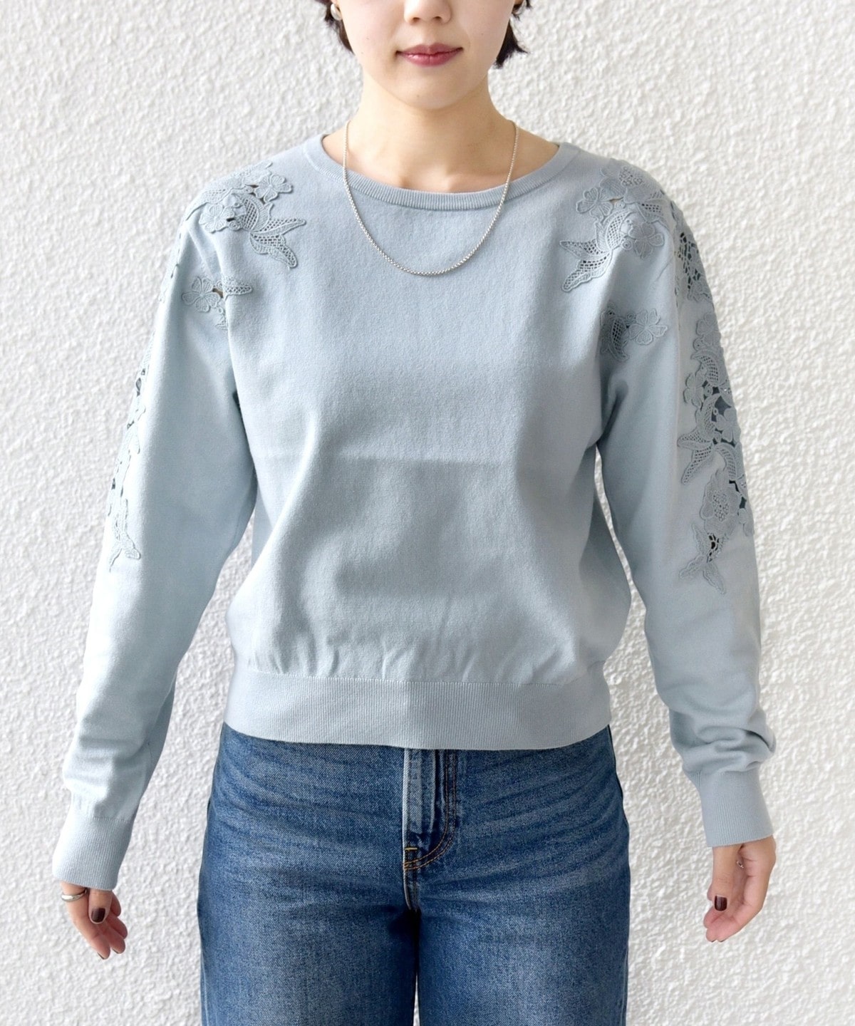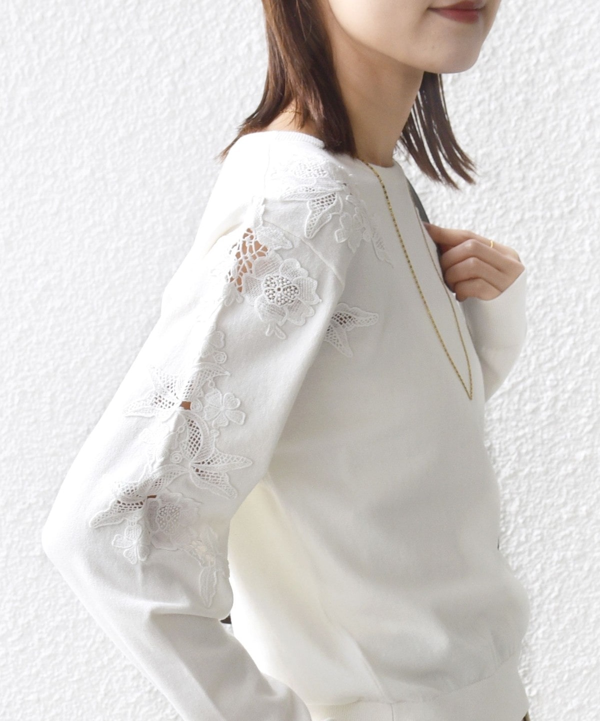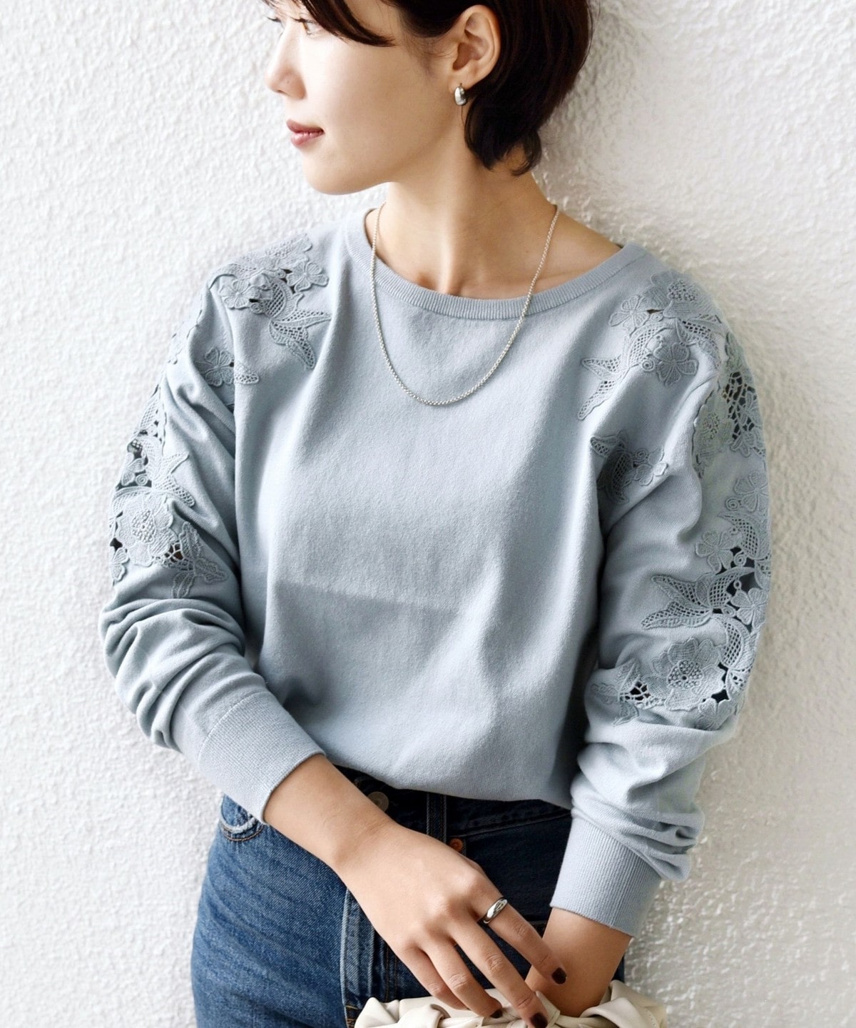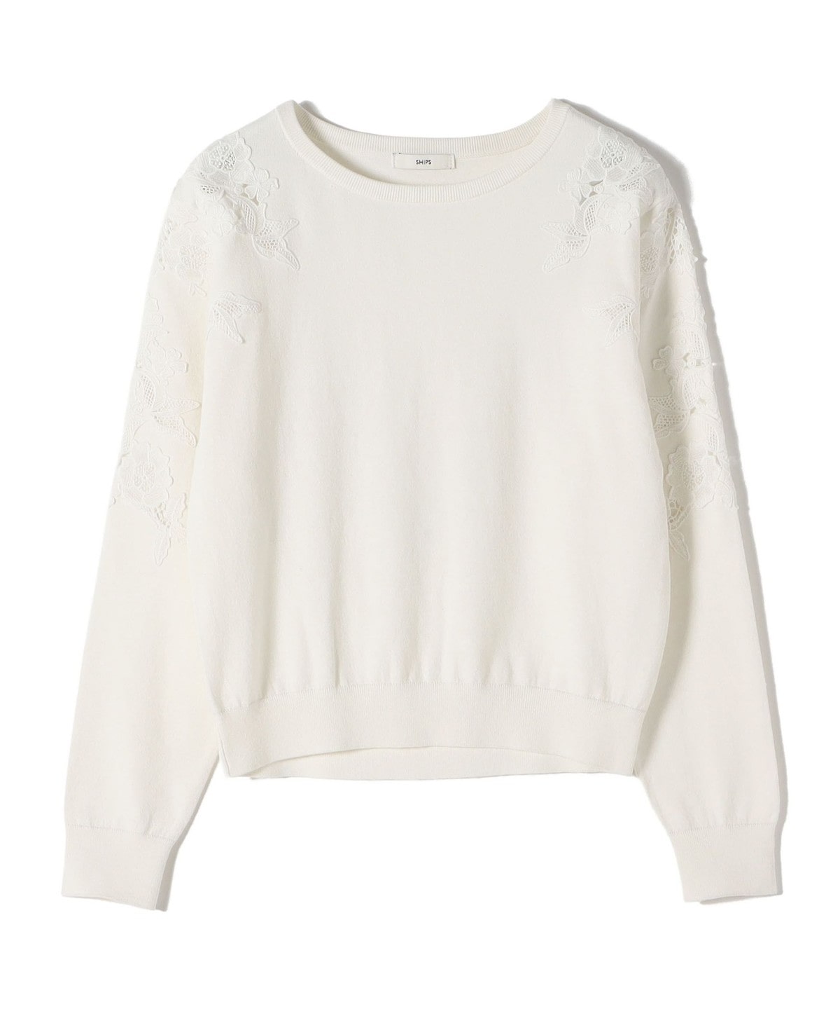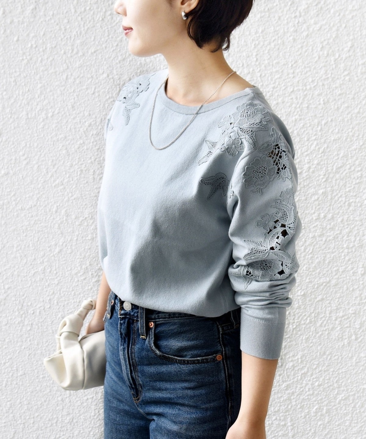 肩から二の腕に掛かるレースが春らしいニットプルオーバー。