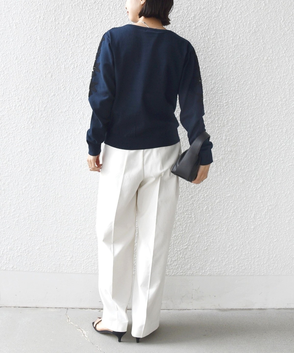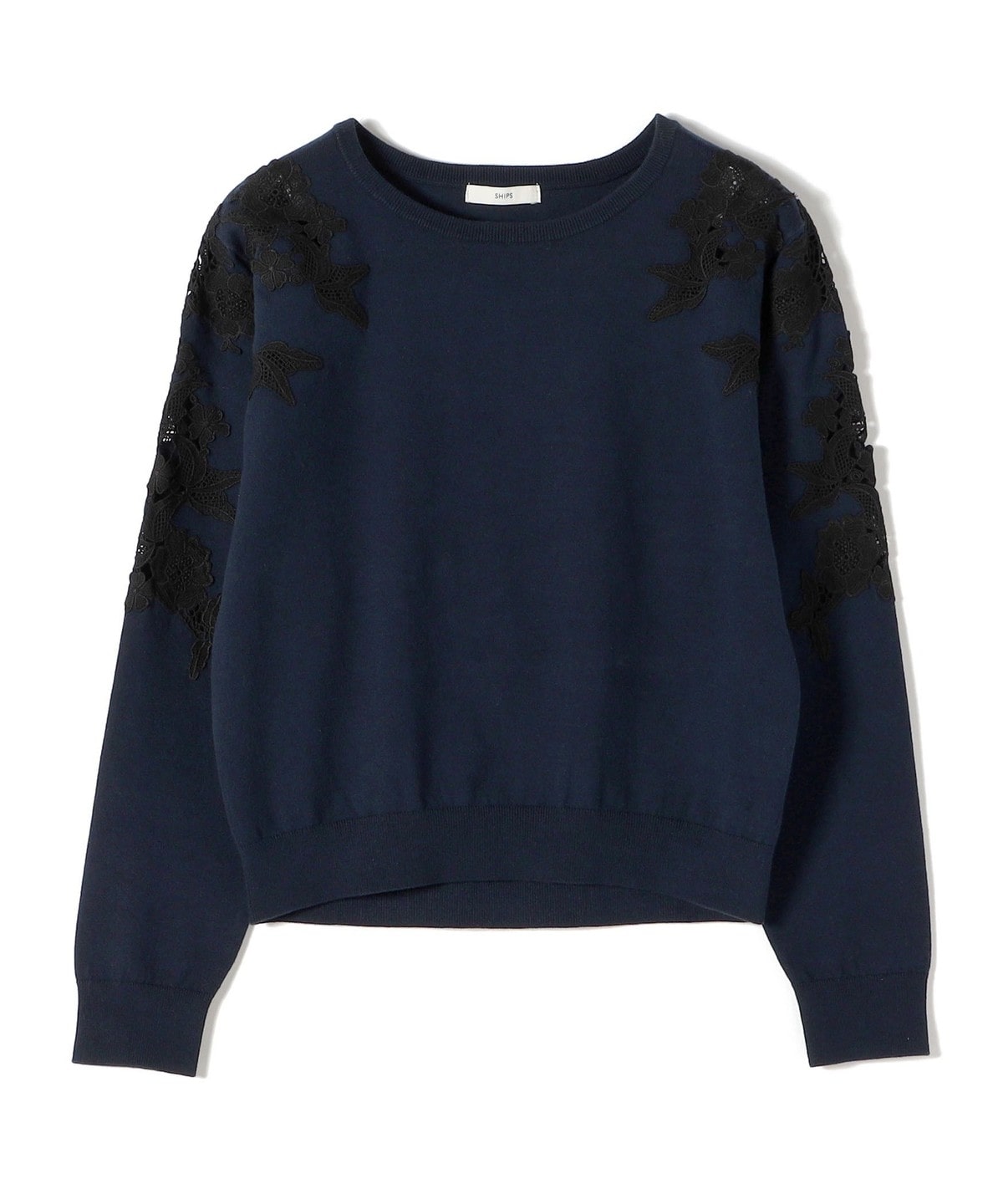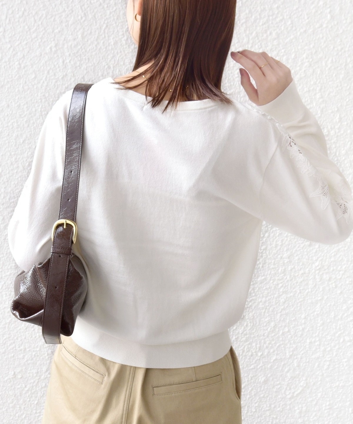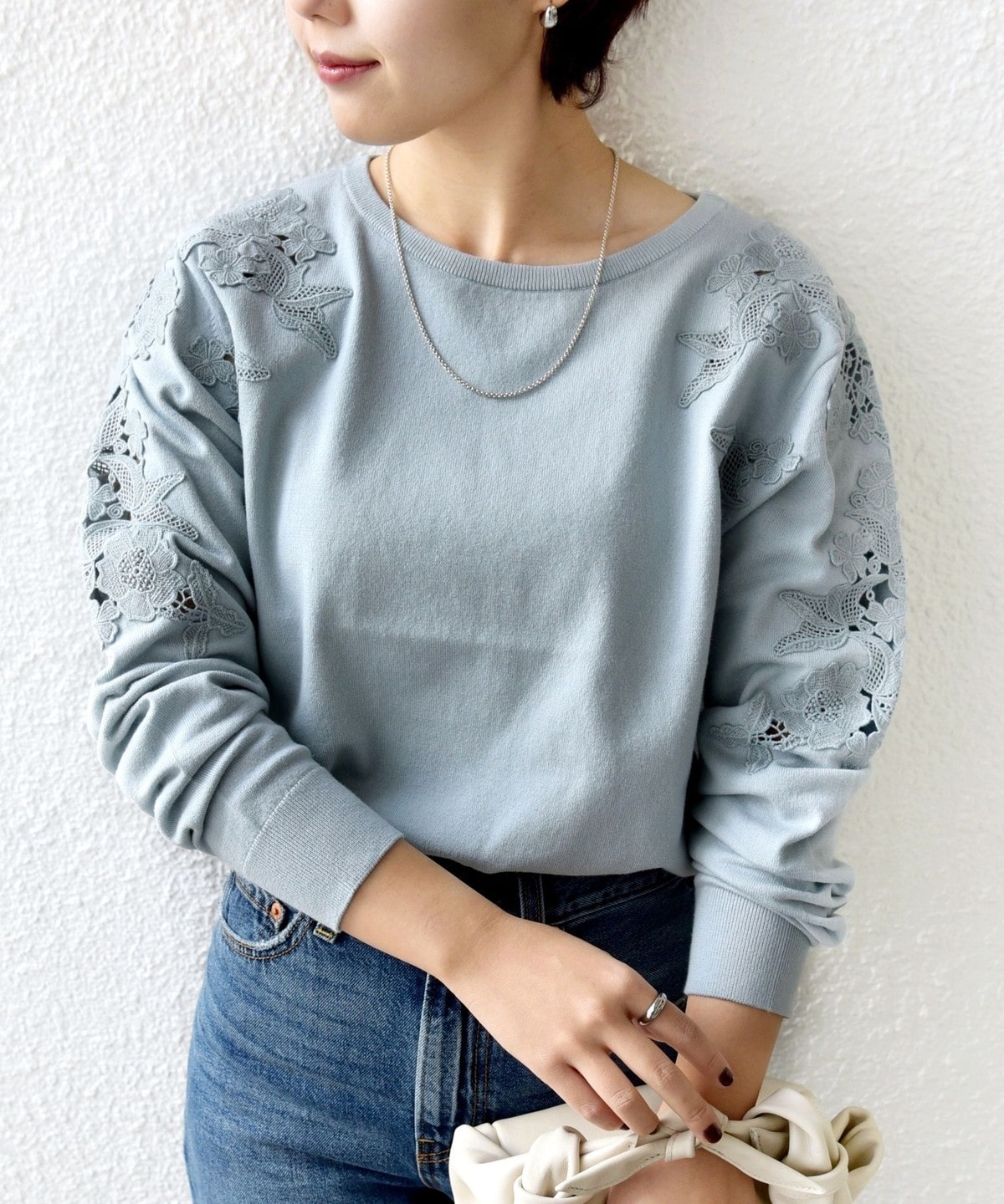 肩から二の腕に掛かるレースが春らしいニットプルオーバー。