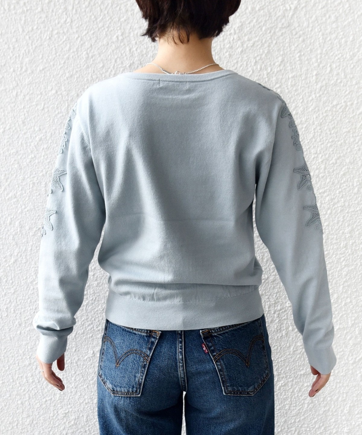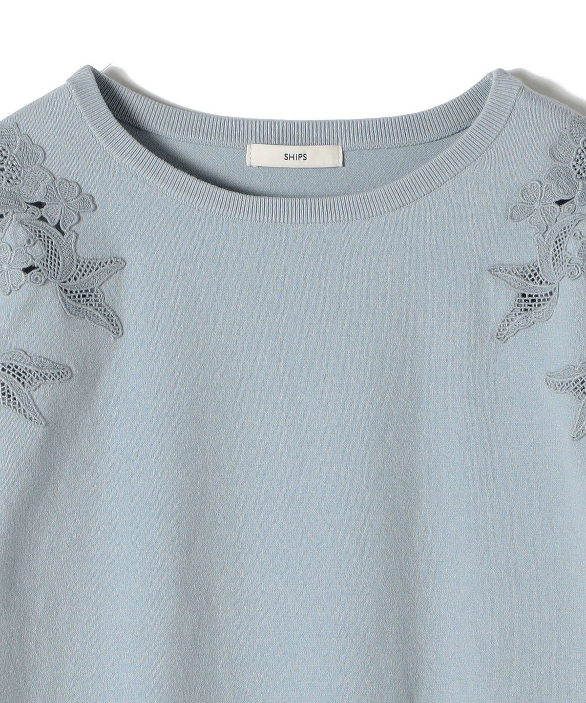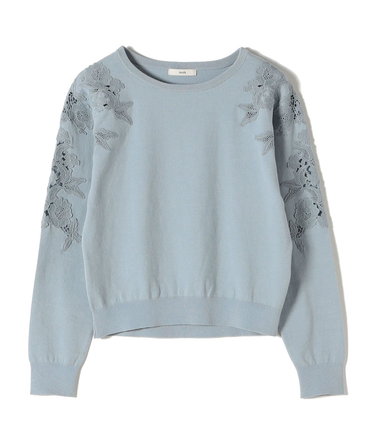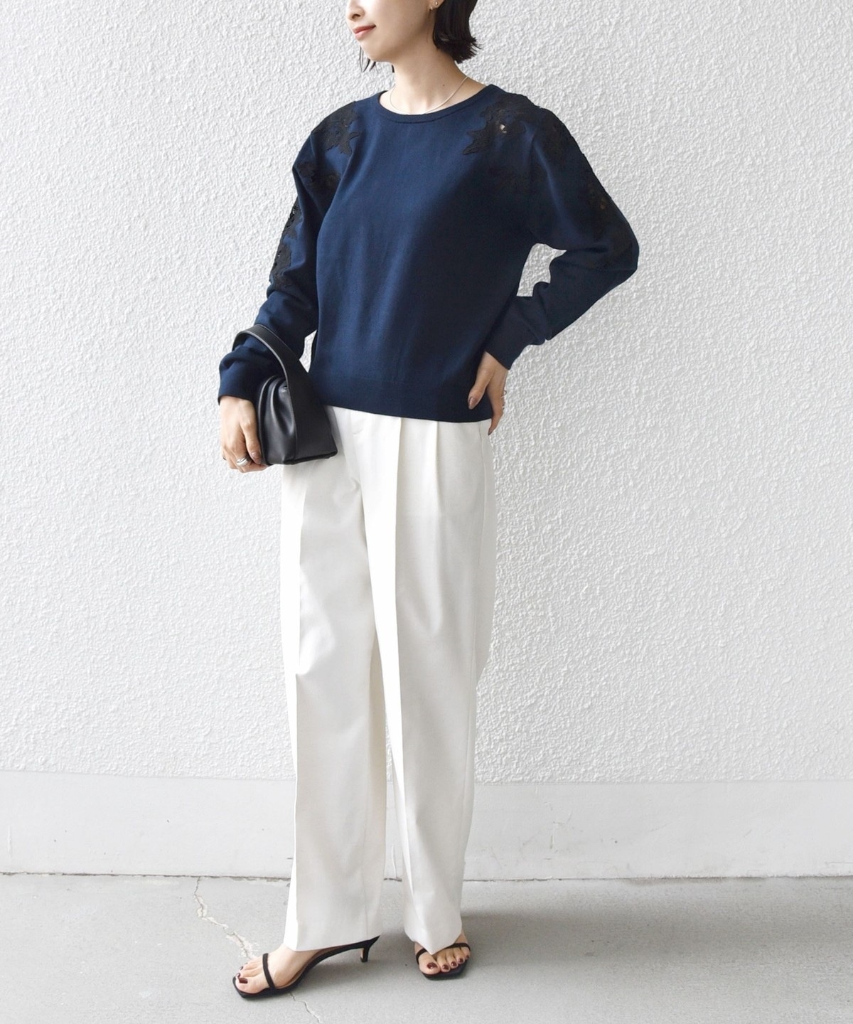 肩から二の腕に掛かるレースが春らしいニットプルオーバー。