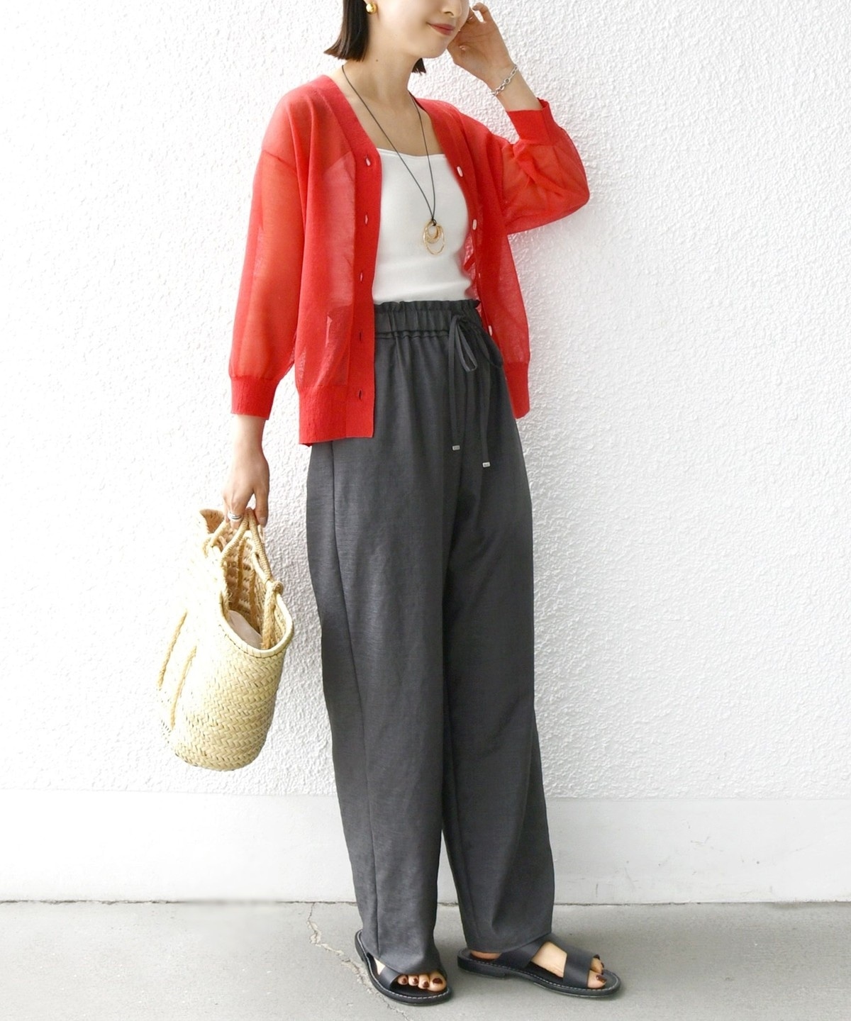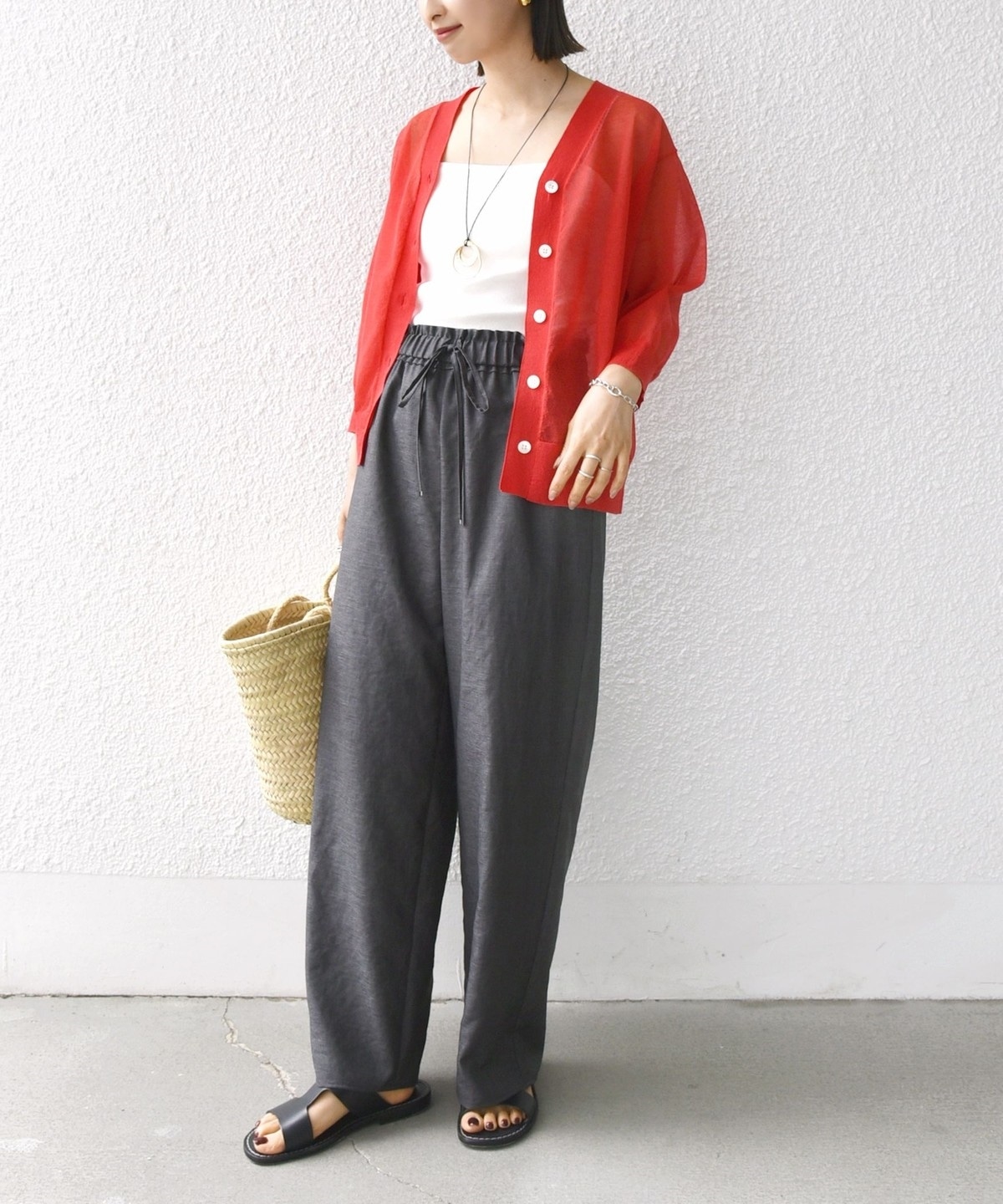 ネックは開きすぎていないので、中にキャミソールを合わせてプルオーバー風にも着ていただけます。