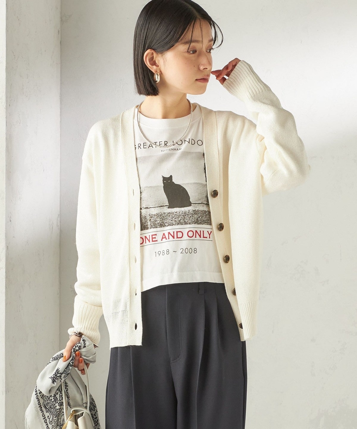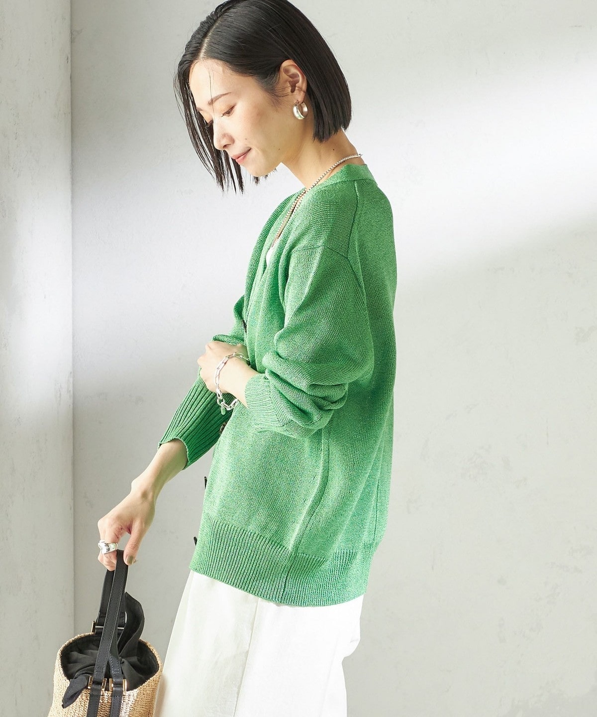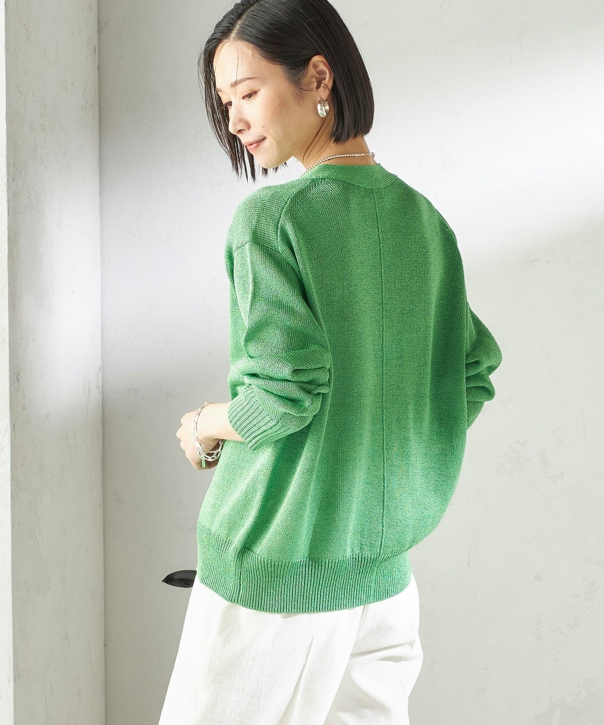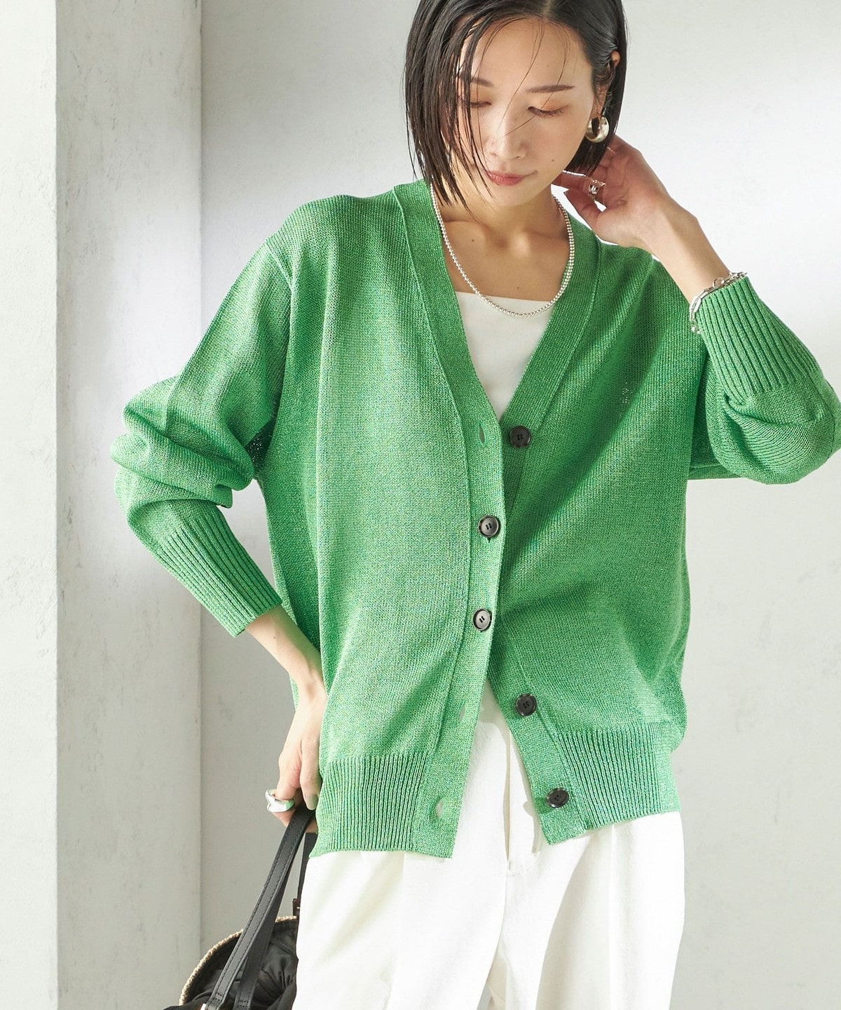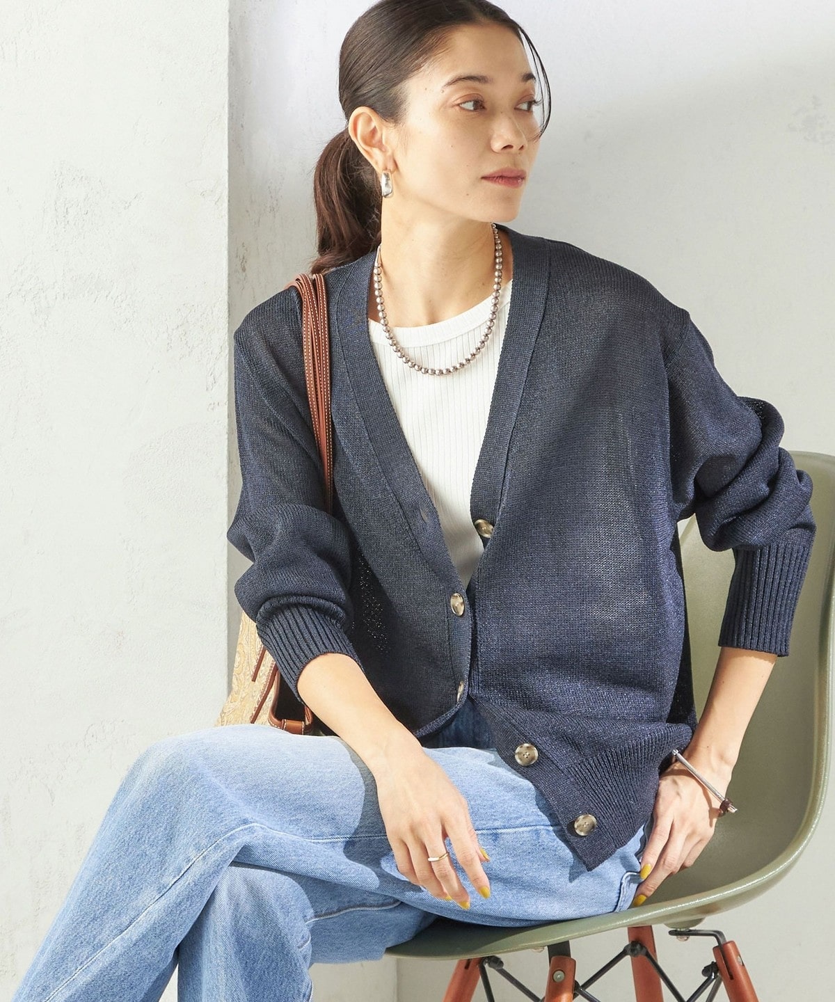 盛夏まで長く着られるペーパーアセテート素材のニットカーディガン