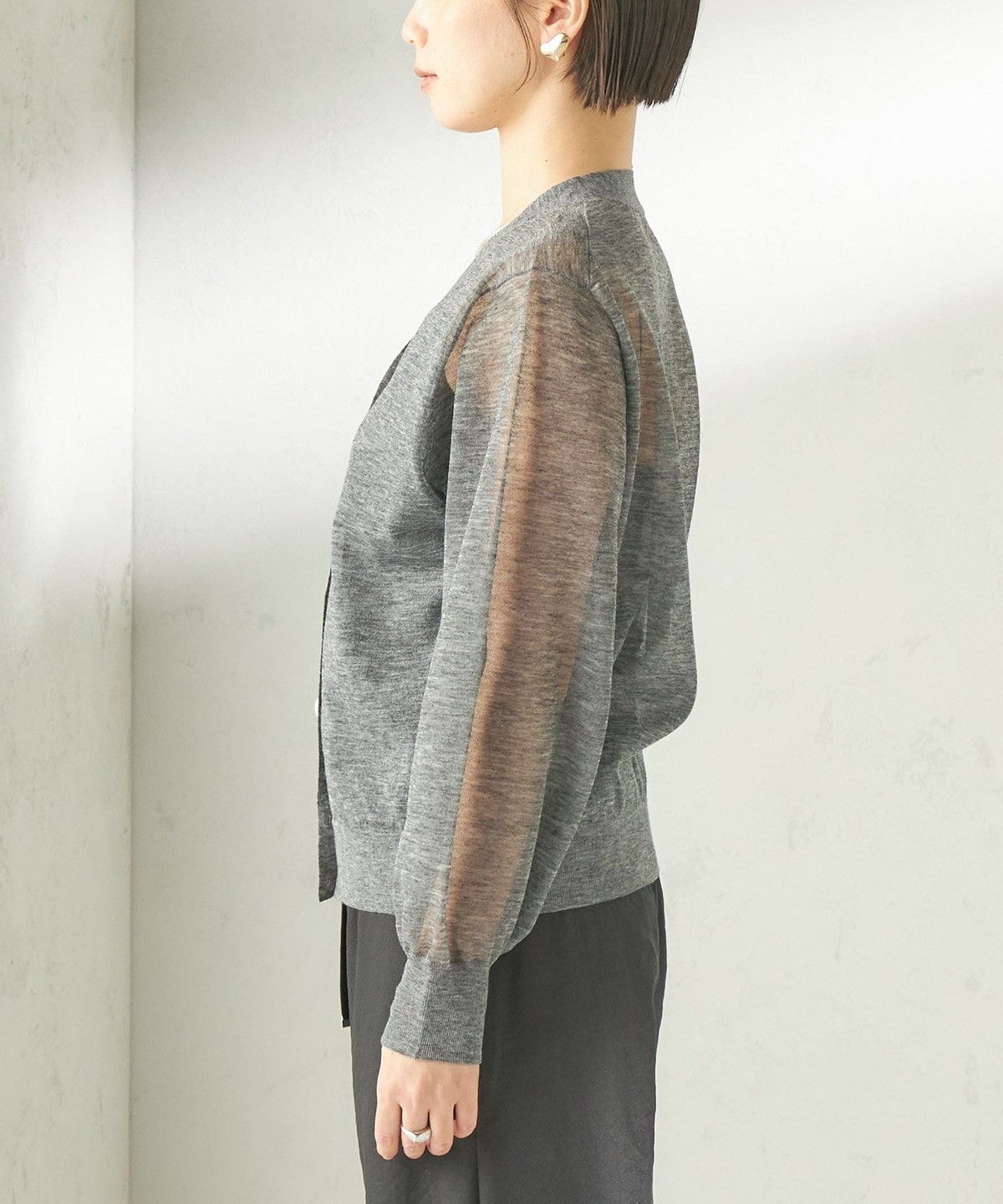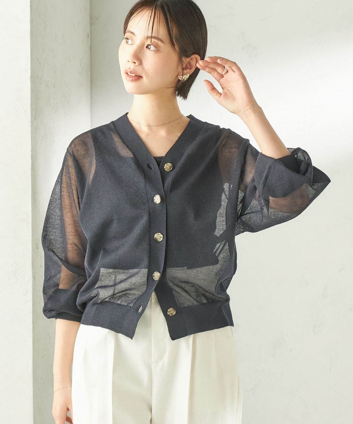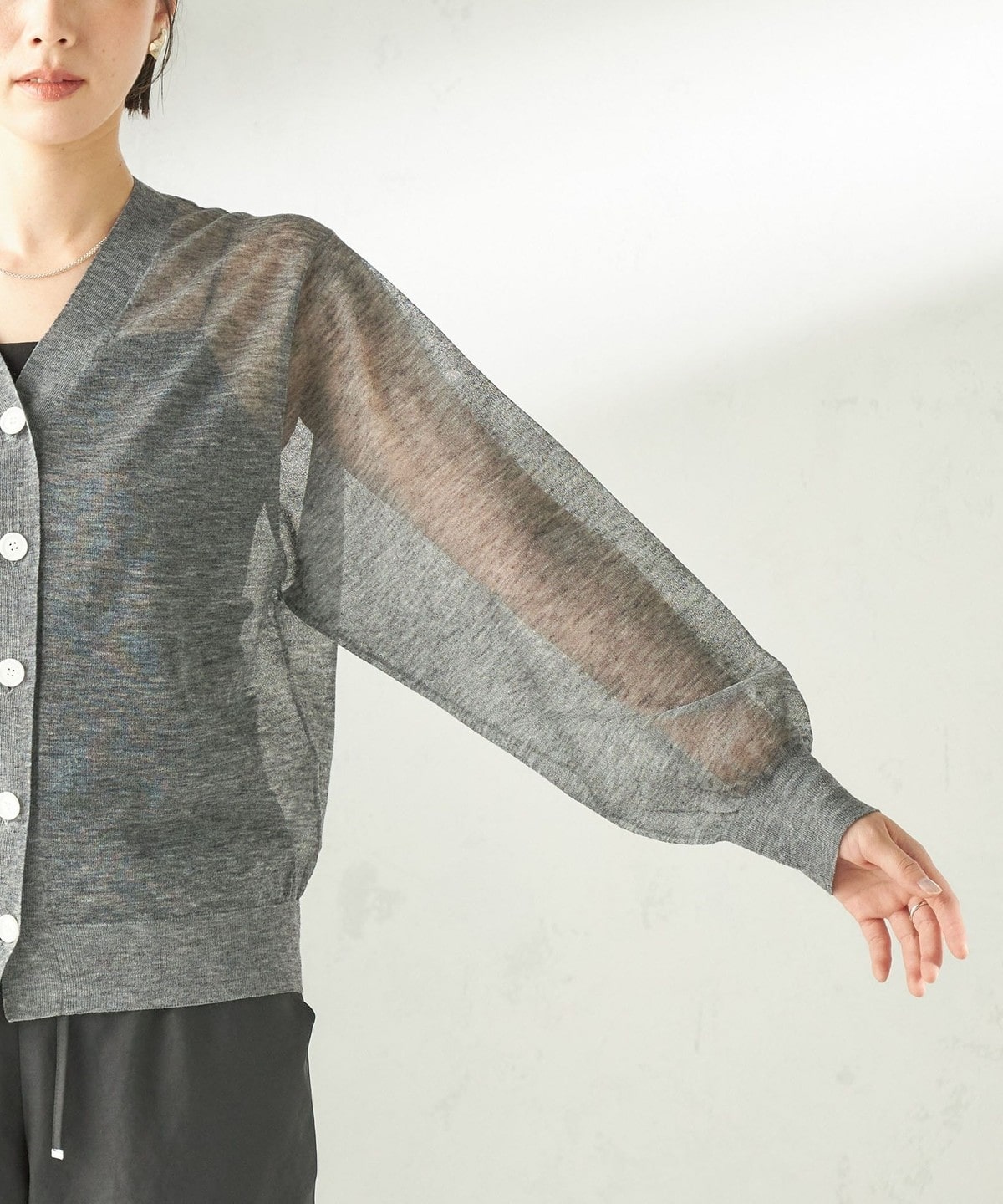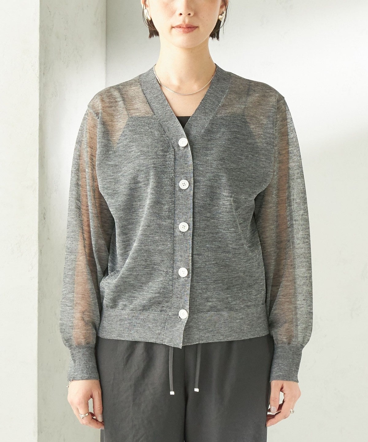 シンプルなVネックのシアーカーディガン。