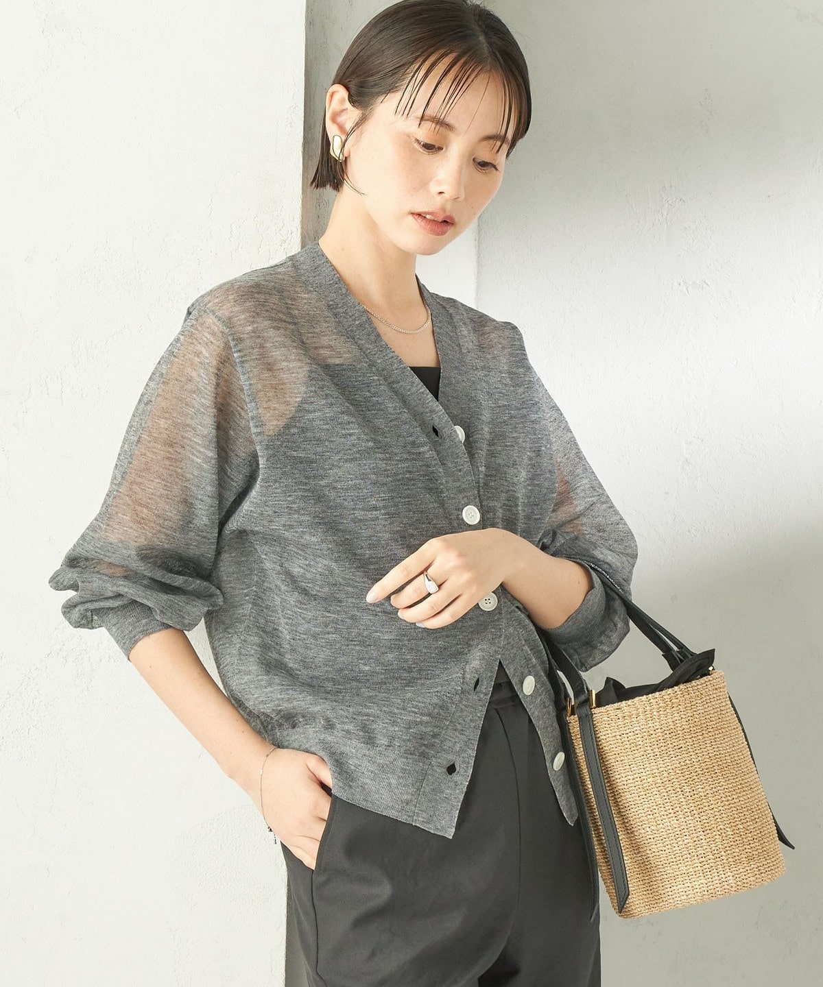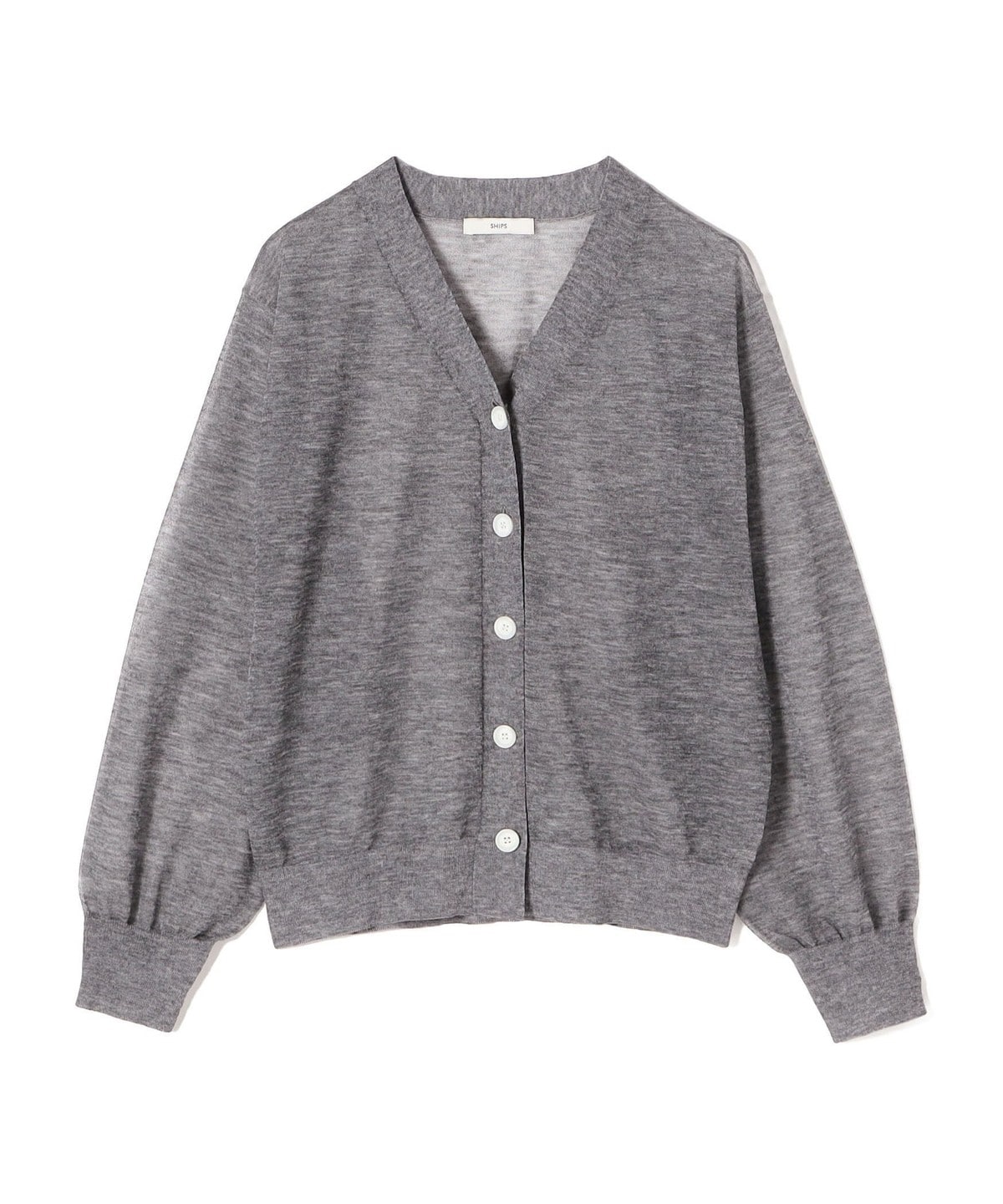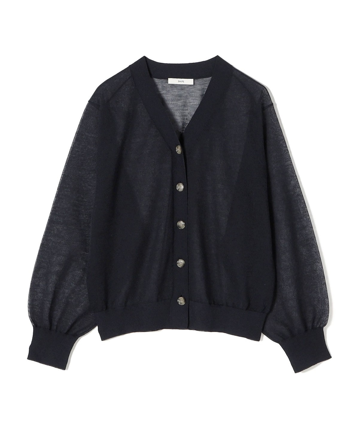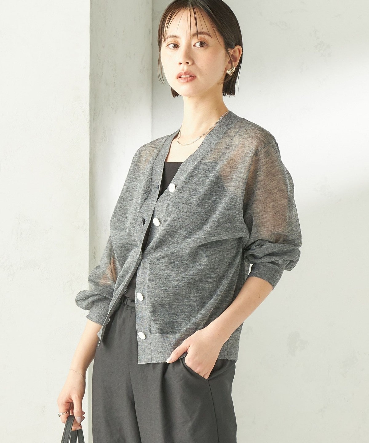 シンプルなVネックのシアーカーディガン。