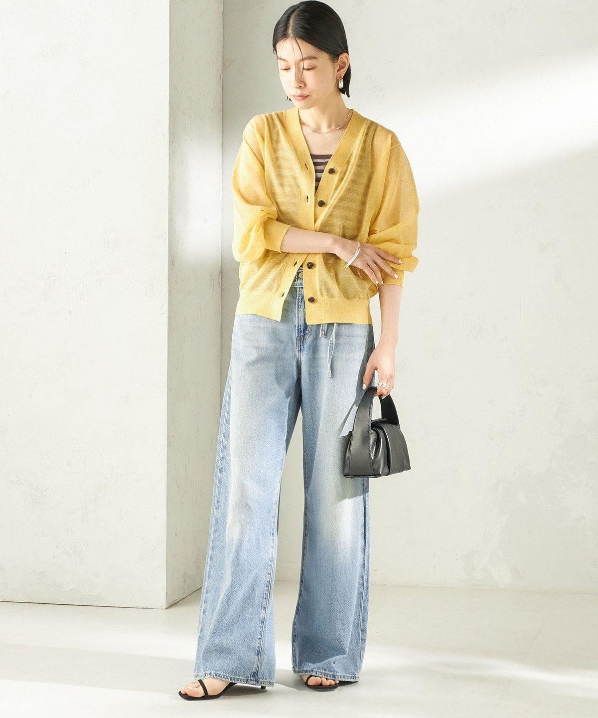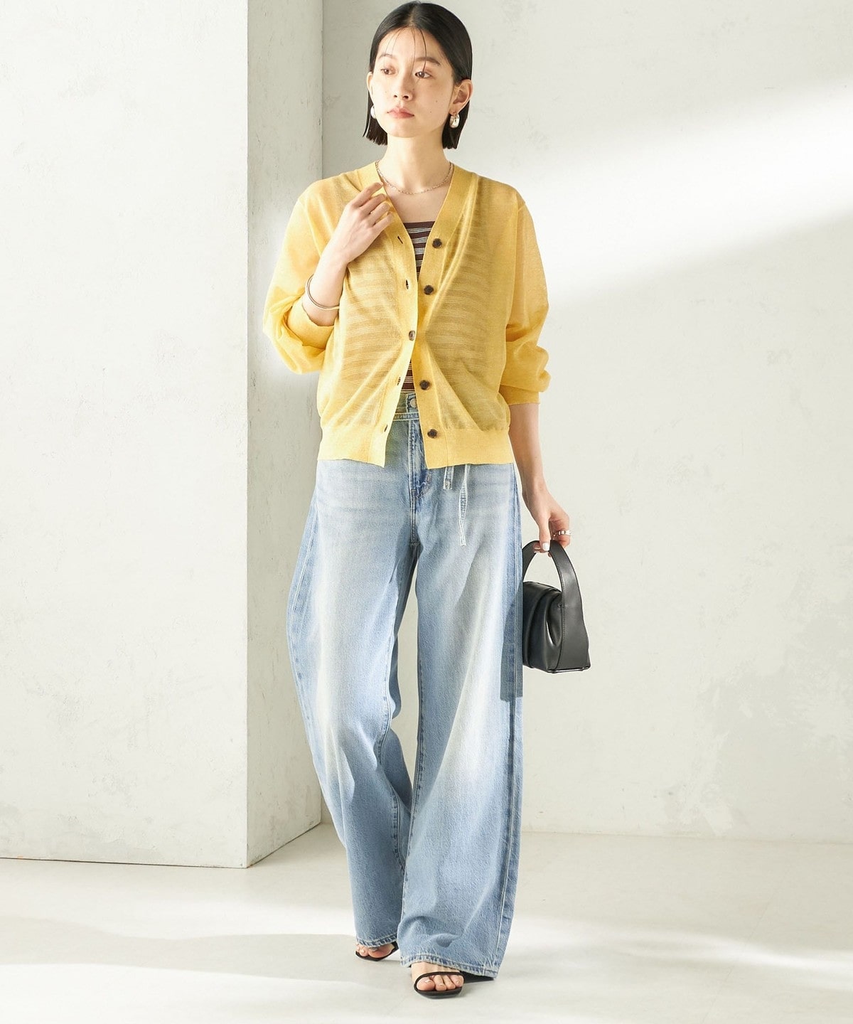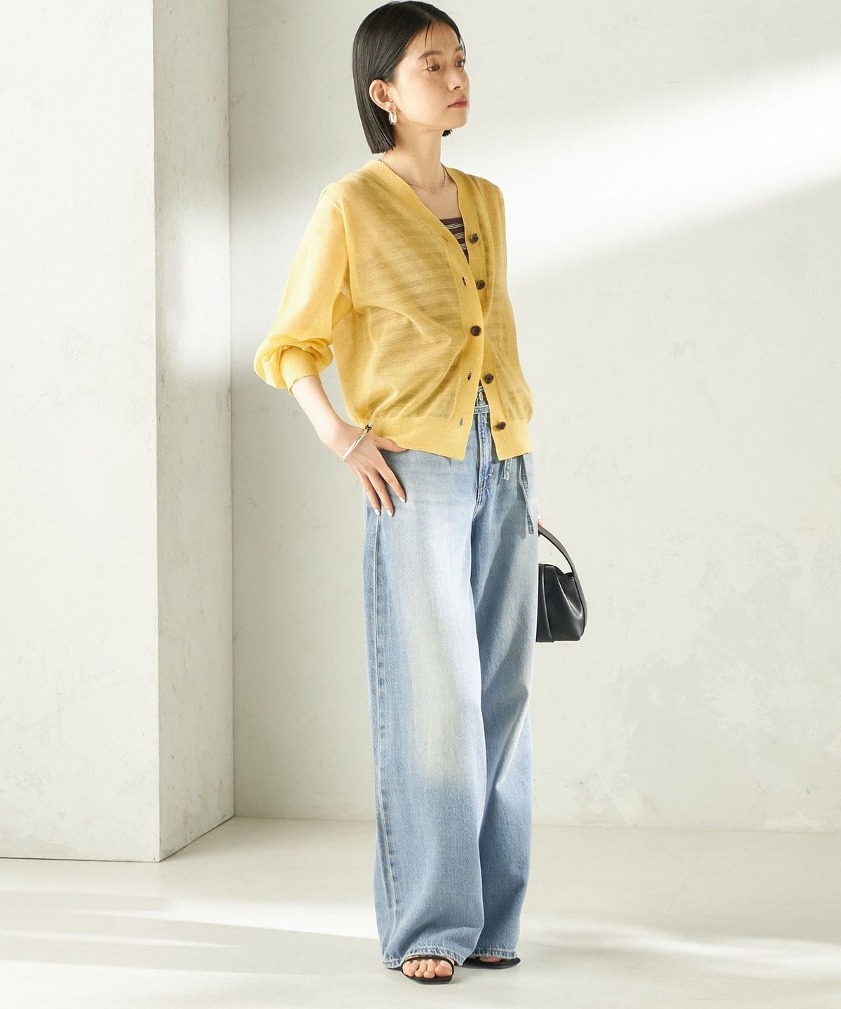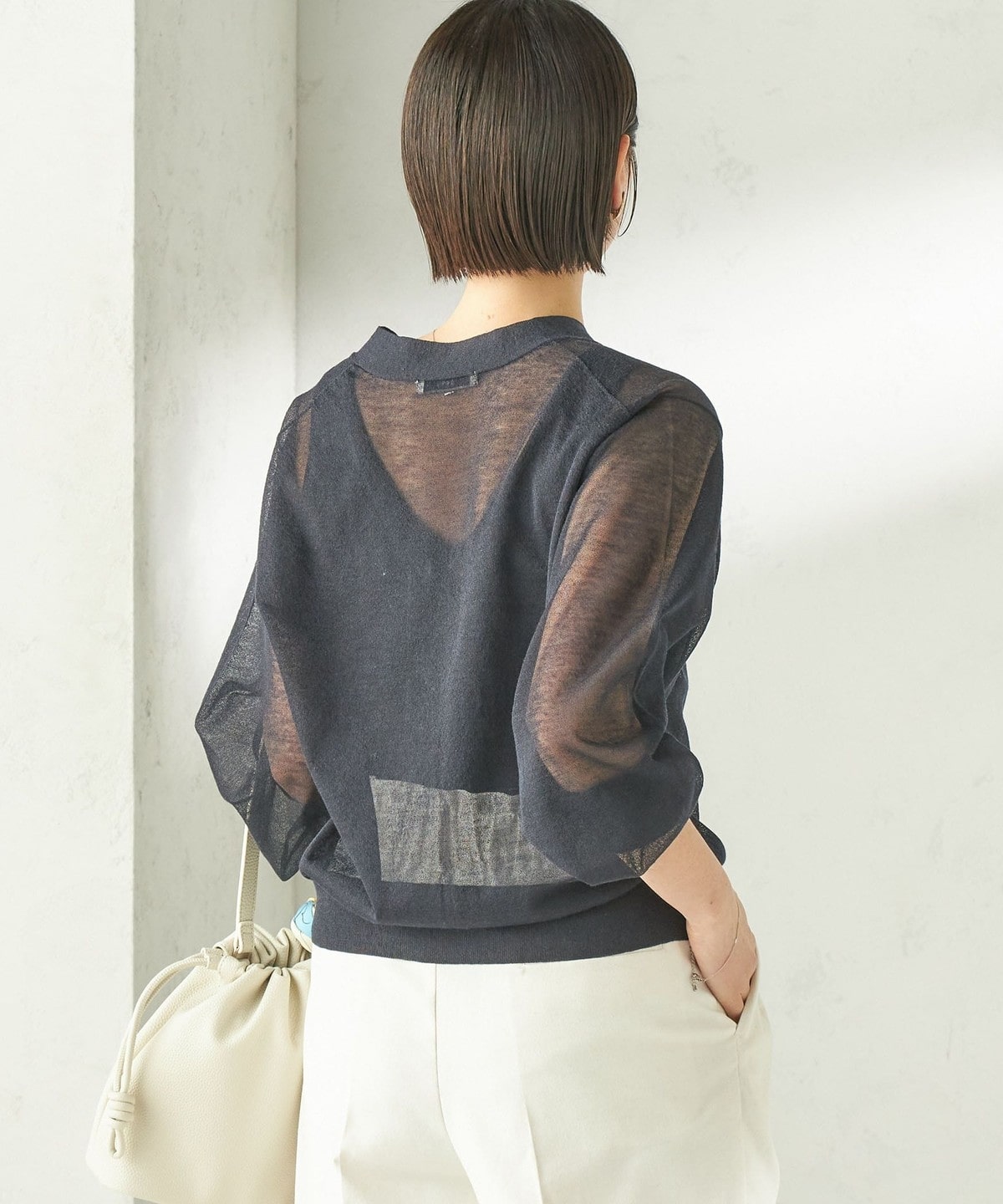 シンプルなVネックのシアーカーディガン。
