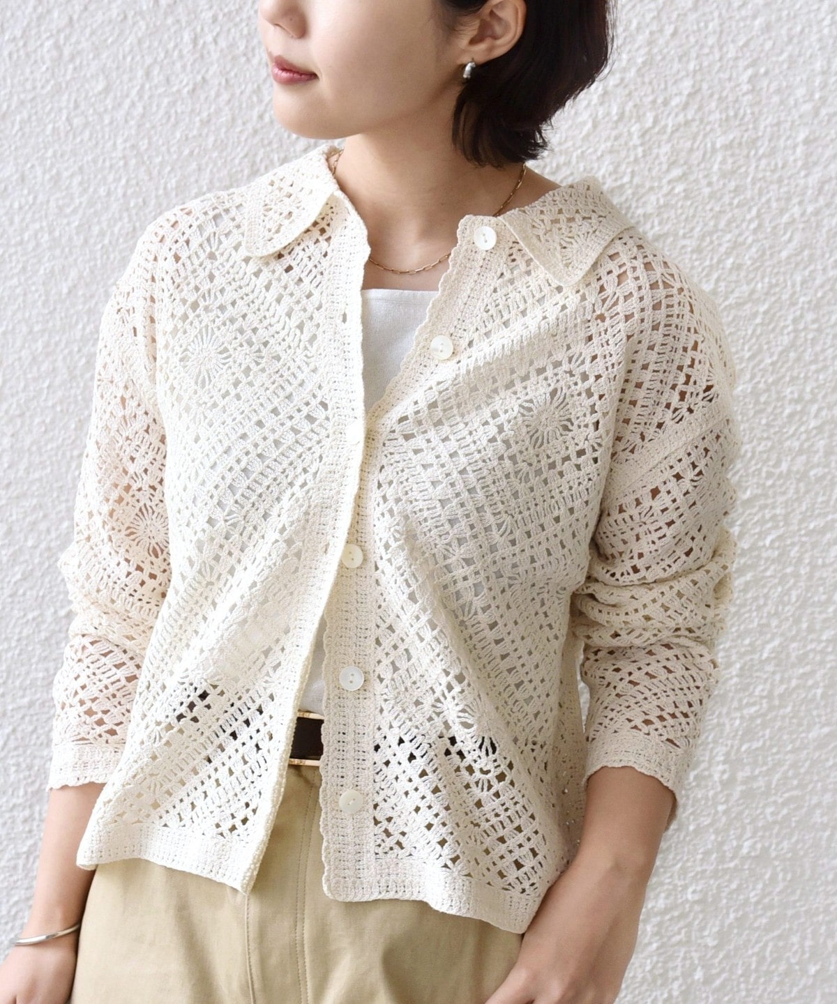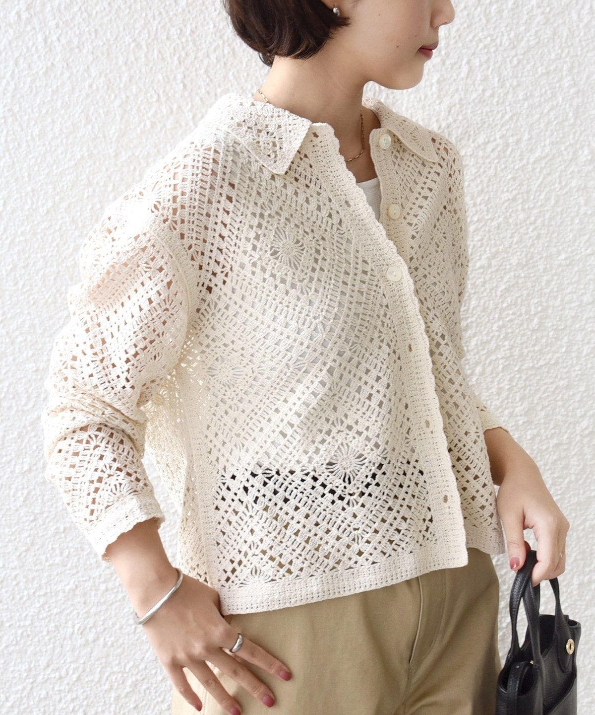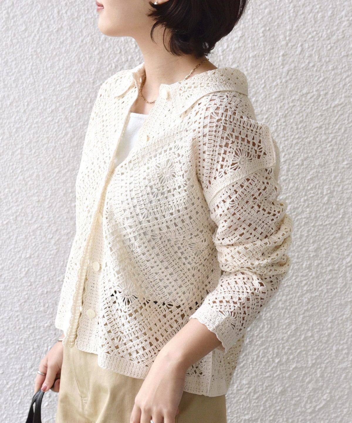 かぎ針風の立体的で繊細な刺繍が上品なニットカーディガン