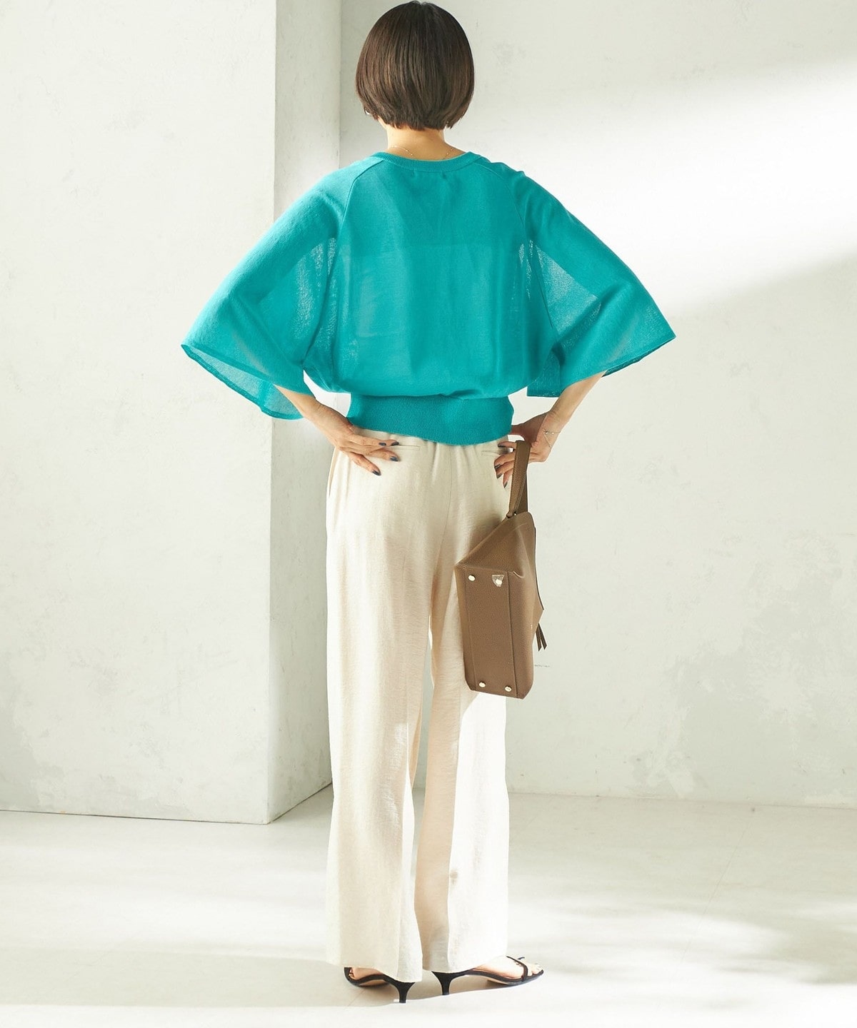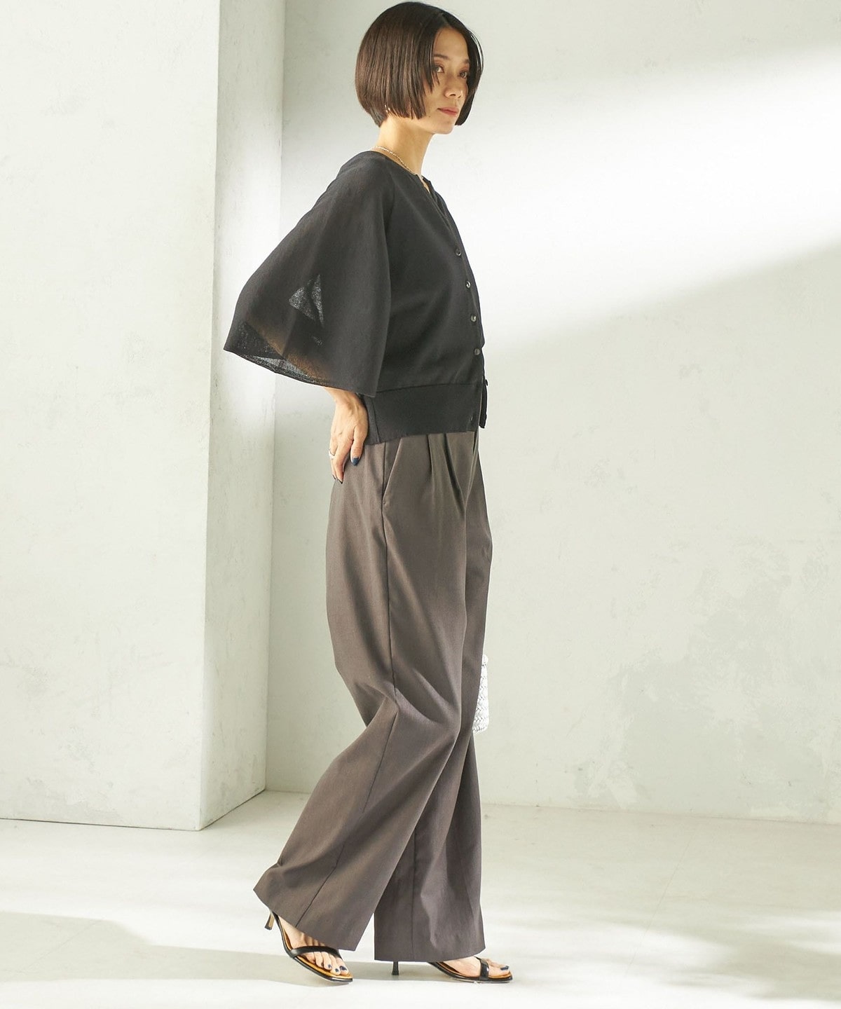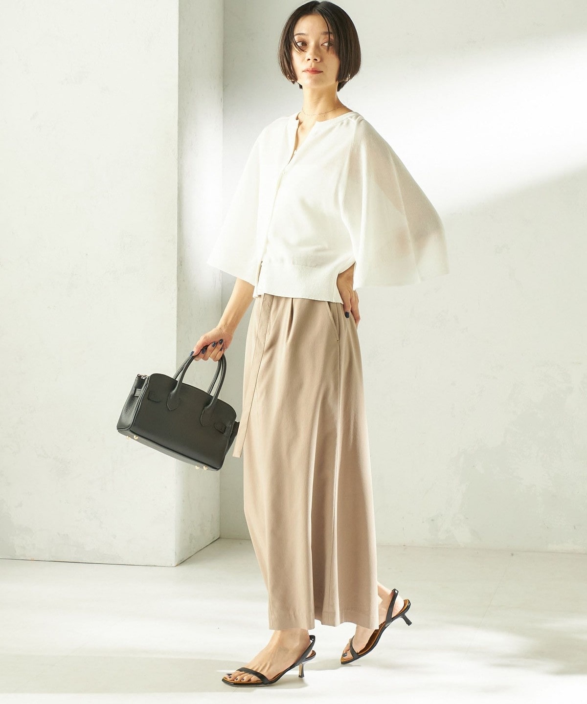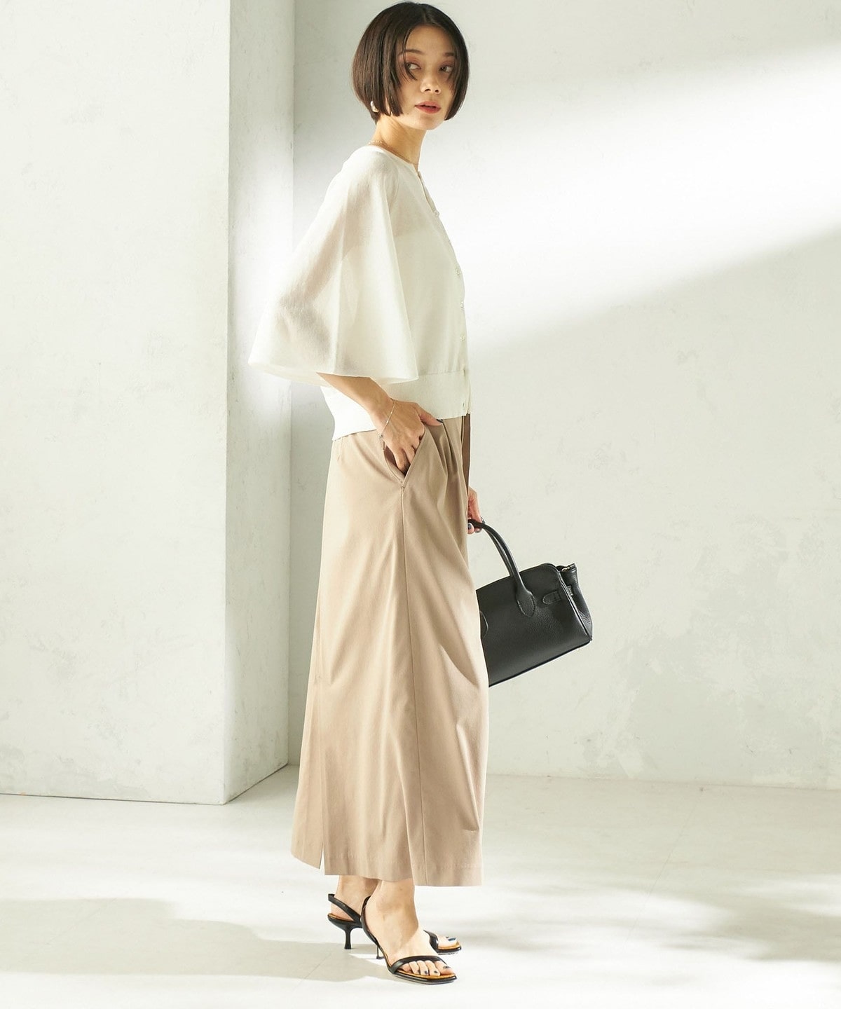 フレアスリーブが映えるため、パンツやタイトスカートなどすっきりとしたボトムとの合わせがおすすめです。