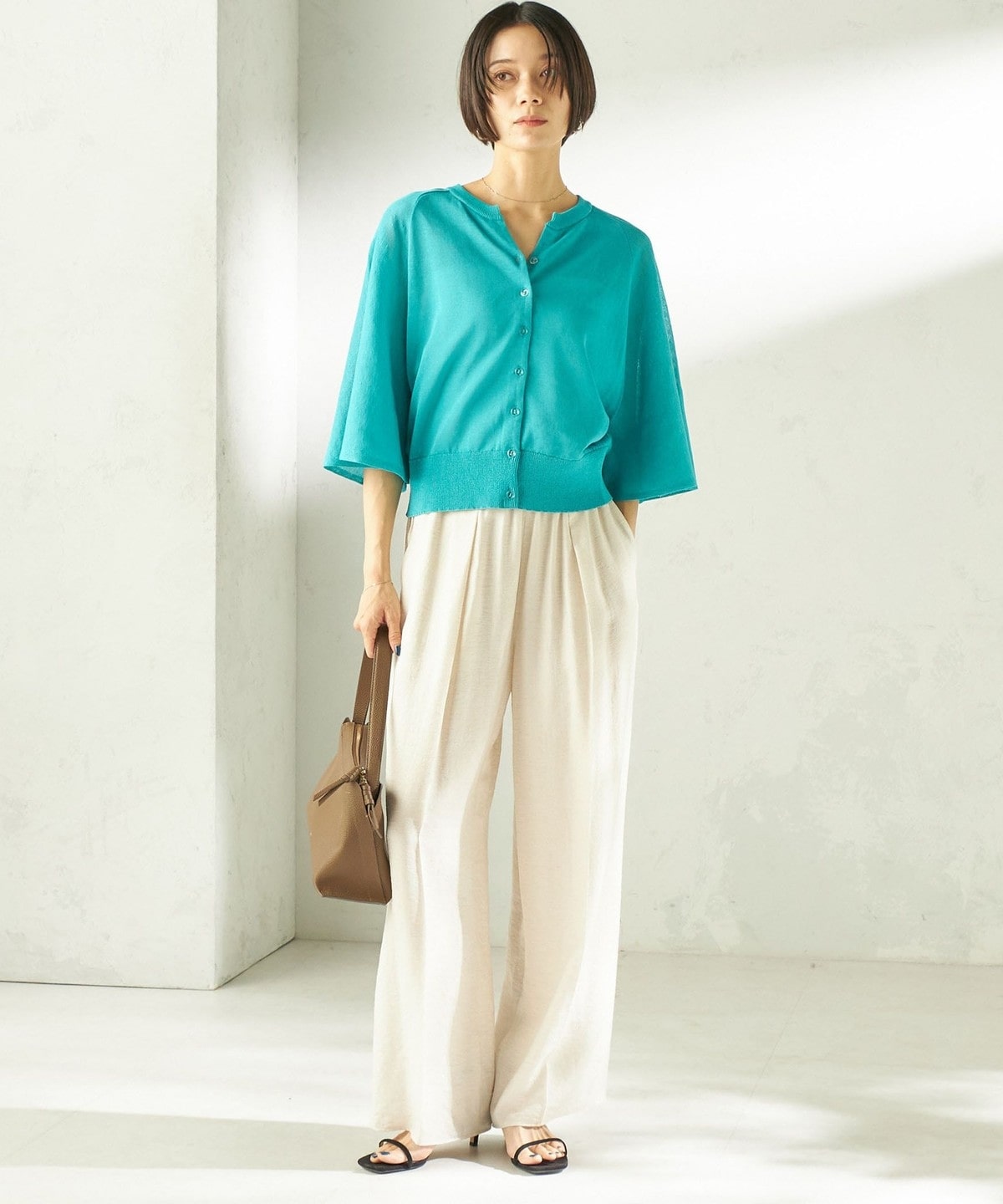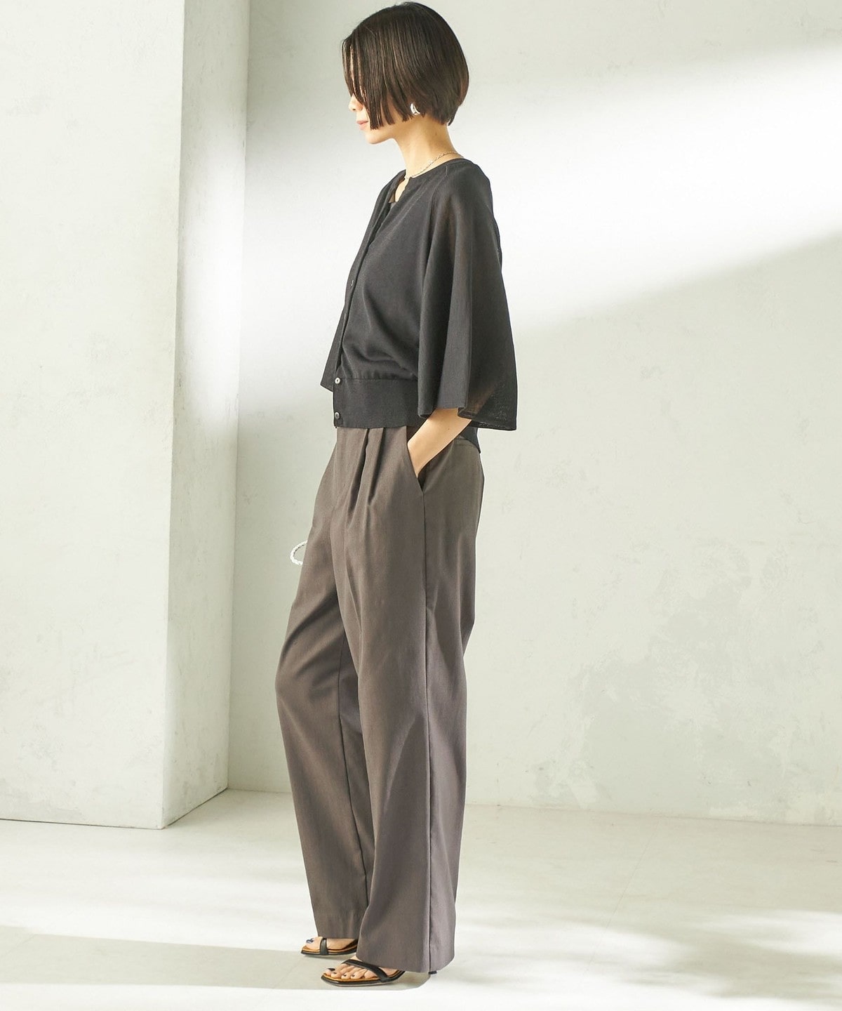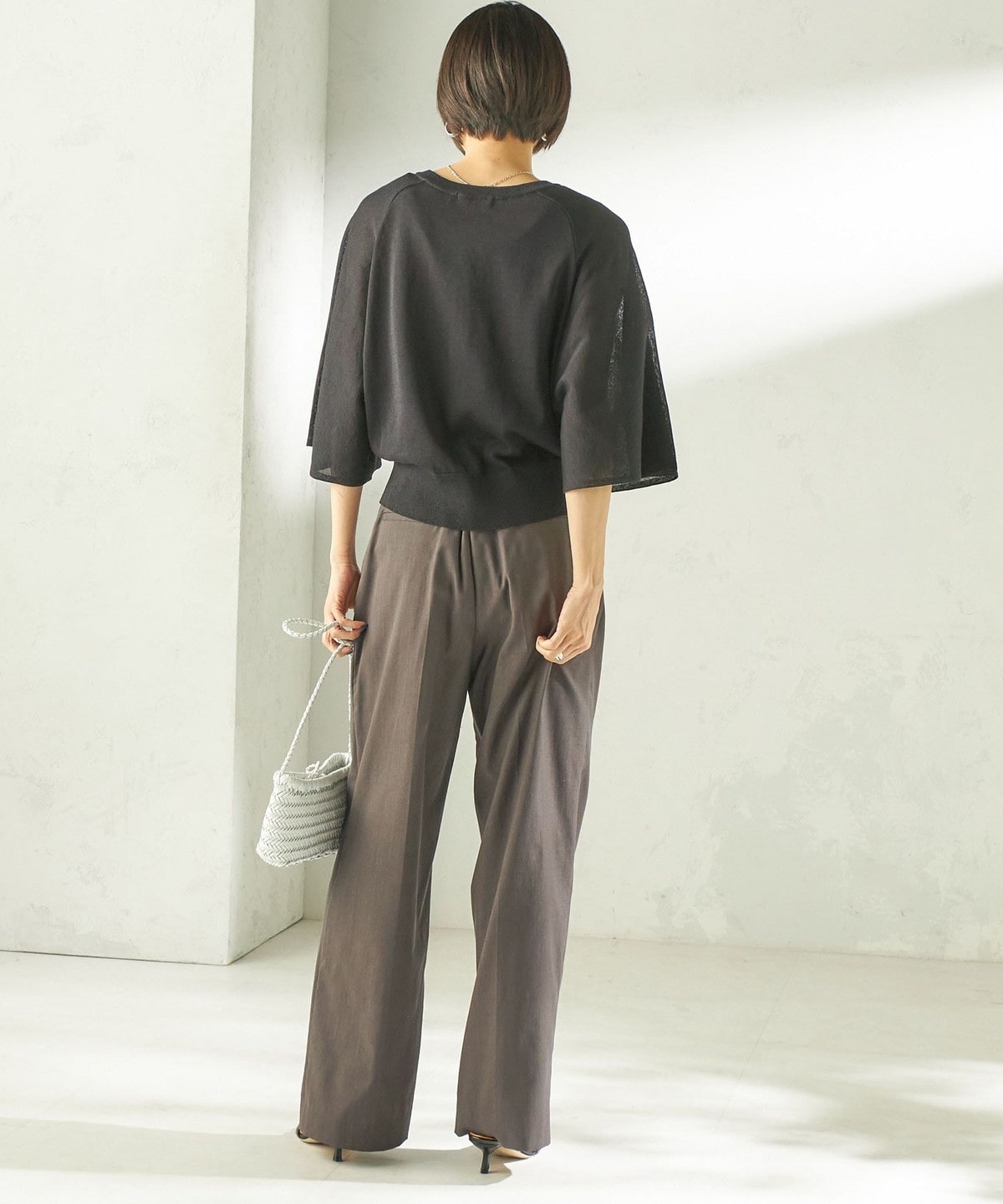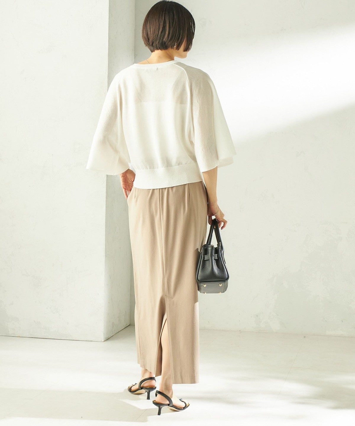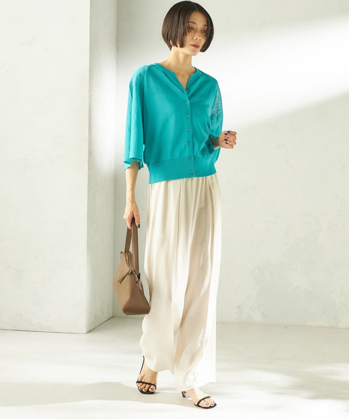 フレアスリーブが映えるため、パンツやタイトスカートなどすっきりとしたボトムとの合わせがおすすめです。