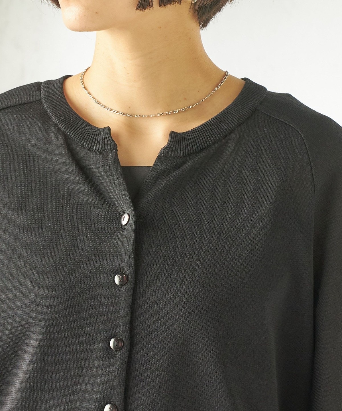 前を開けてカーディガンとしてはもちろん、前を閉じてキーネックニットとしても着用可能。