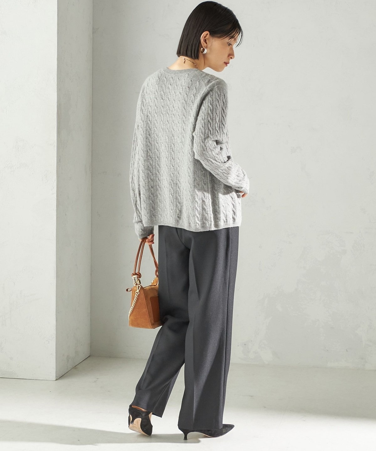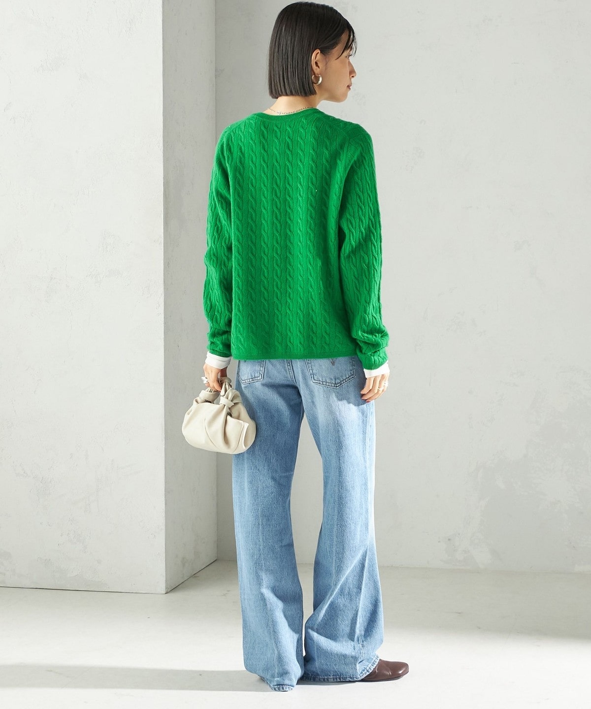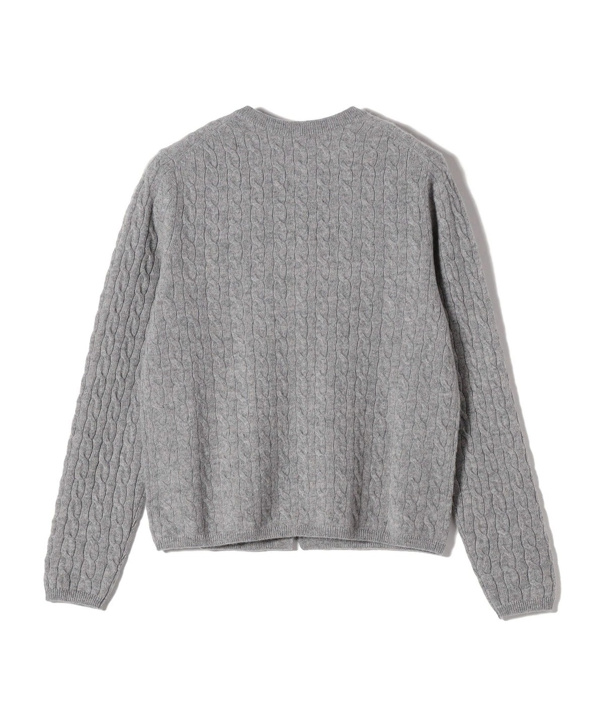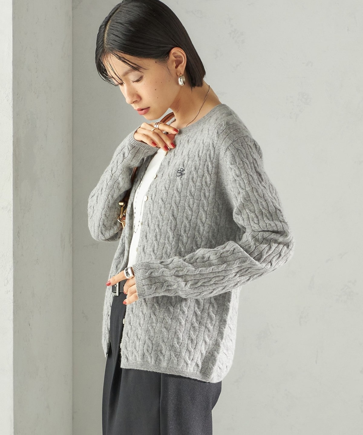 カシミヤ 細 ケーブル クルーネック カーディガン