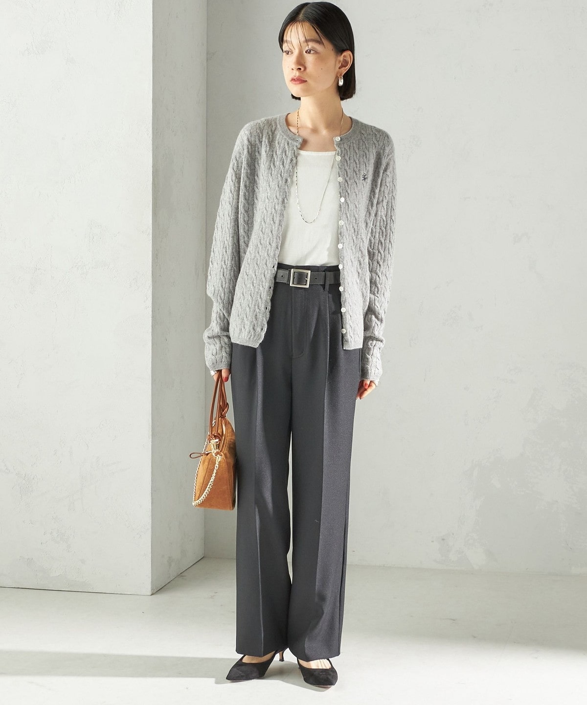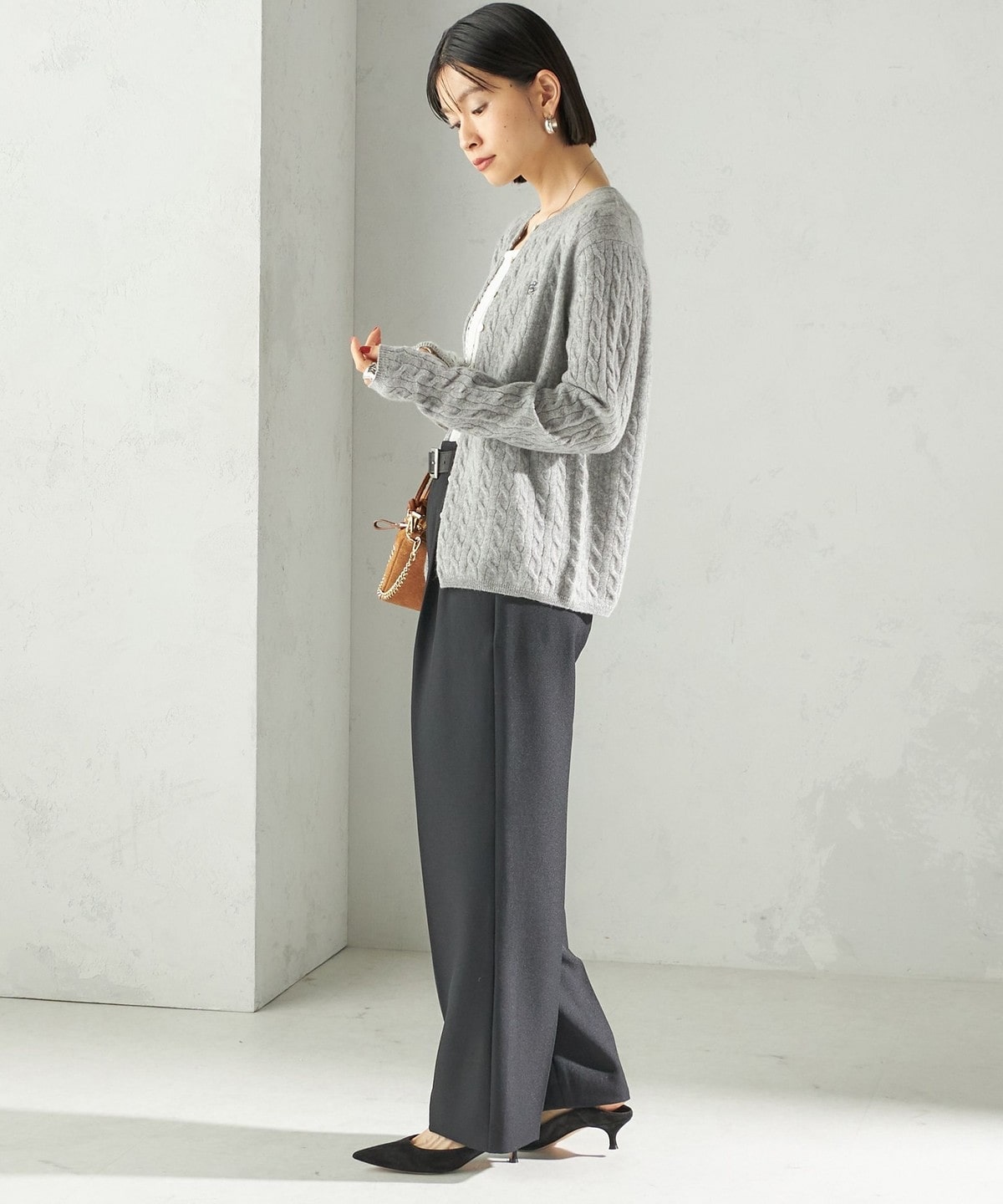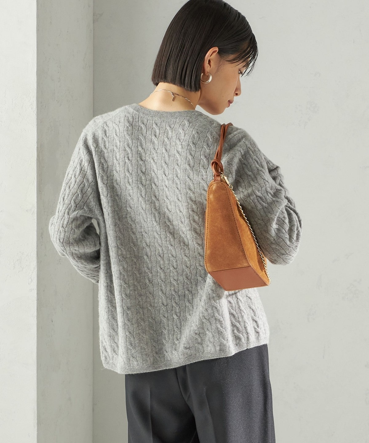 カシミヤ 細 ケーブル クルーネック カーディガン