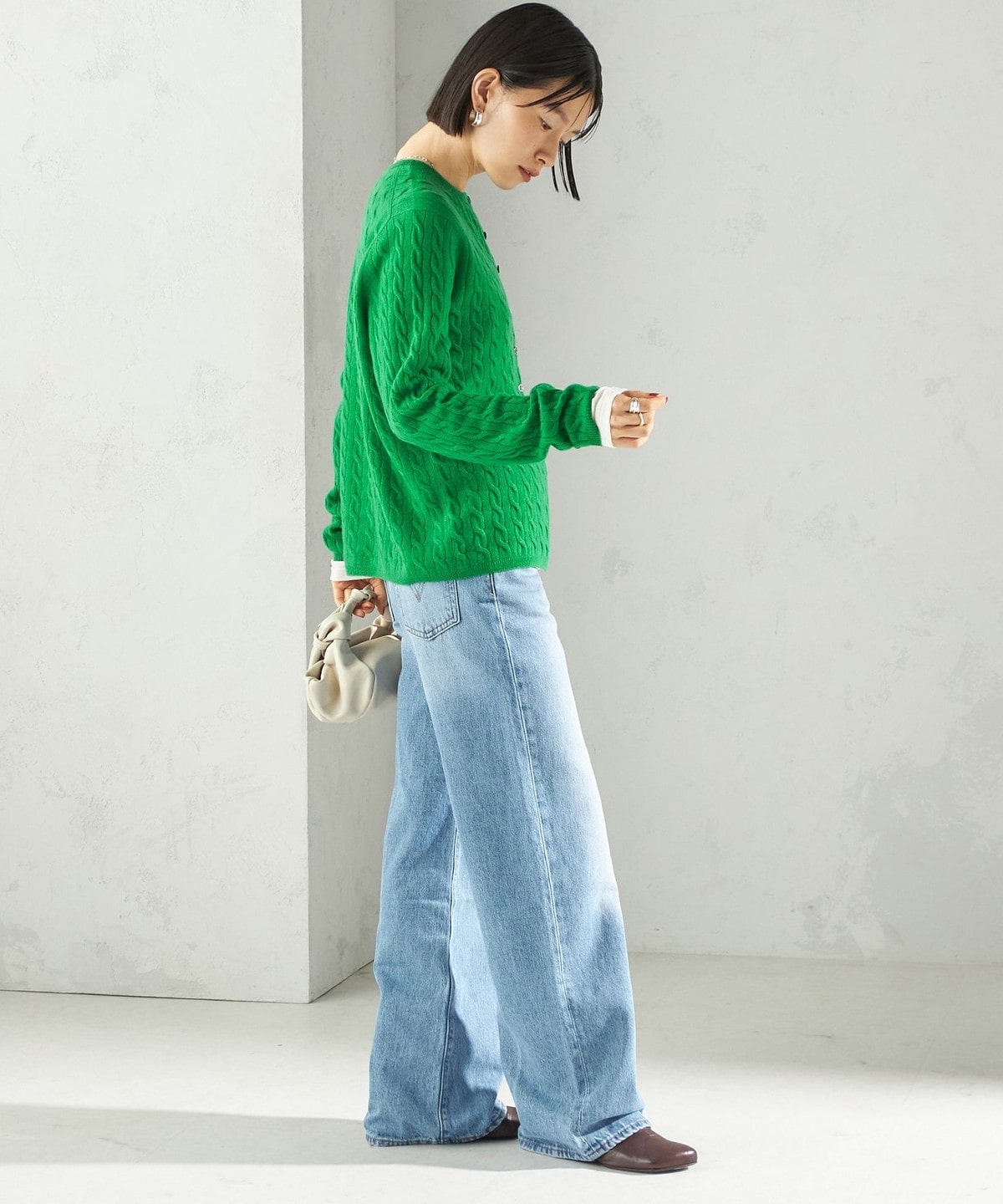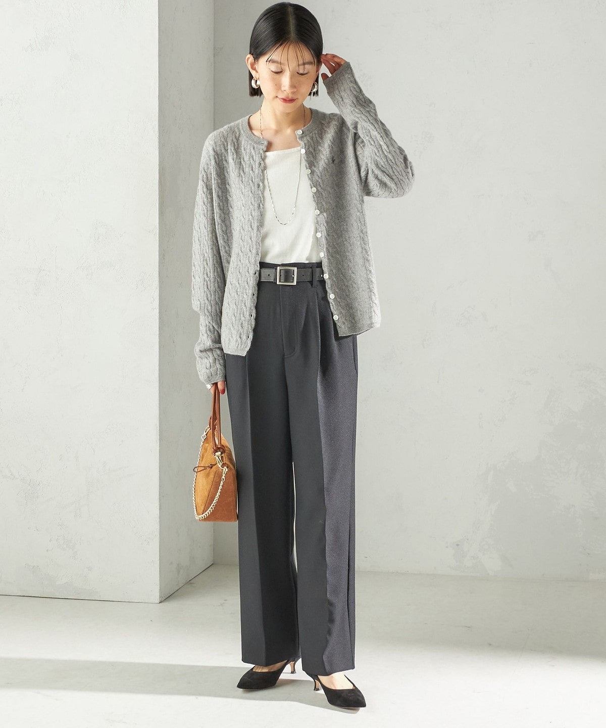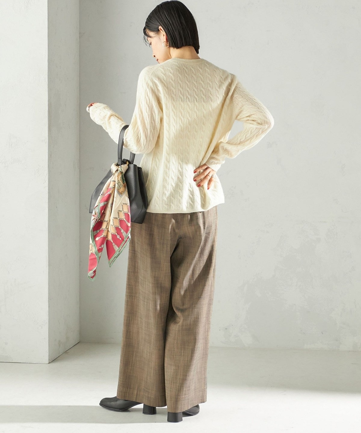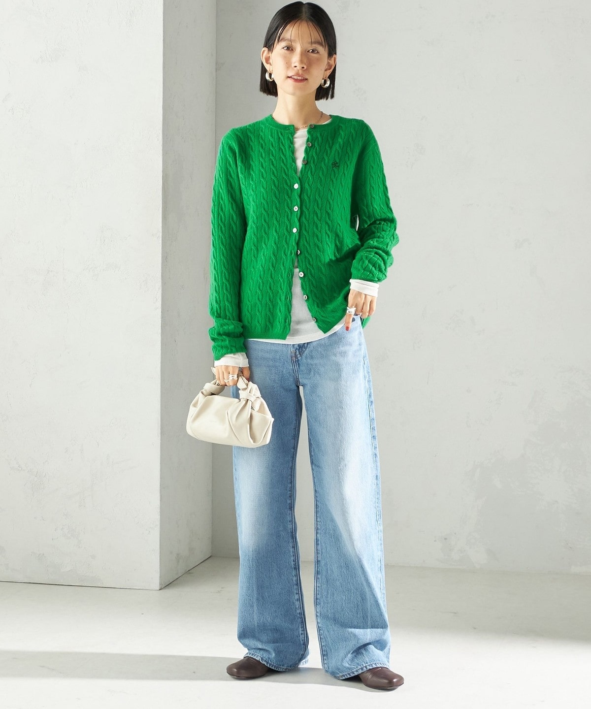 カシミヤ 細 ケーブル クルーネック カーディガン