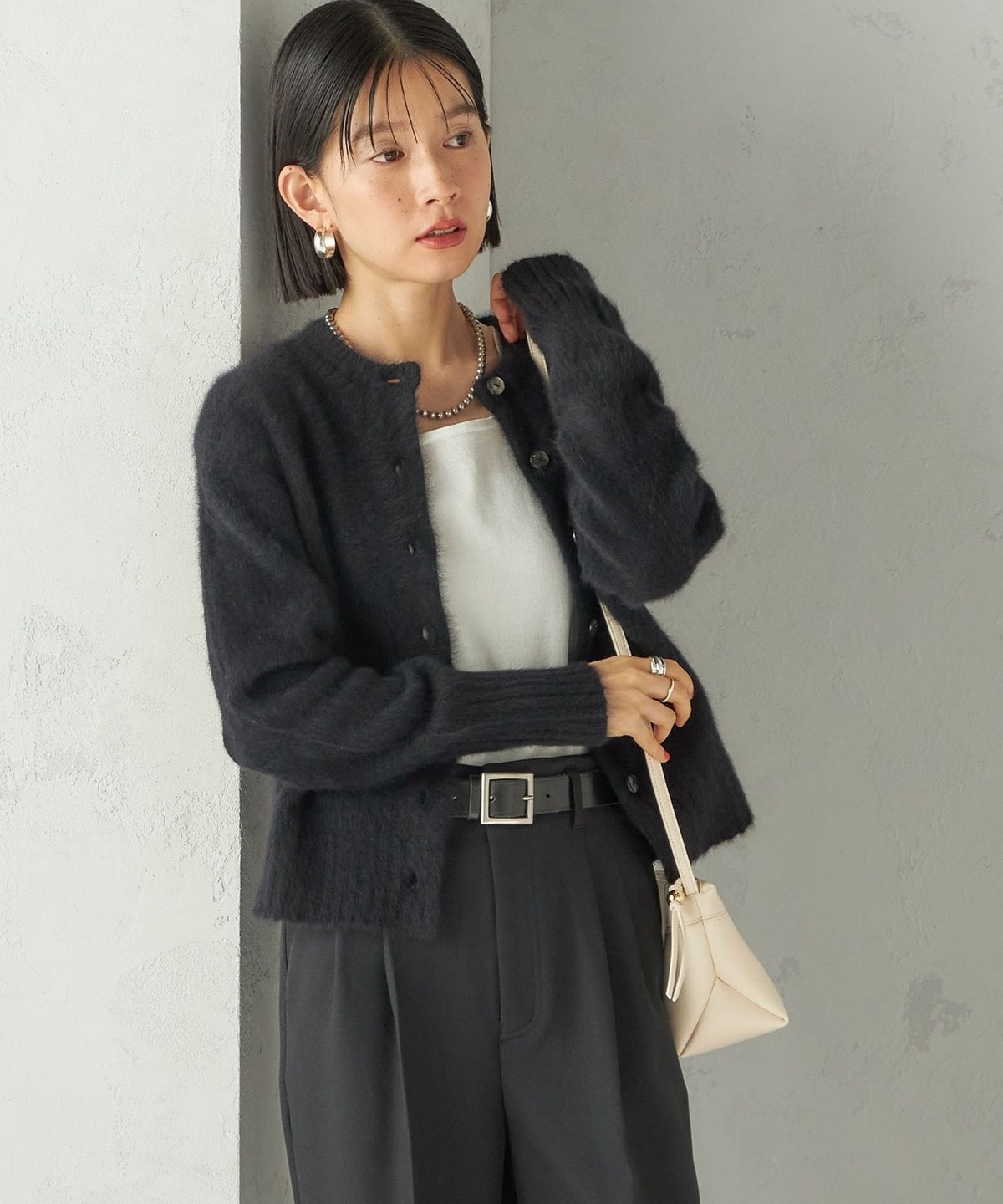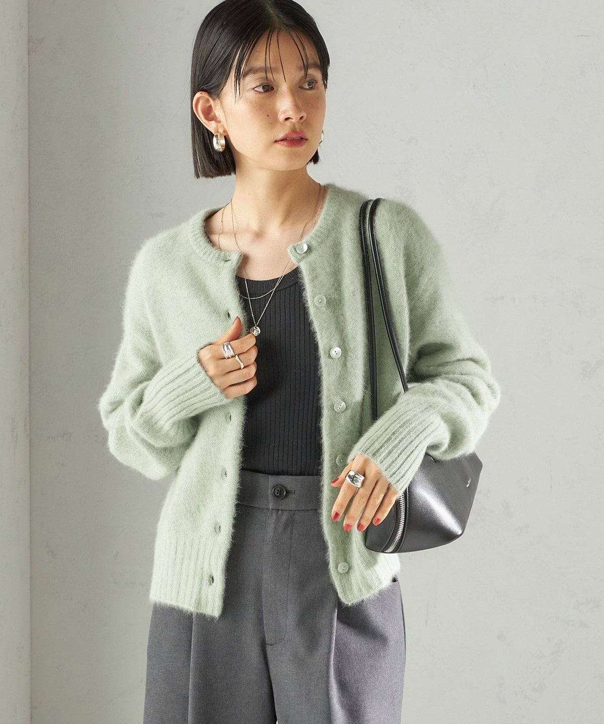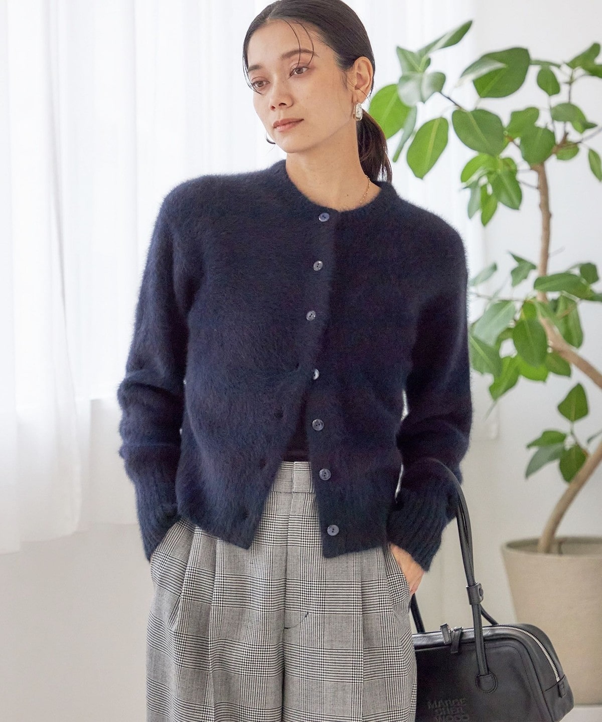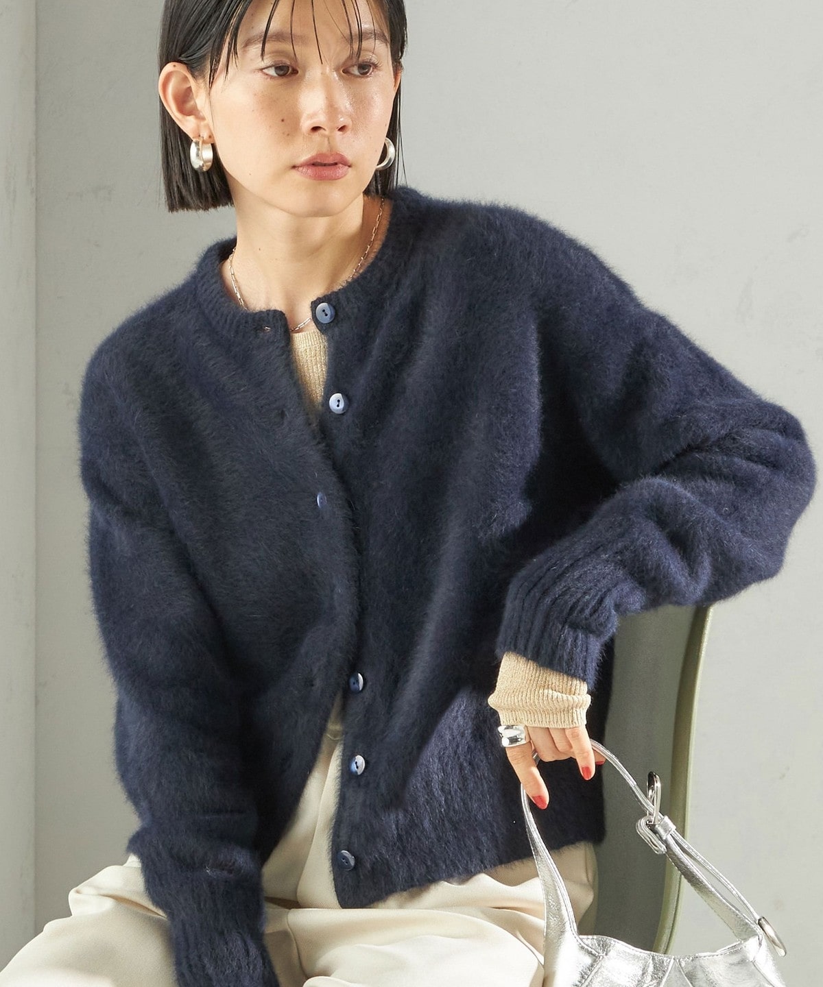 ミドルゲージでふわふわ素材のベーシックなクルーネックニットカーディガンです。