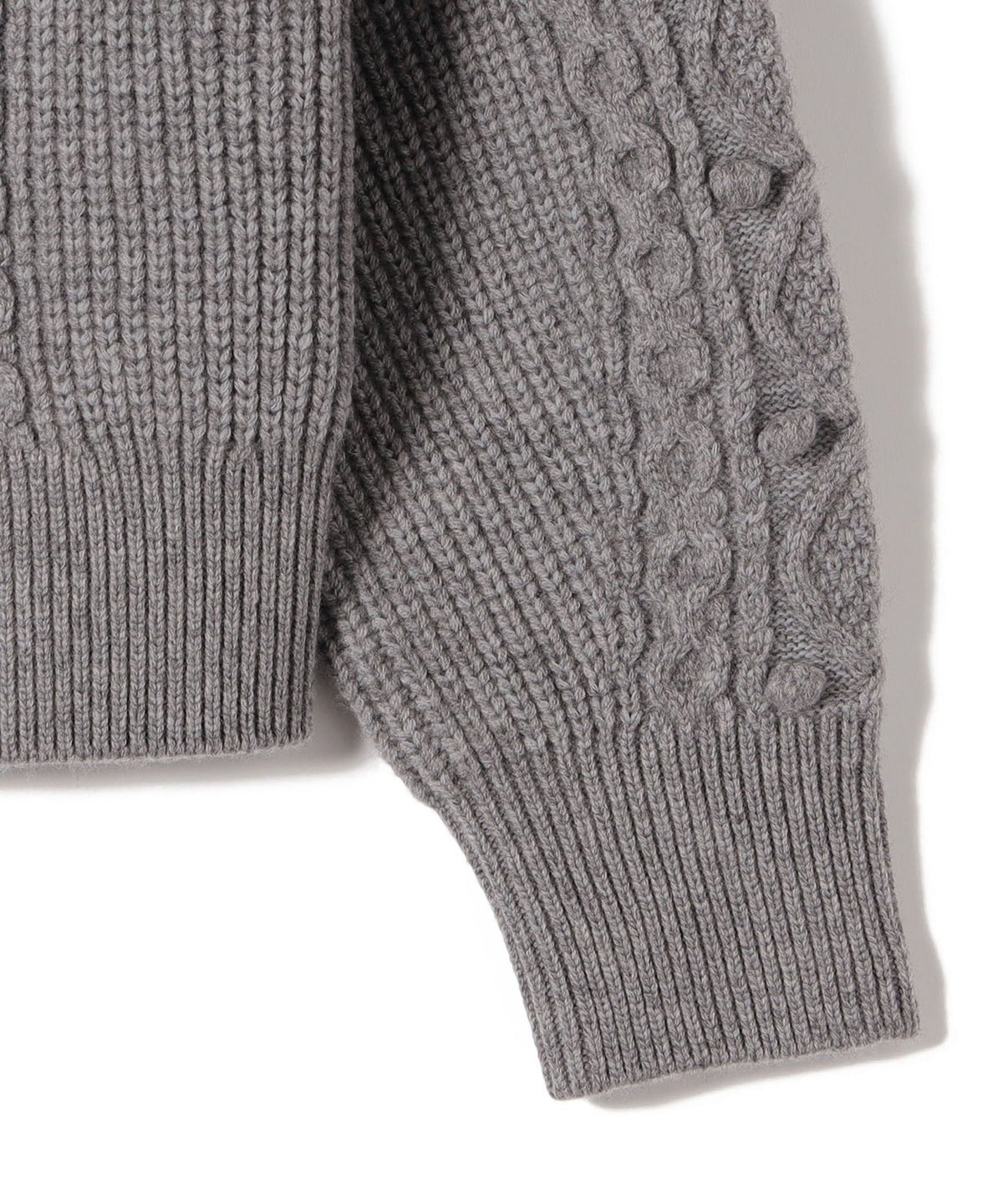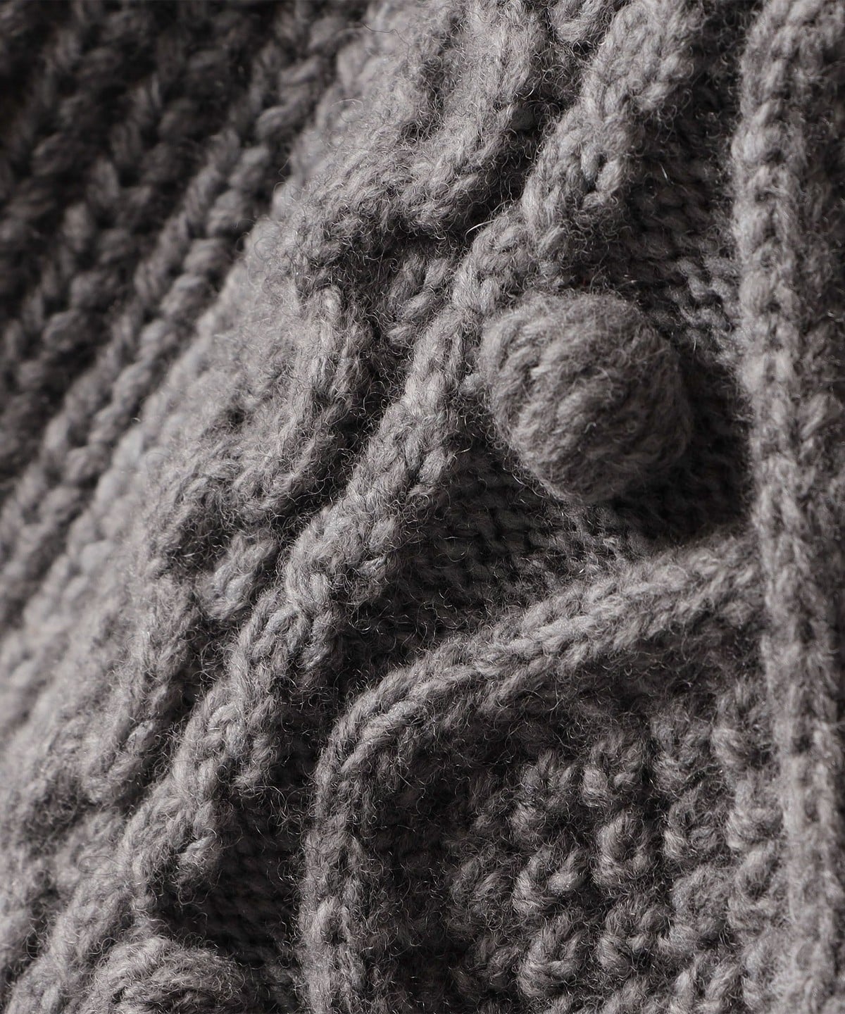 非常に膨らみがあり、嵩高で、軽いのが特徴のオーストラリアのメリノ種が原料の紡毛糸と、ポリエステルを一緒にアラン柄に編みたてたました。