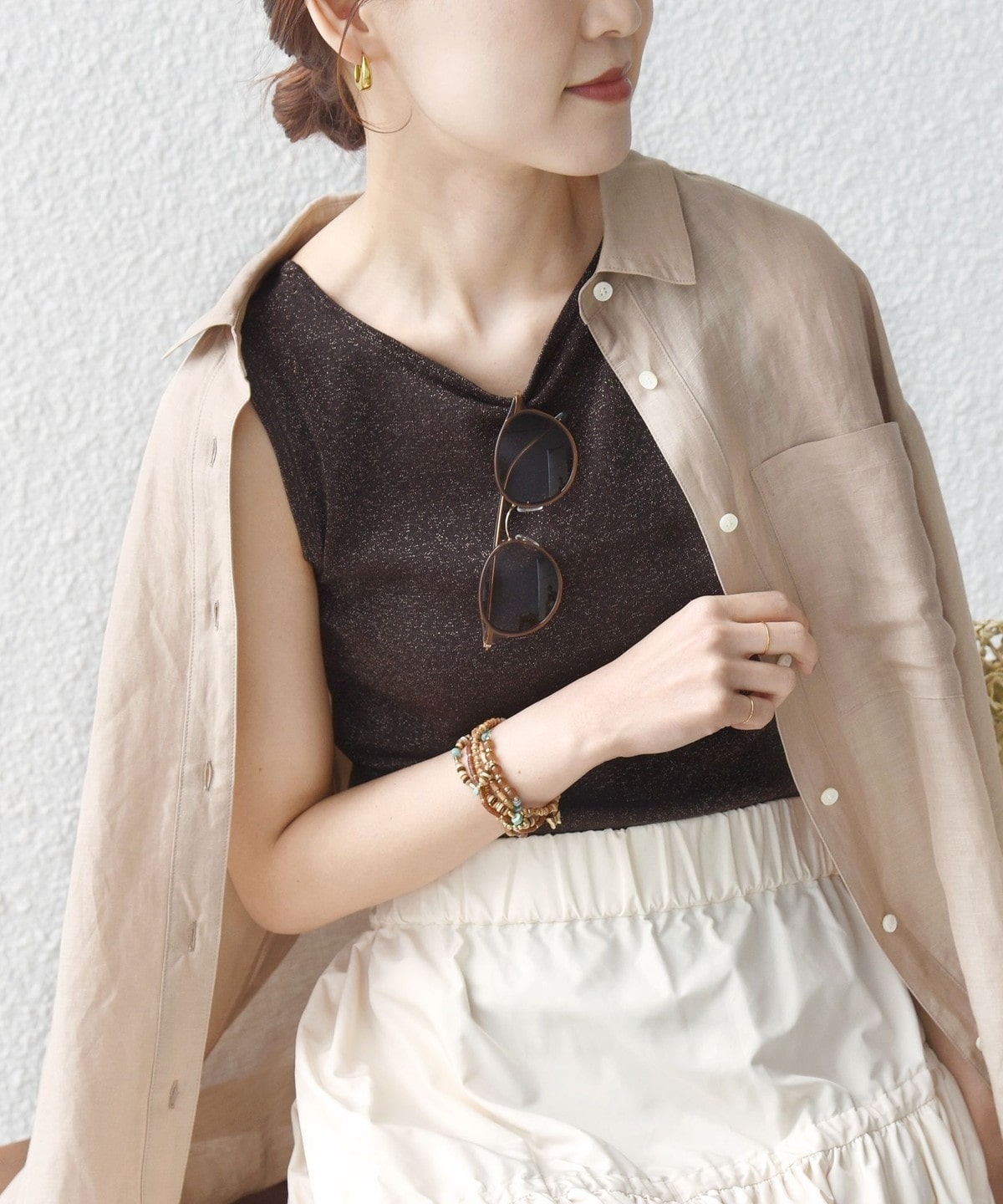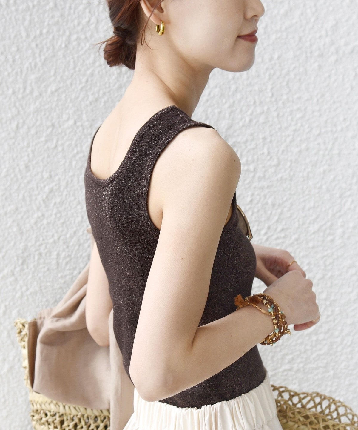 シャツやジャケットのインナーとしても合わせやすく、程よくヘルシーな肌見せを演出します。