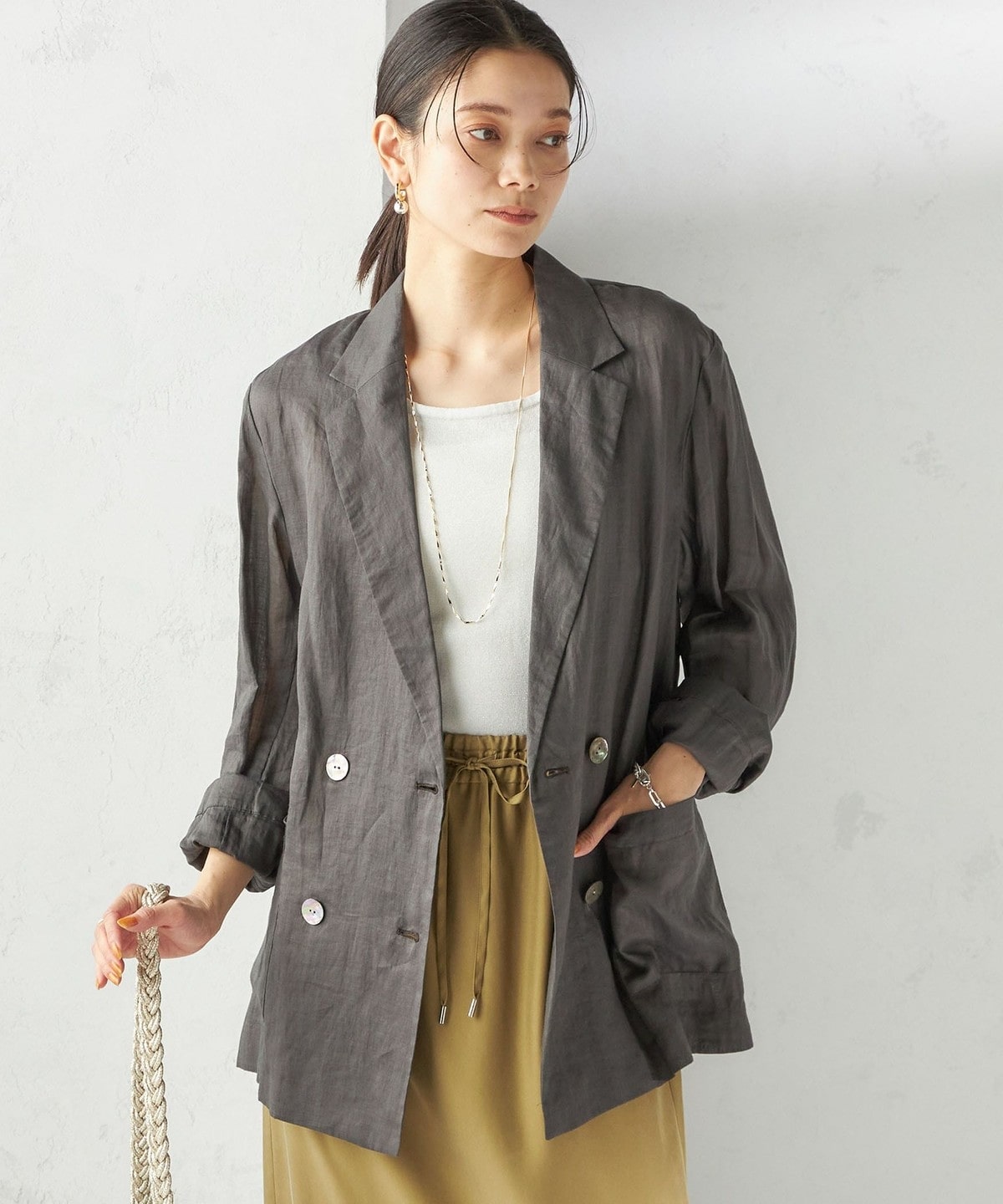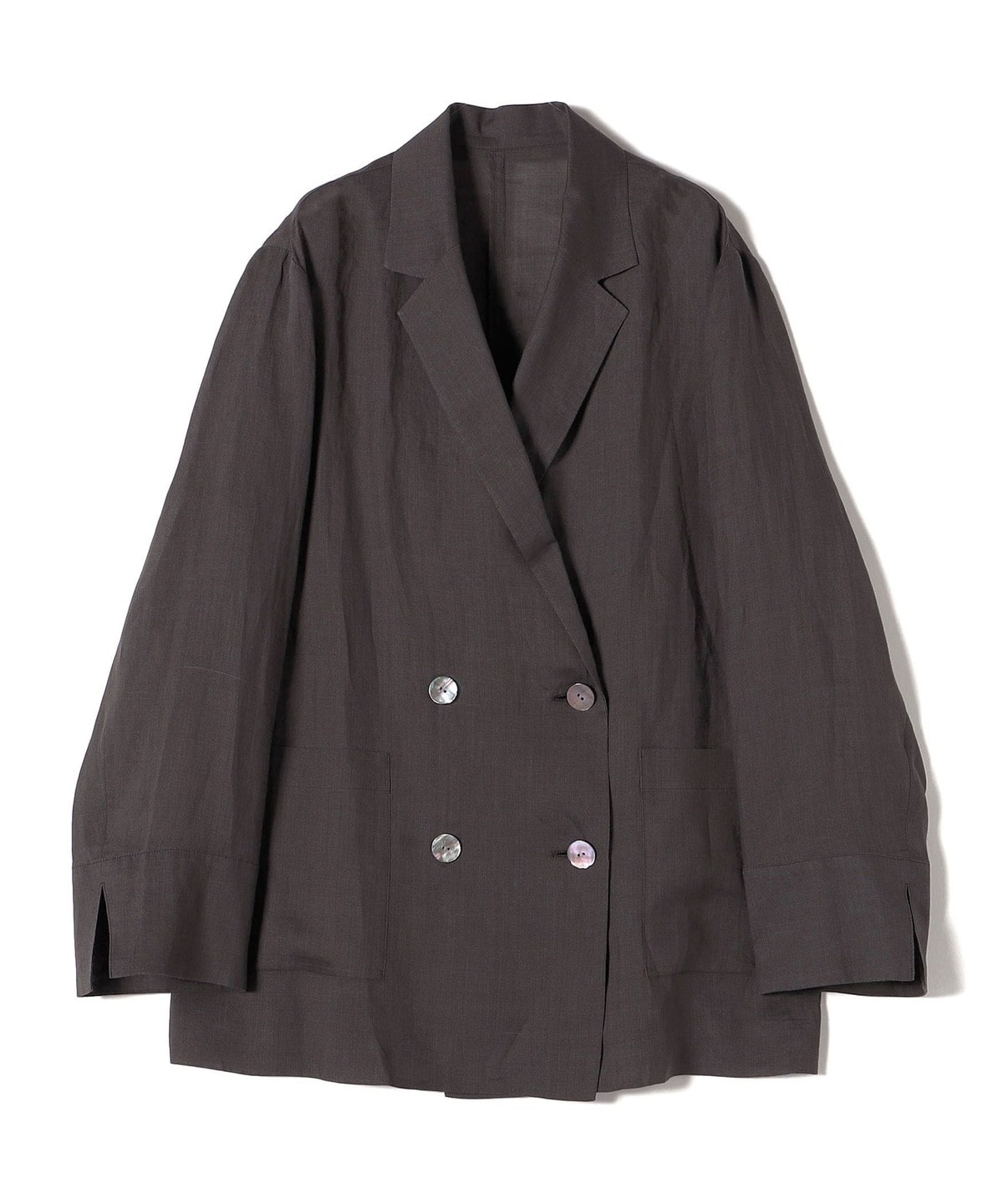 テーラードのダブルブレストのシンプルな形で、ゆったりとした身頃感がポイントの羽織ジャケットです。