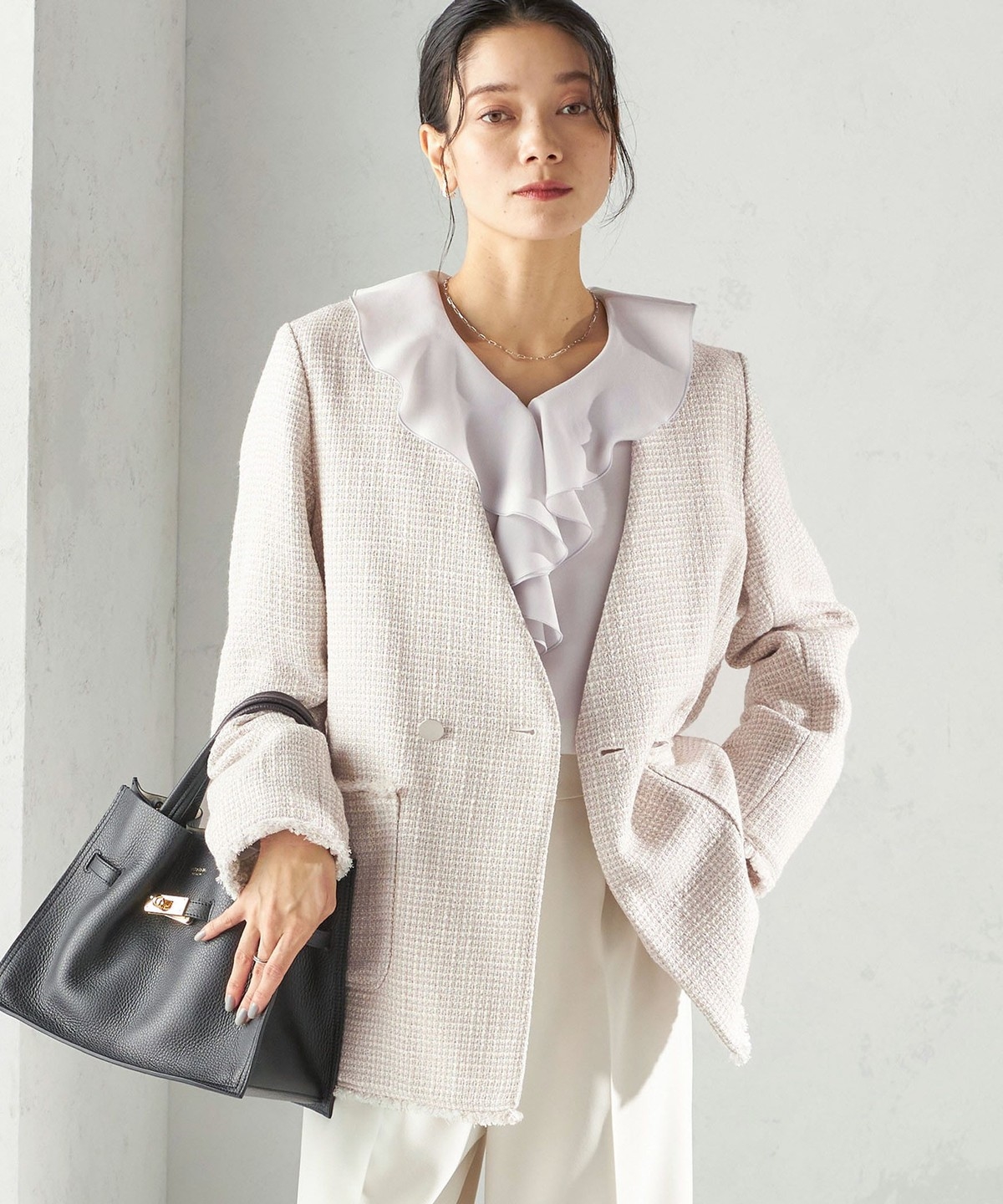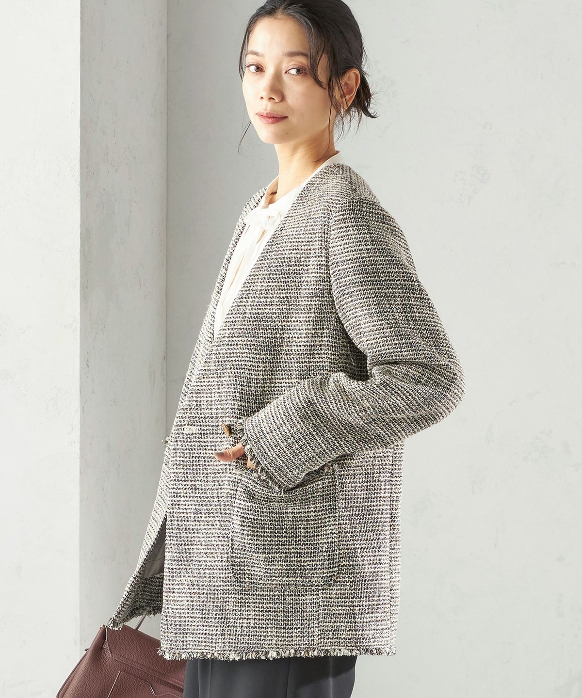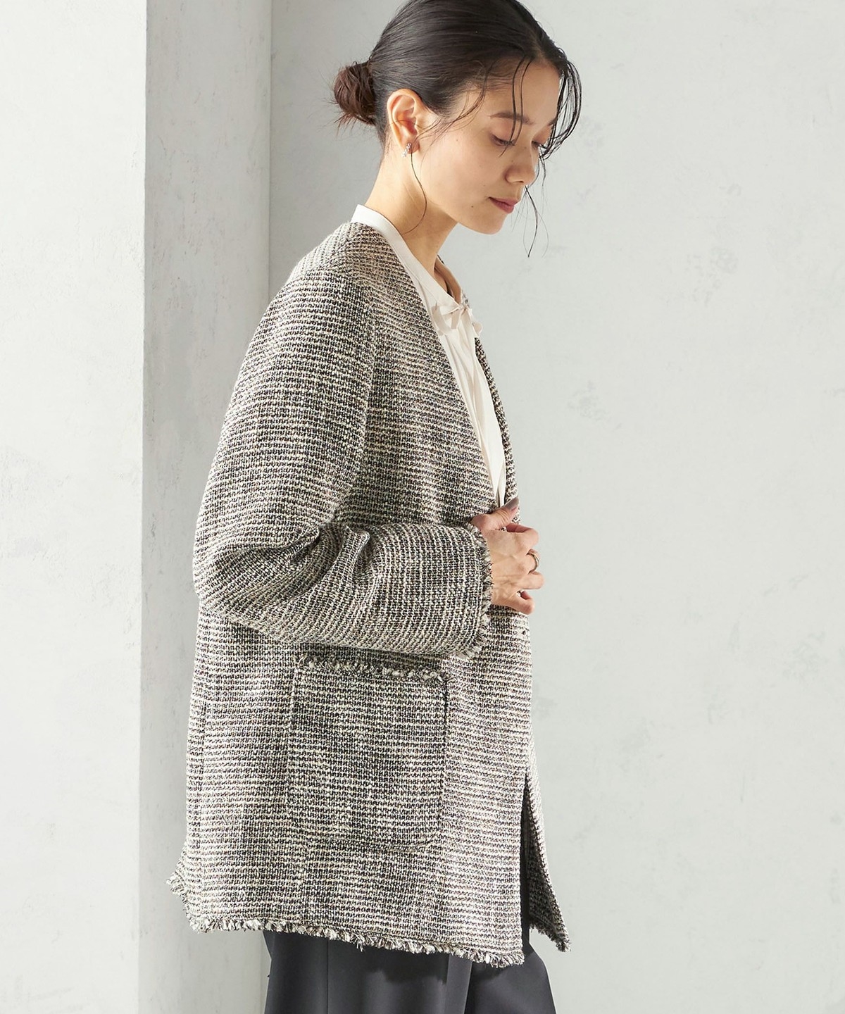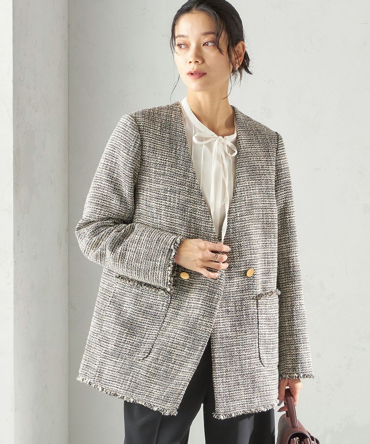 カラーレスで首元がすっきり見えるツイードジャケット。
