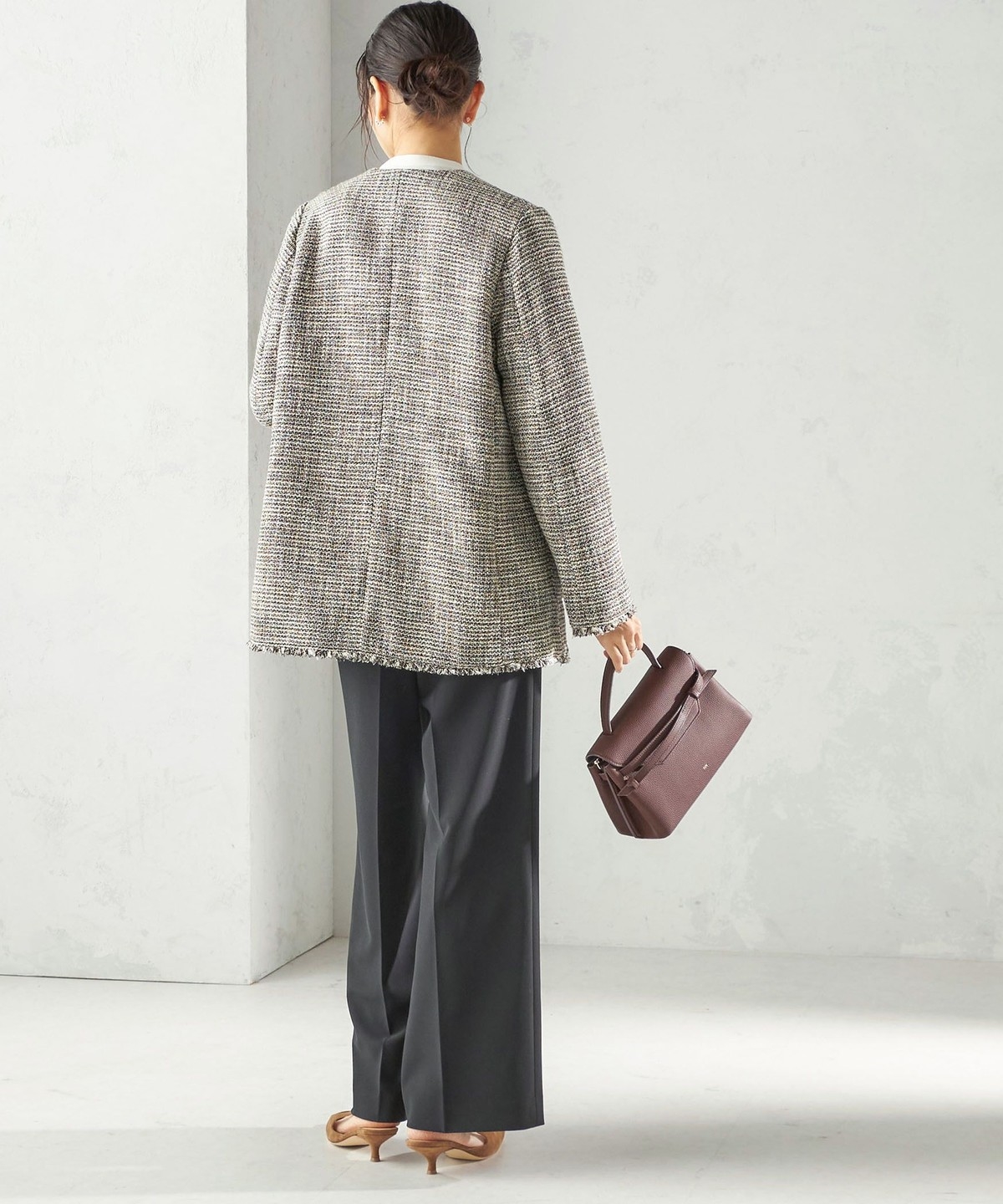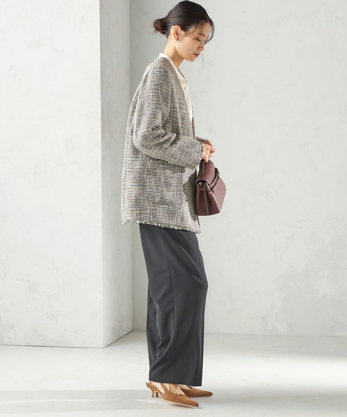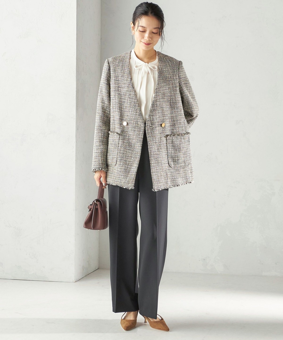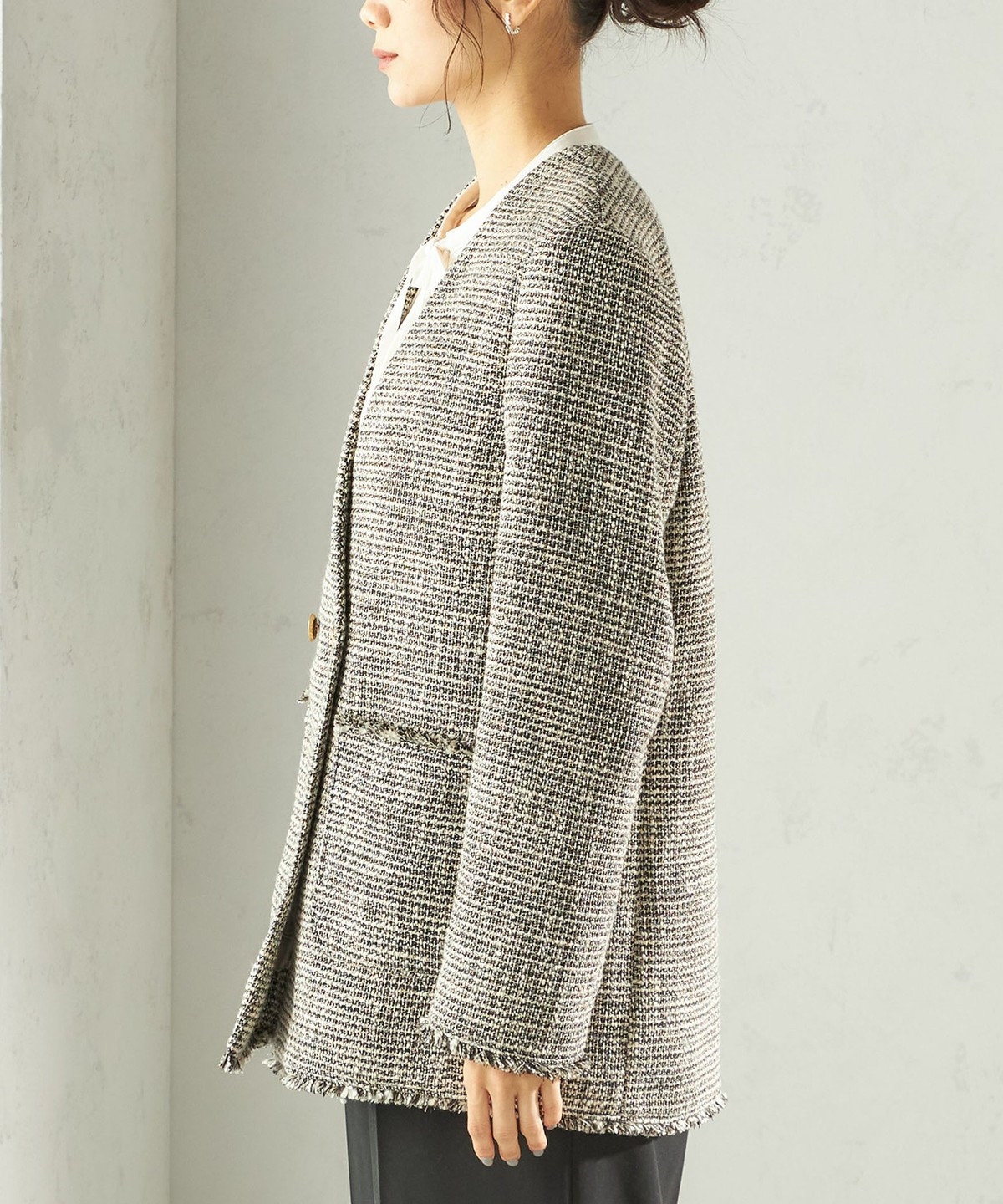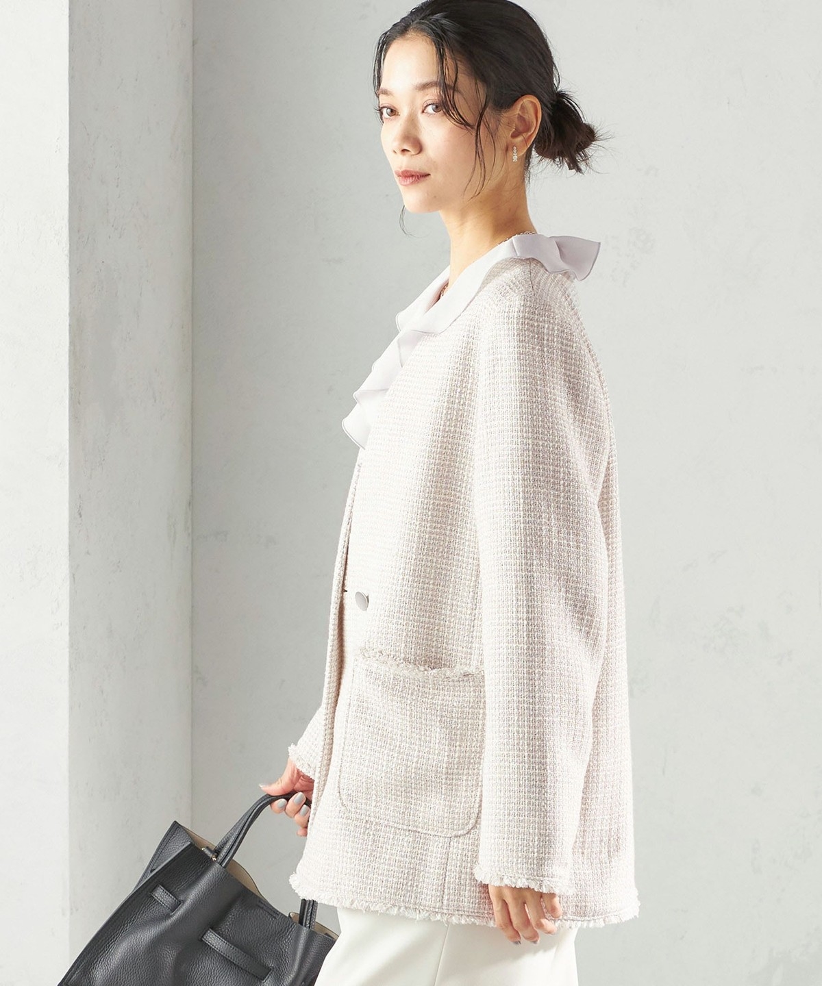 カラーレスで首元がすっきり見えるツイードジャケット。