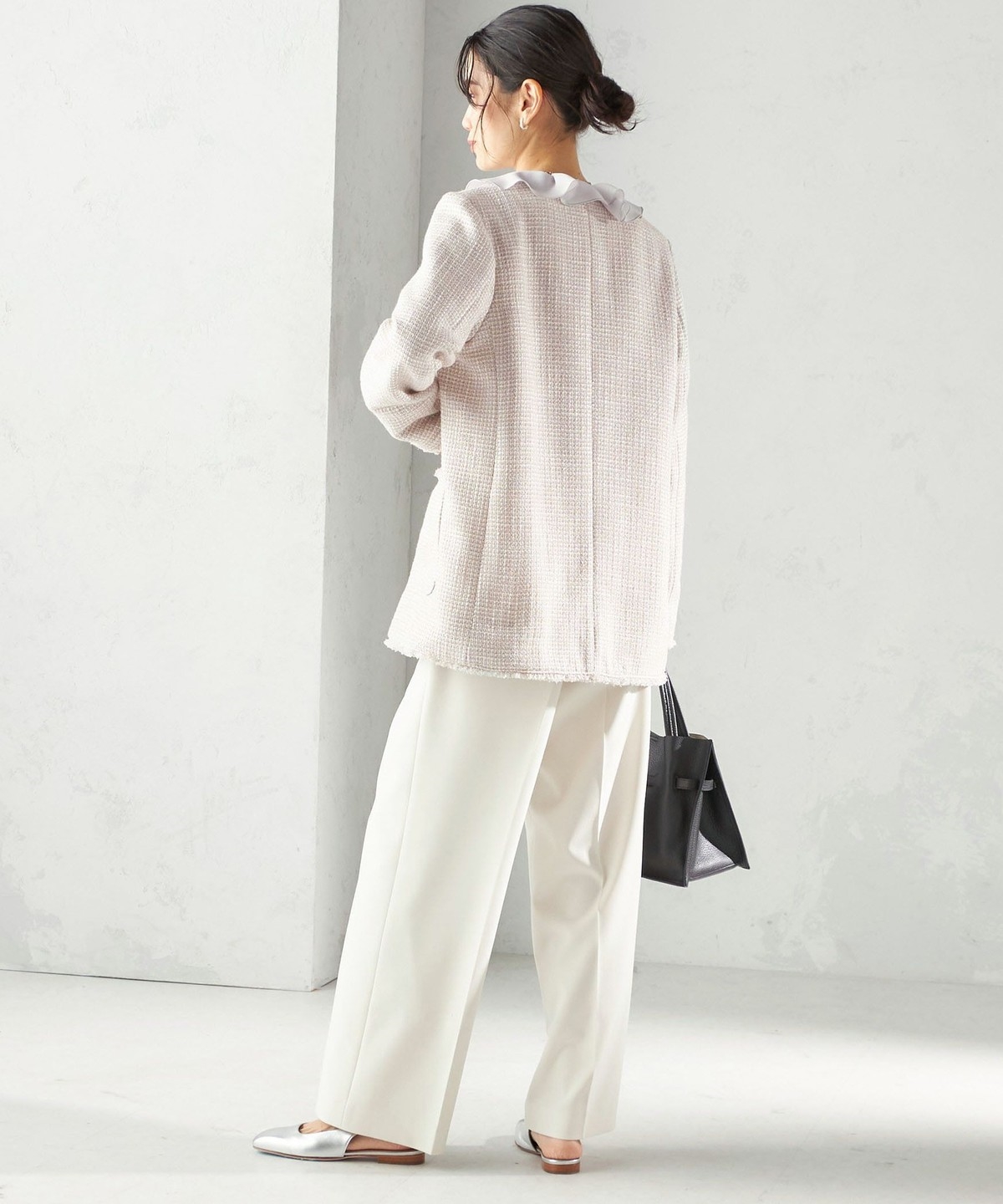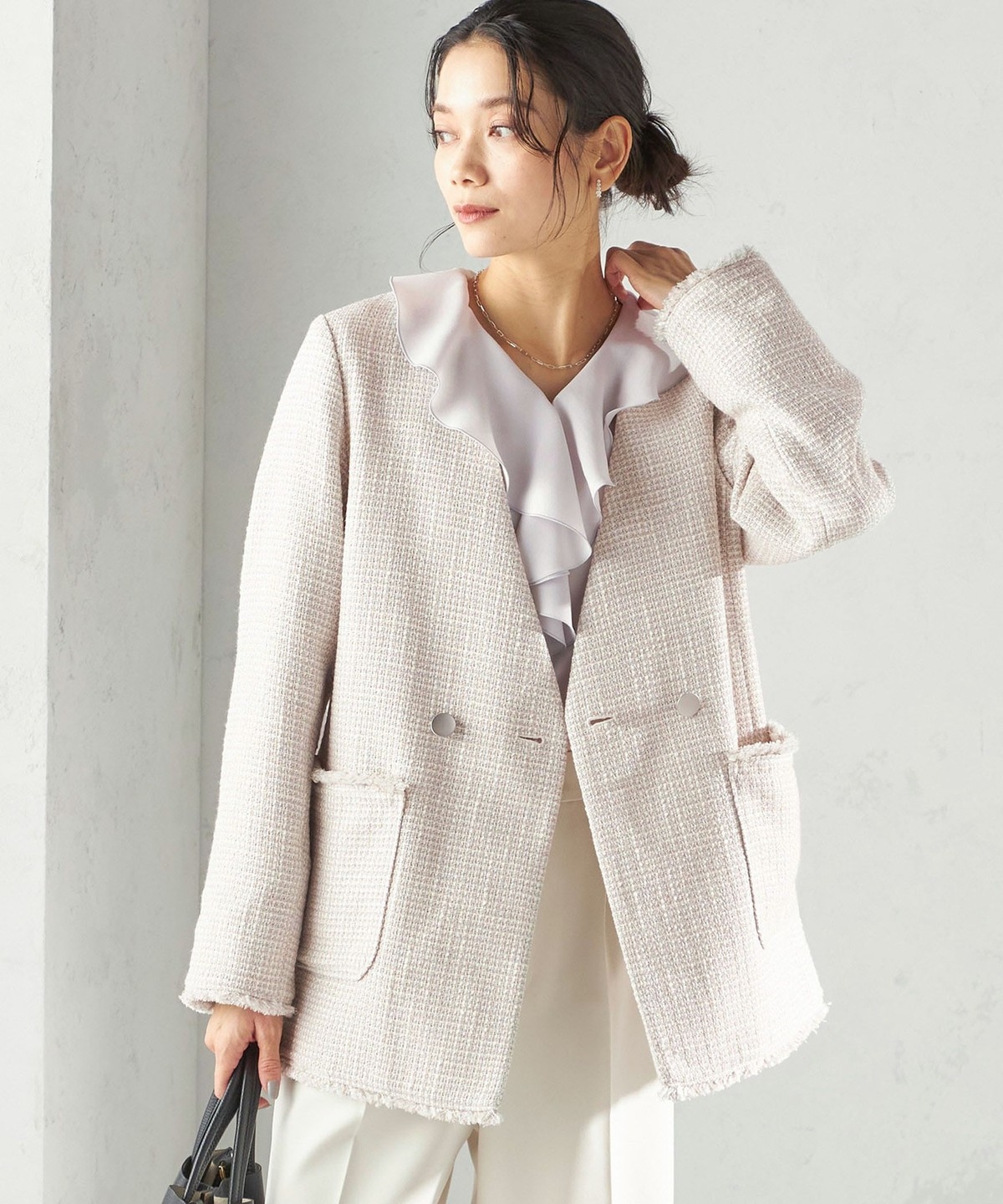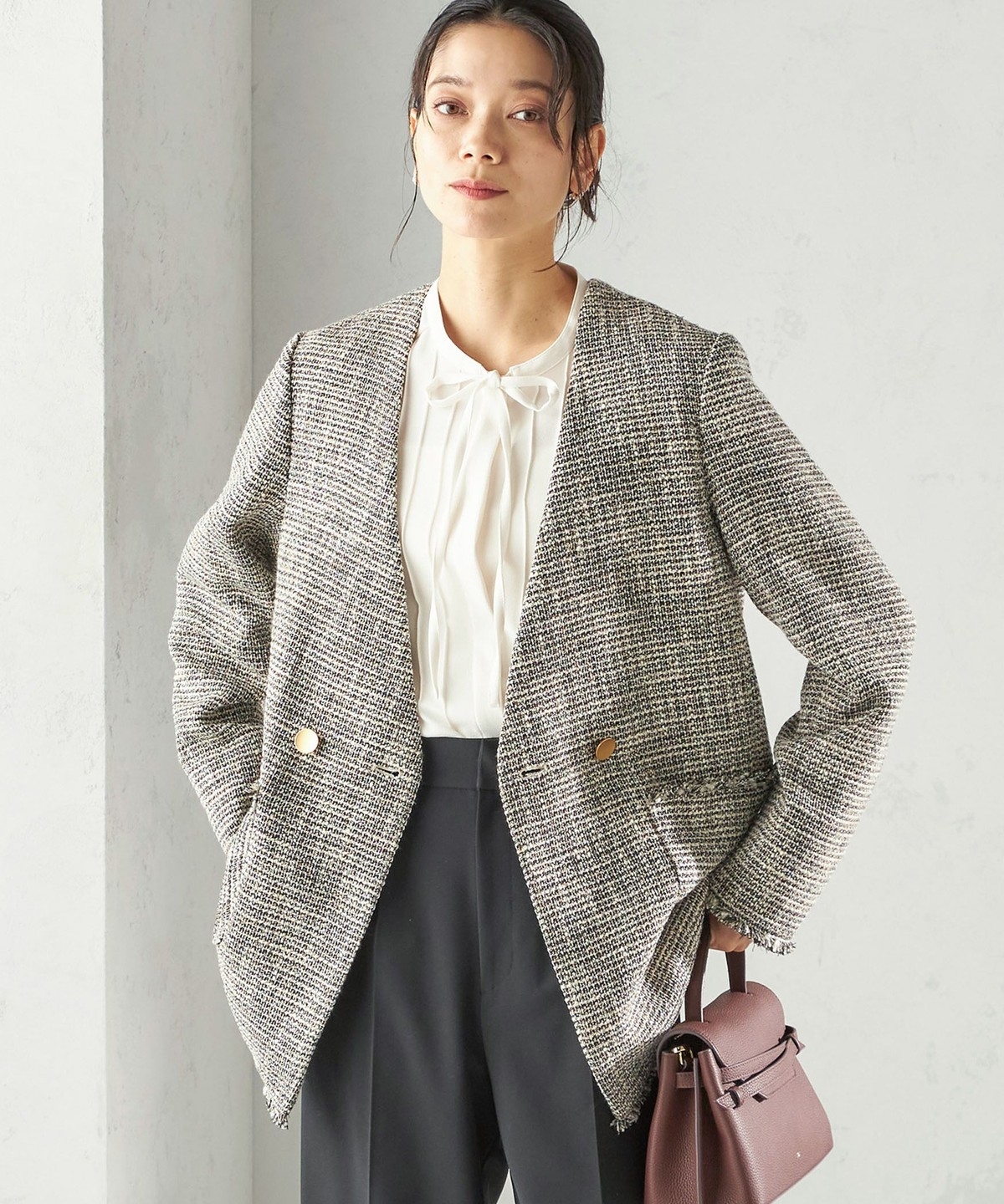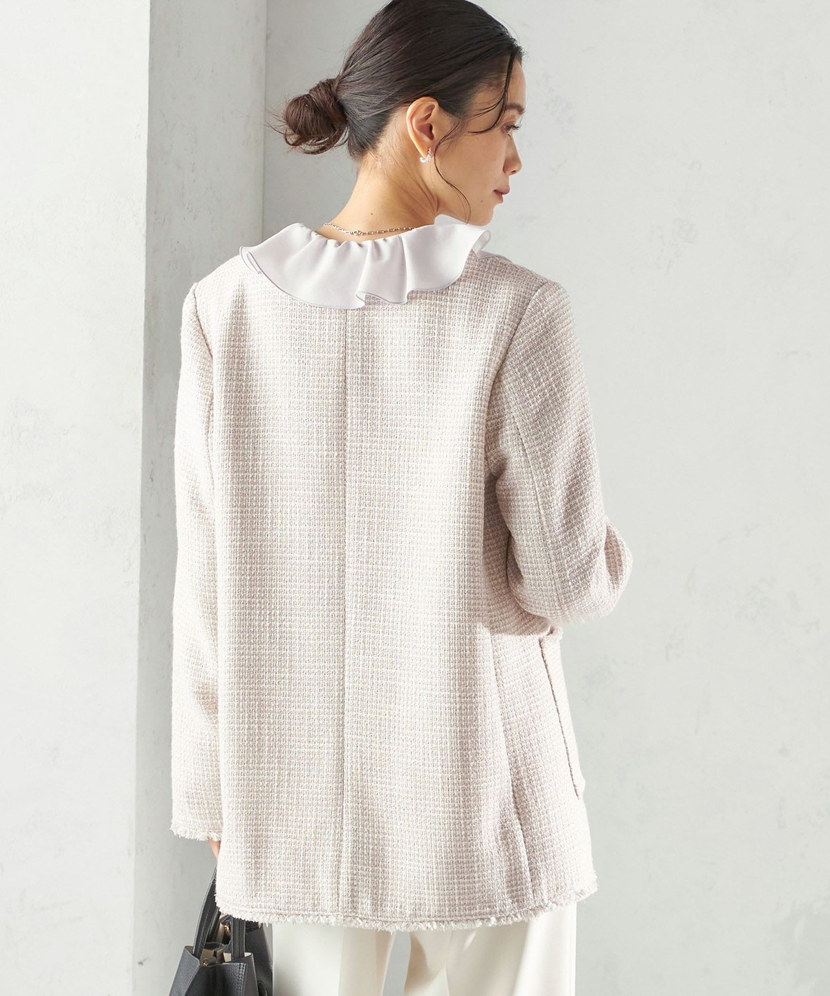 カラーレスで首元がすっきり見えるツイードジャケット。