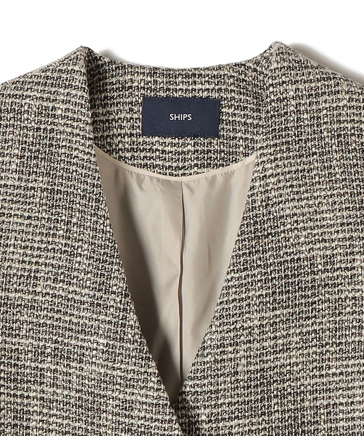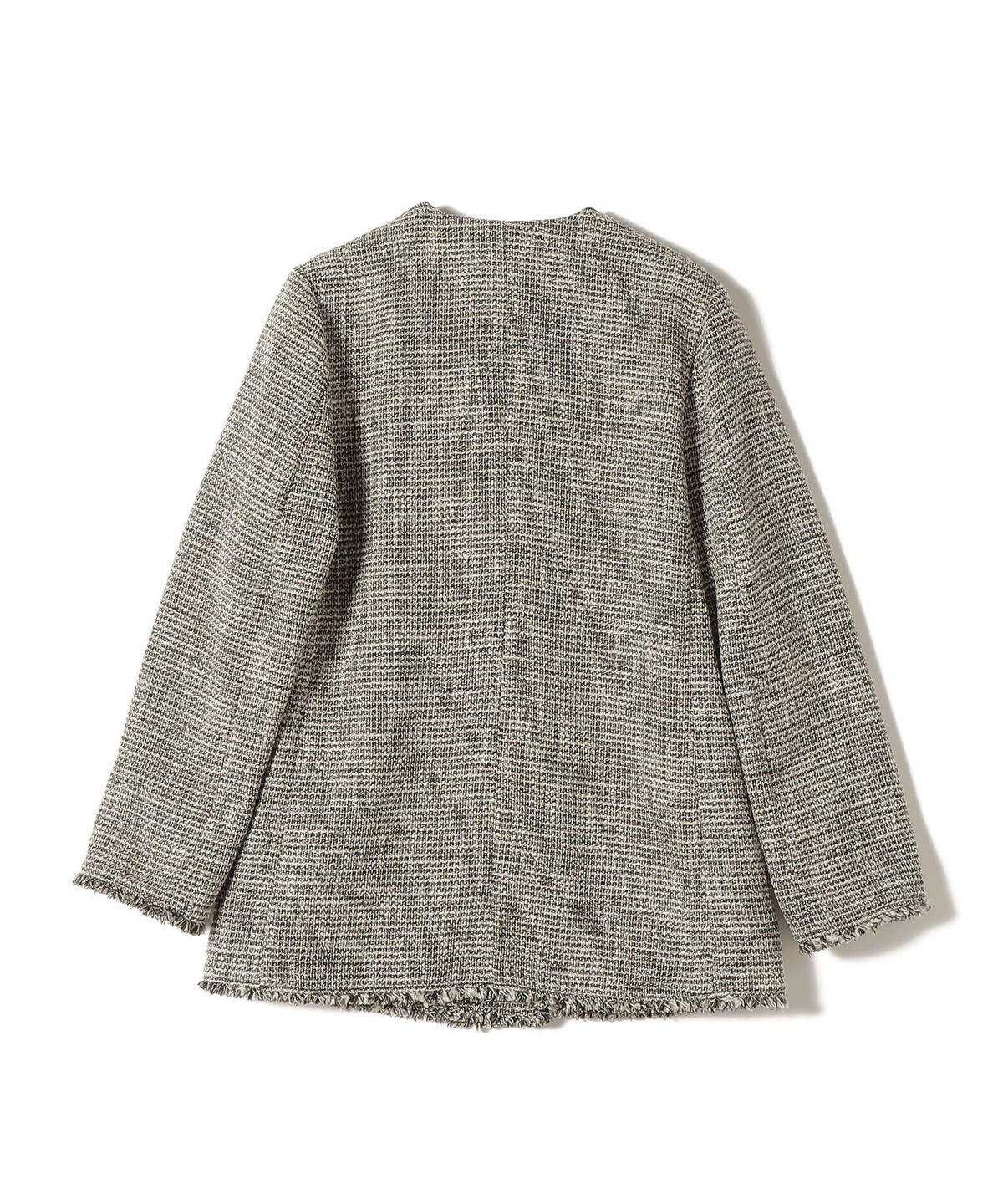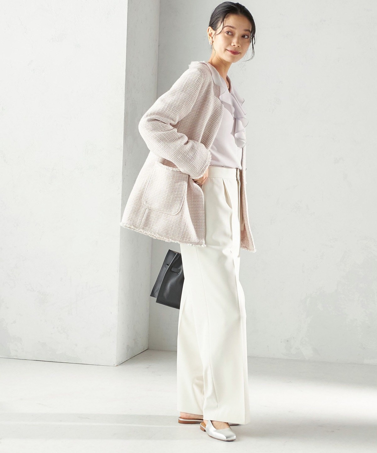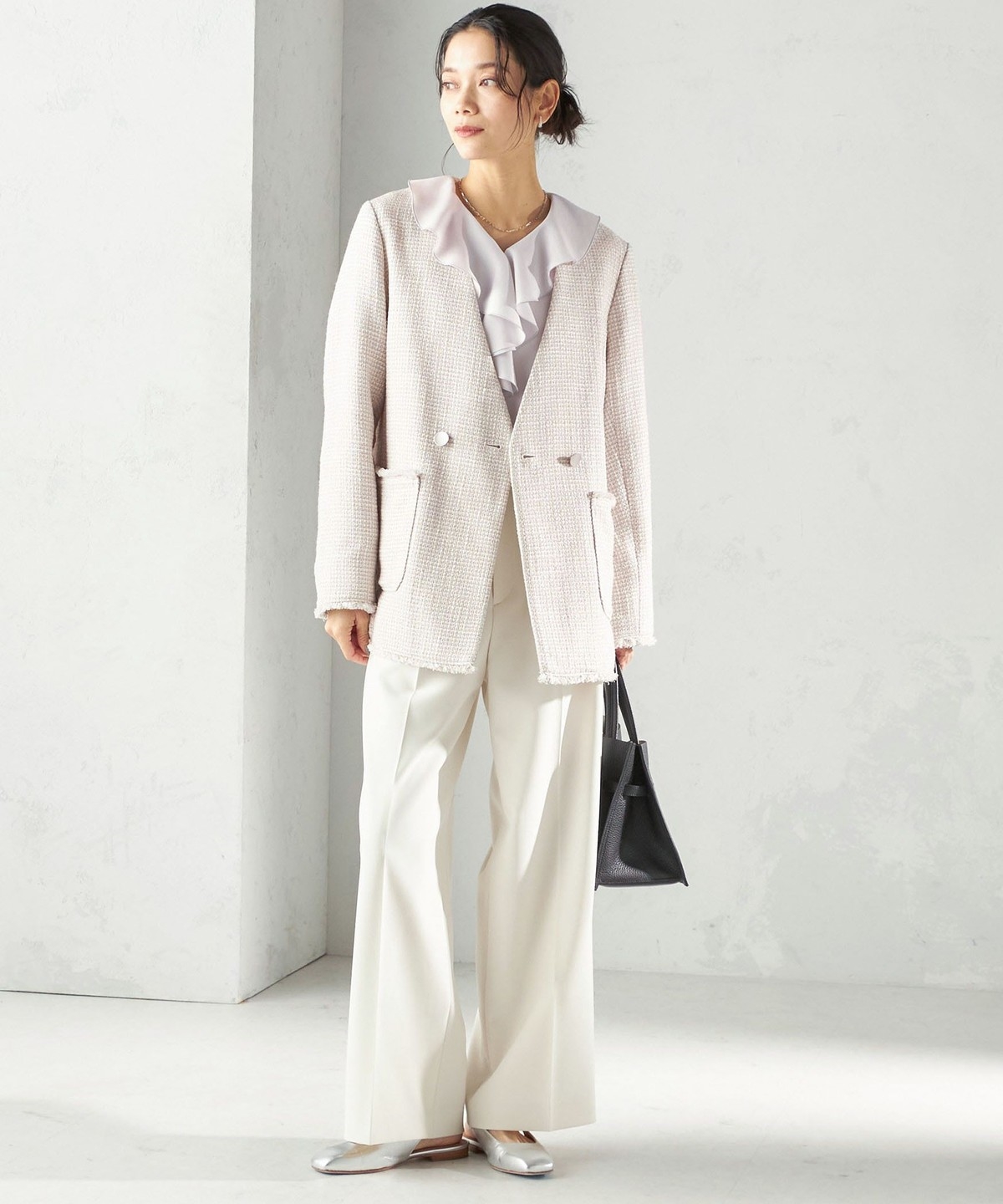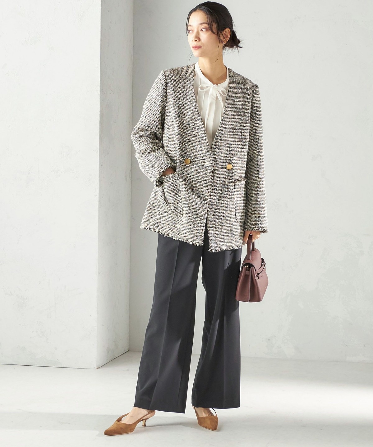 カラーレスで首元がすっきり見えるツイードジャケット。