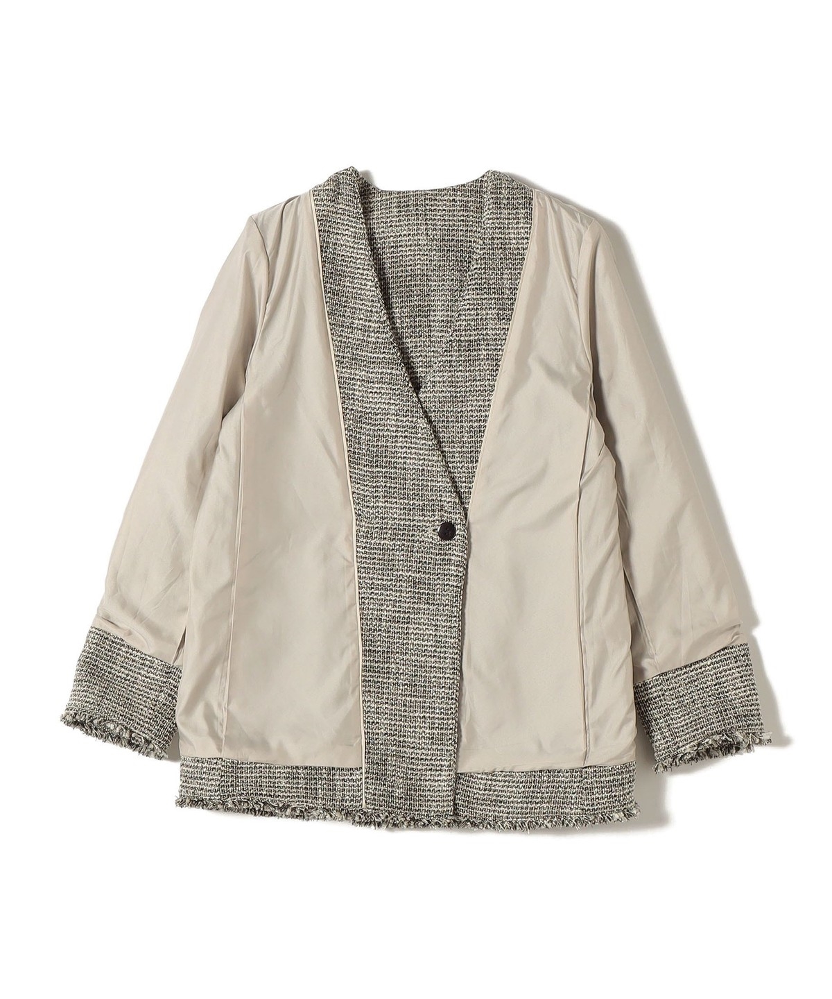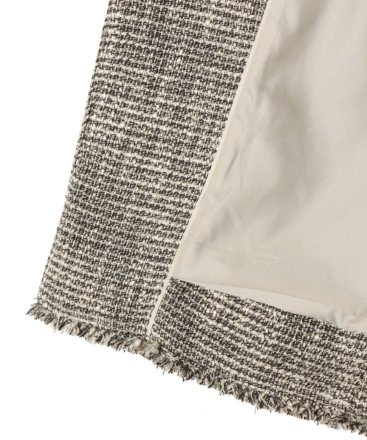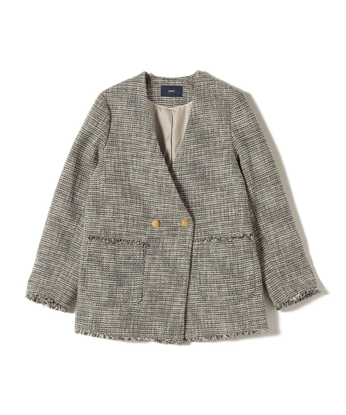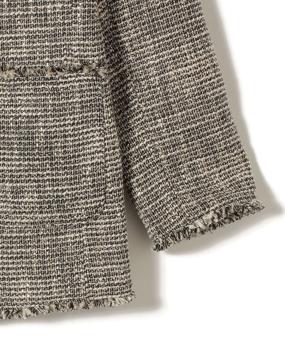 カラーレスで首元がすっきり見えるツイードジャケット。
