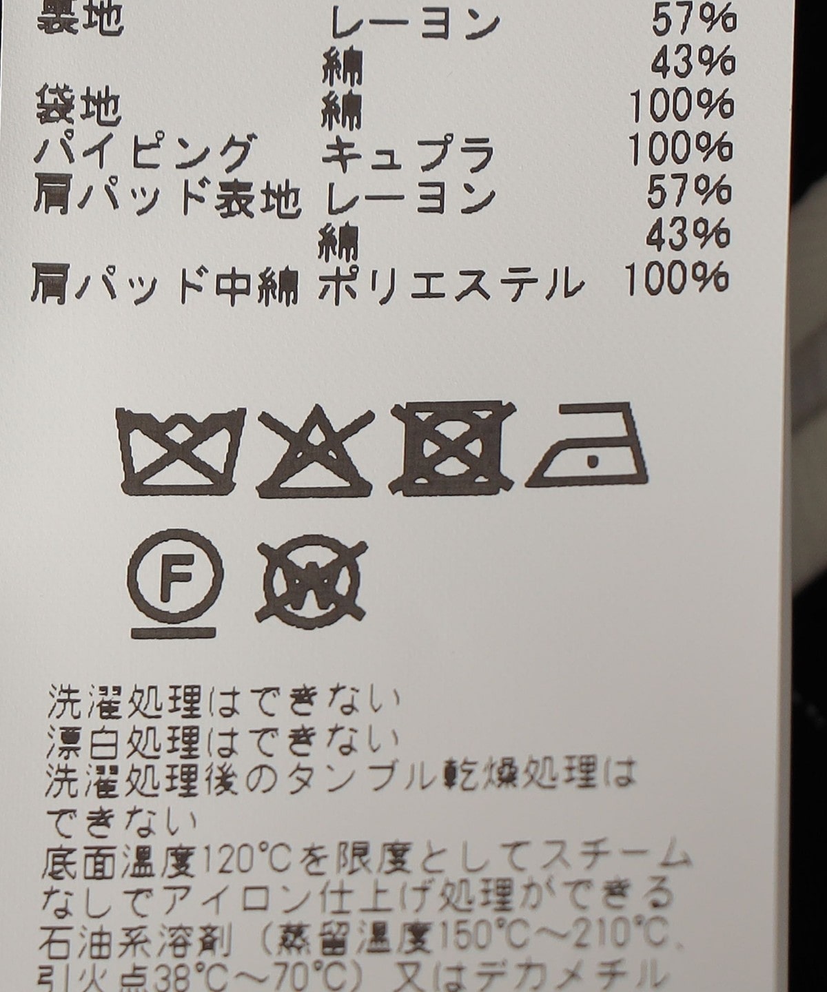 素材:表地: キュプラ100%, 裏地: レーヨン57%, 綿43%, 袋地: 綿100%, パイピング: キュプラ100%, 肩パッド表地: レーヨン57%, 綿43%, 肩パッド中綿: ポリエステル100%