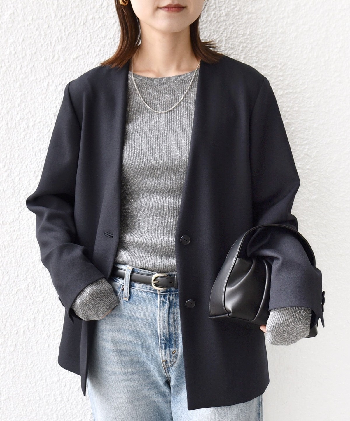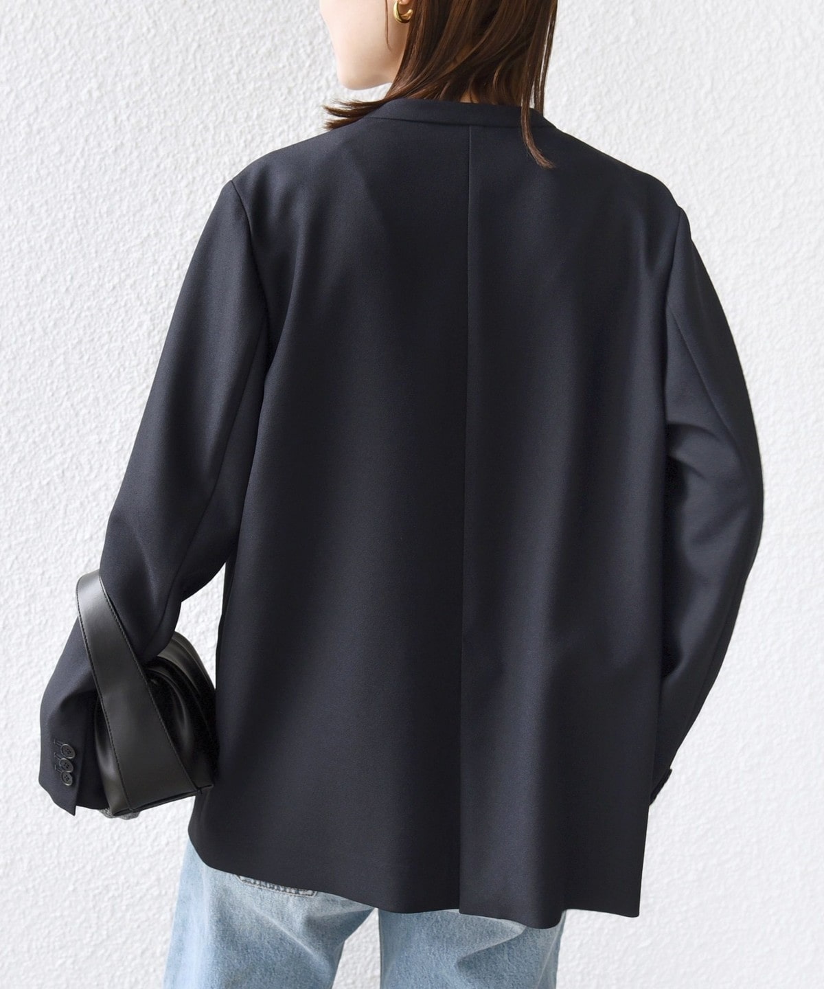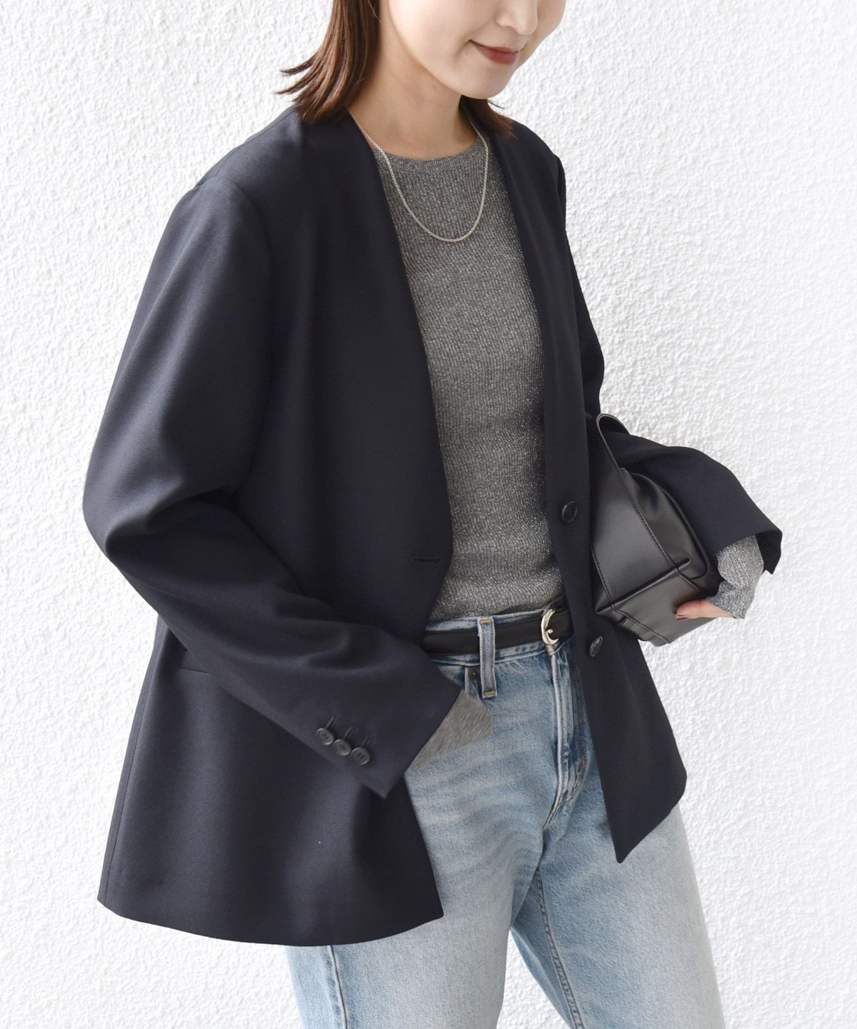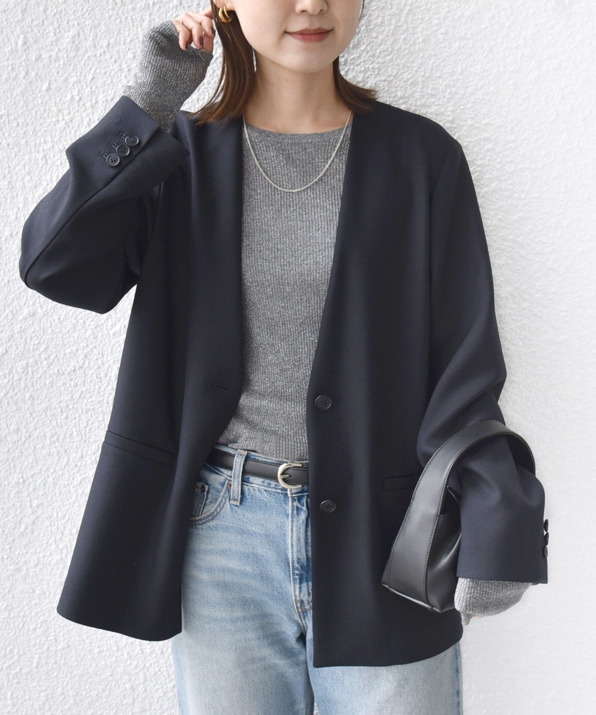 カラーレスでかっちりしすぎずに着用できるVネックジャケット。