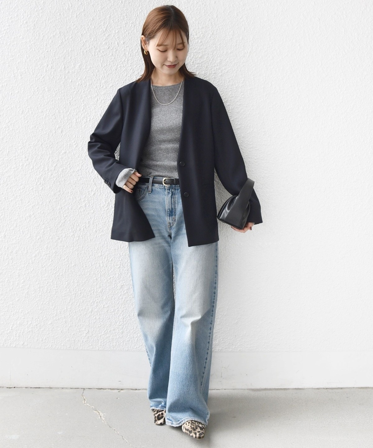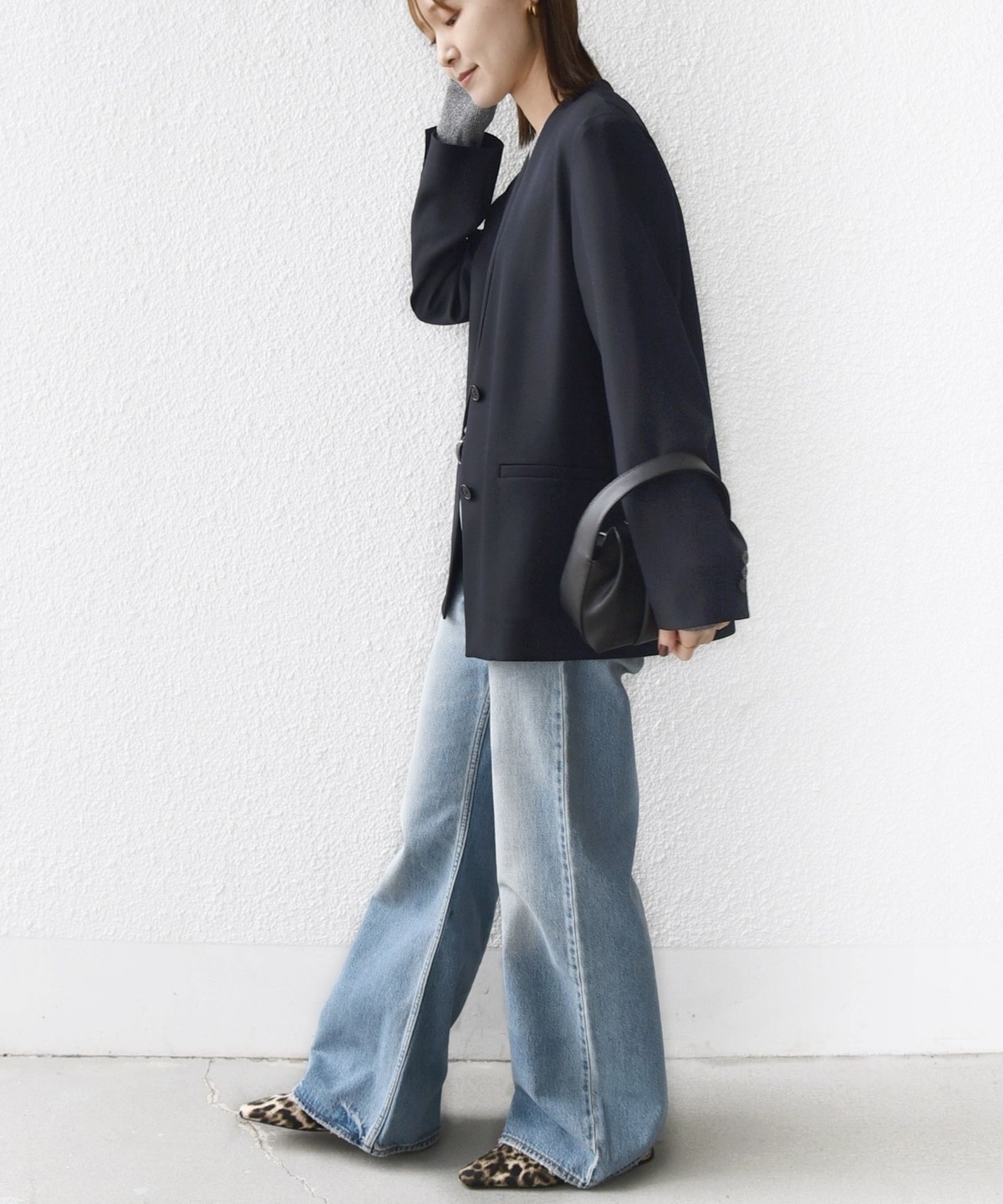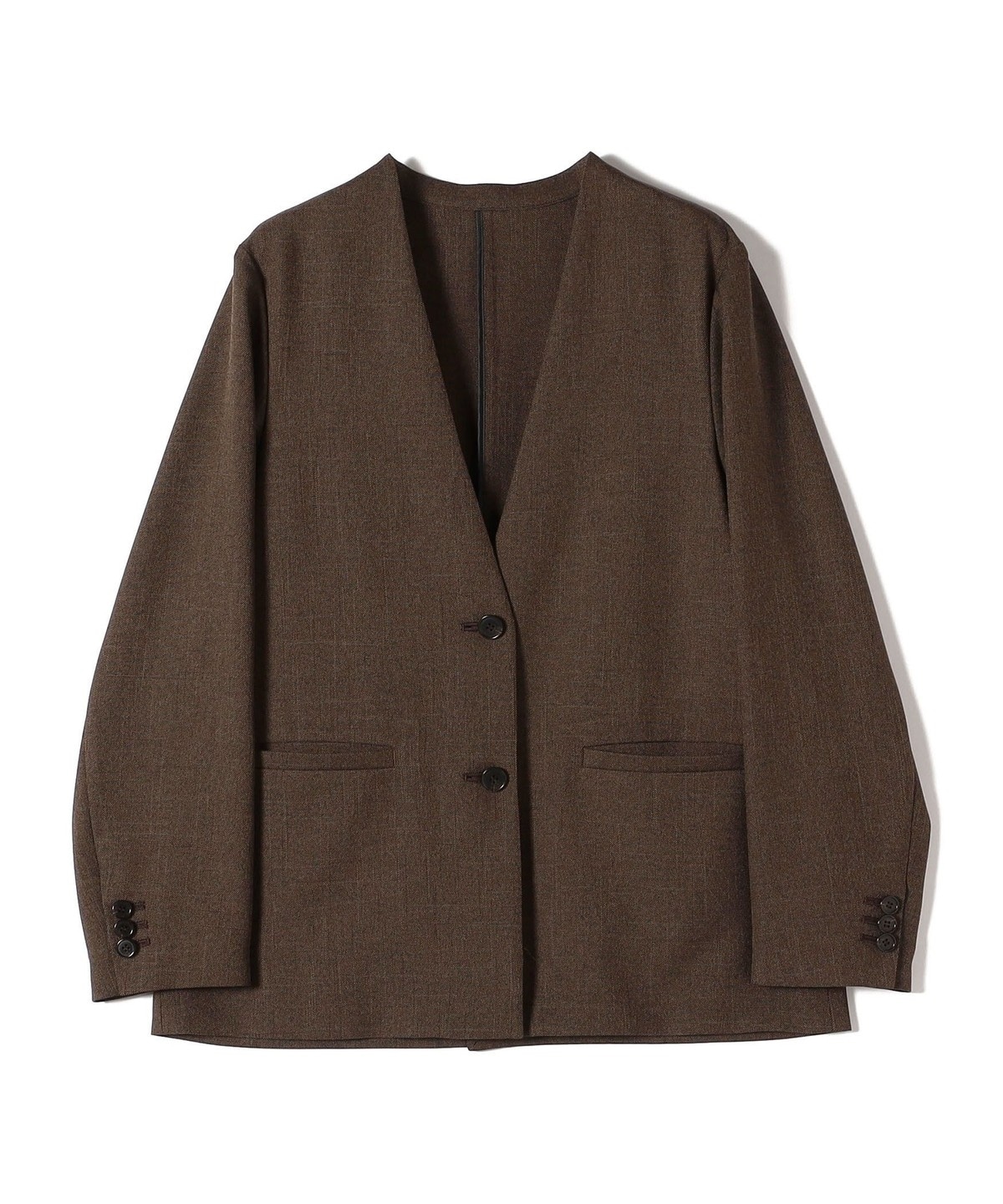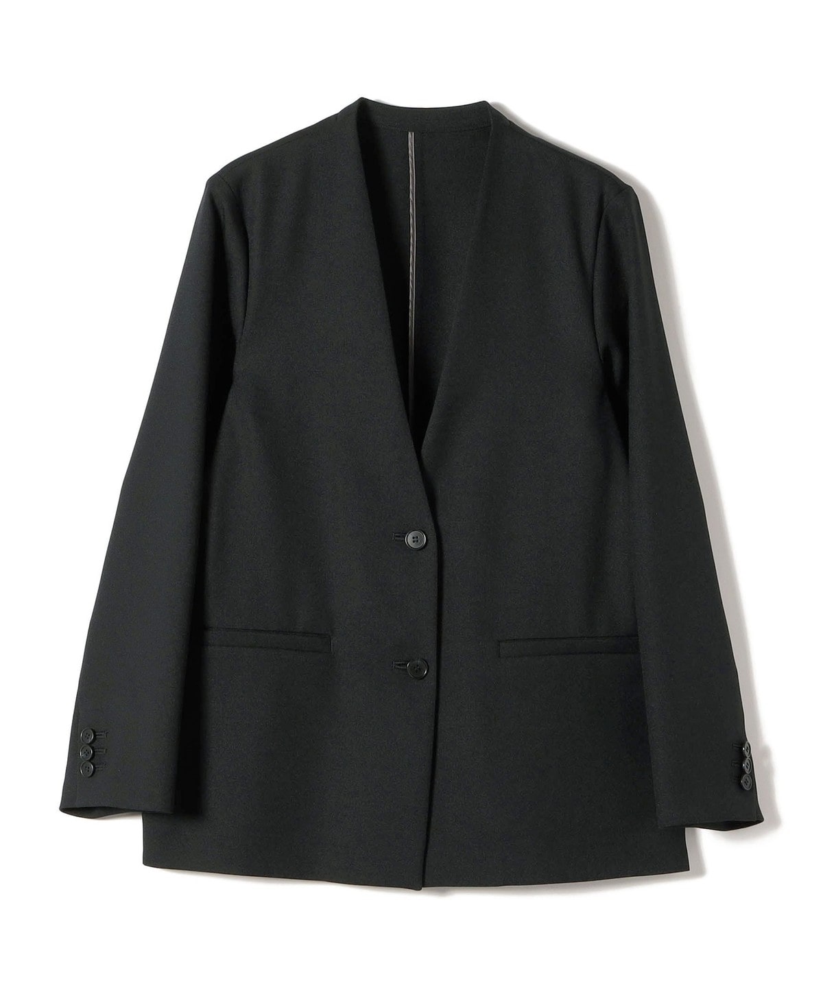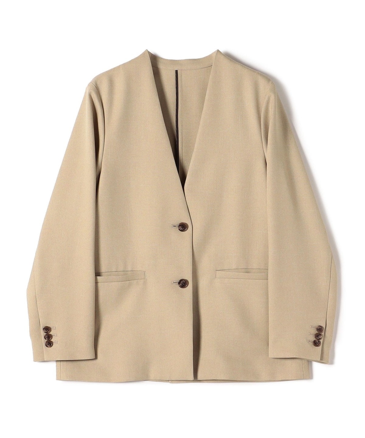 カラーレスでかっちりしすぎずに着用できるVネックジャケット。
