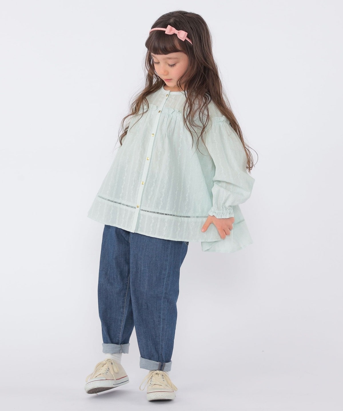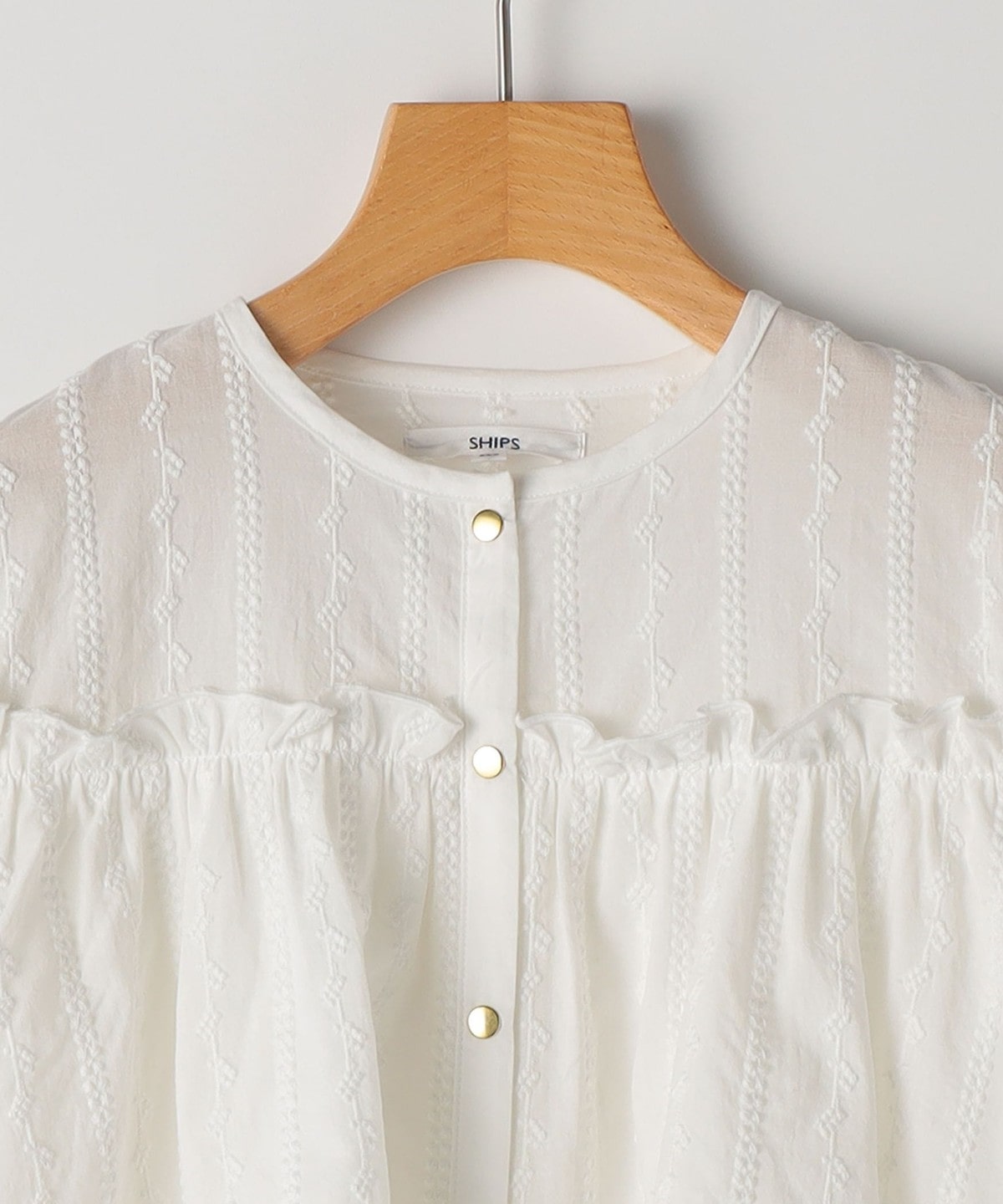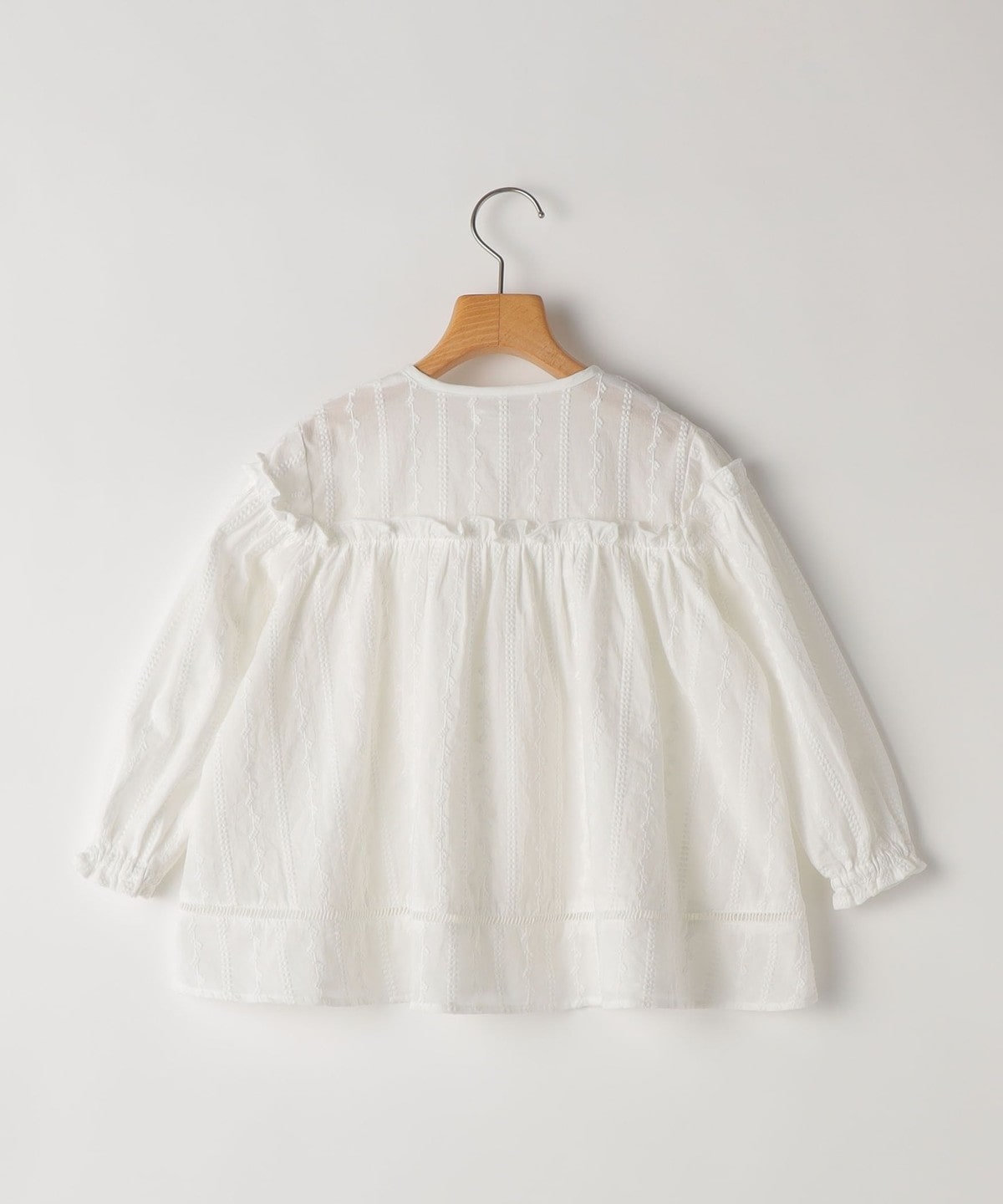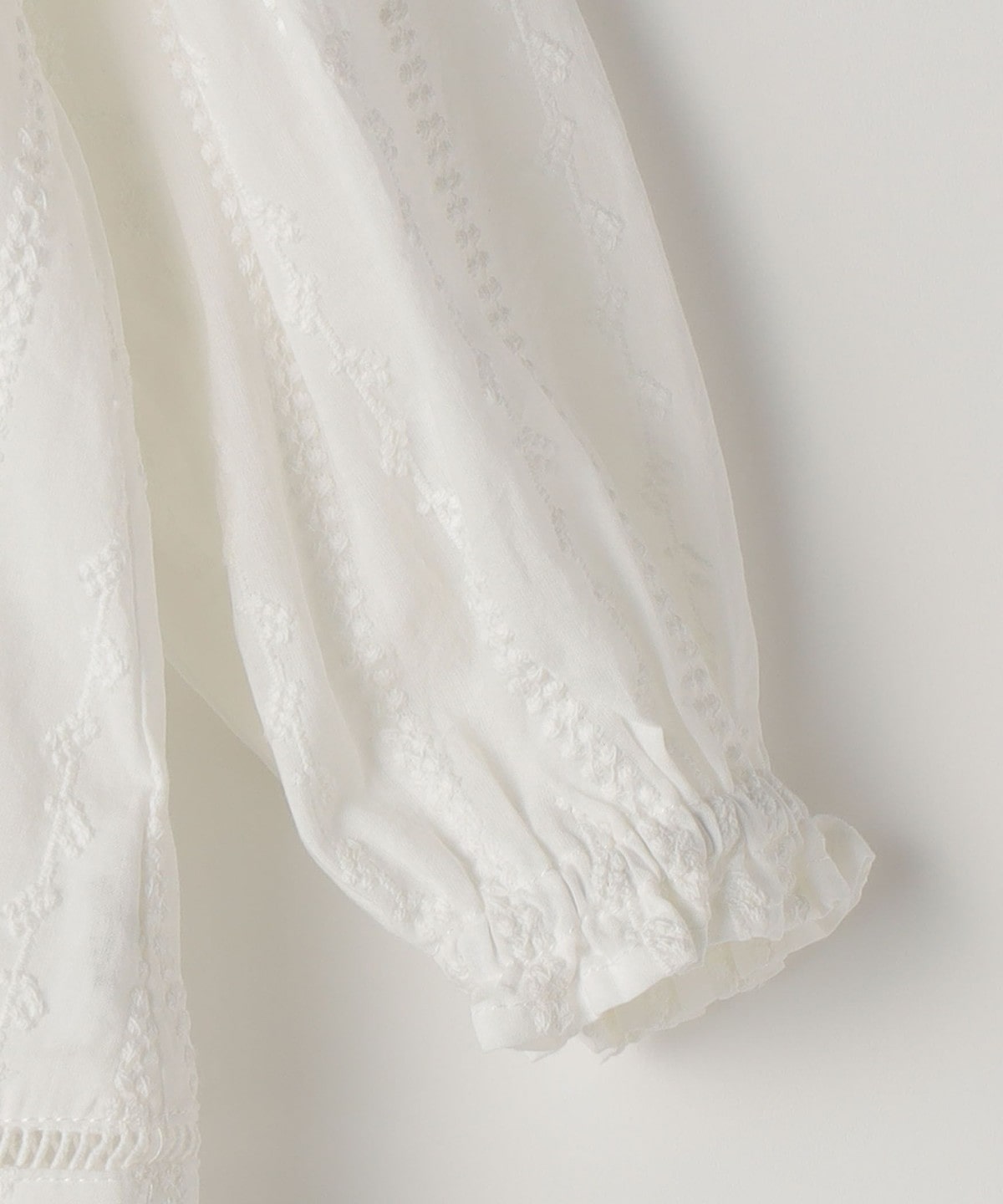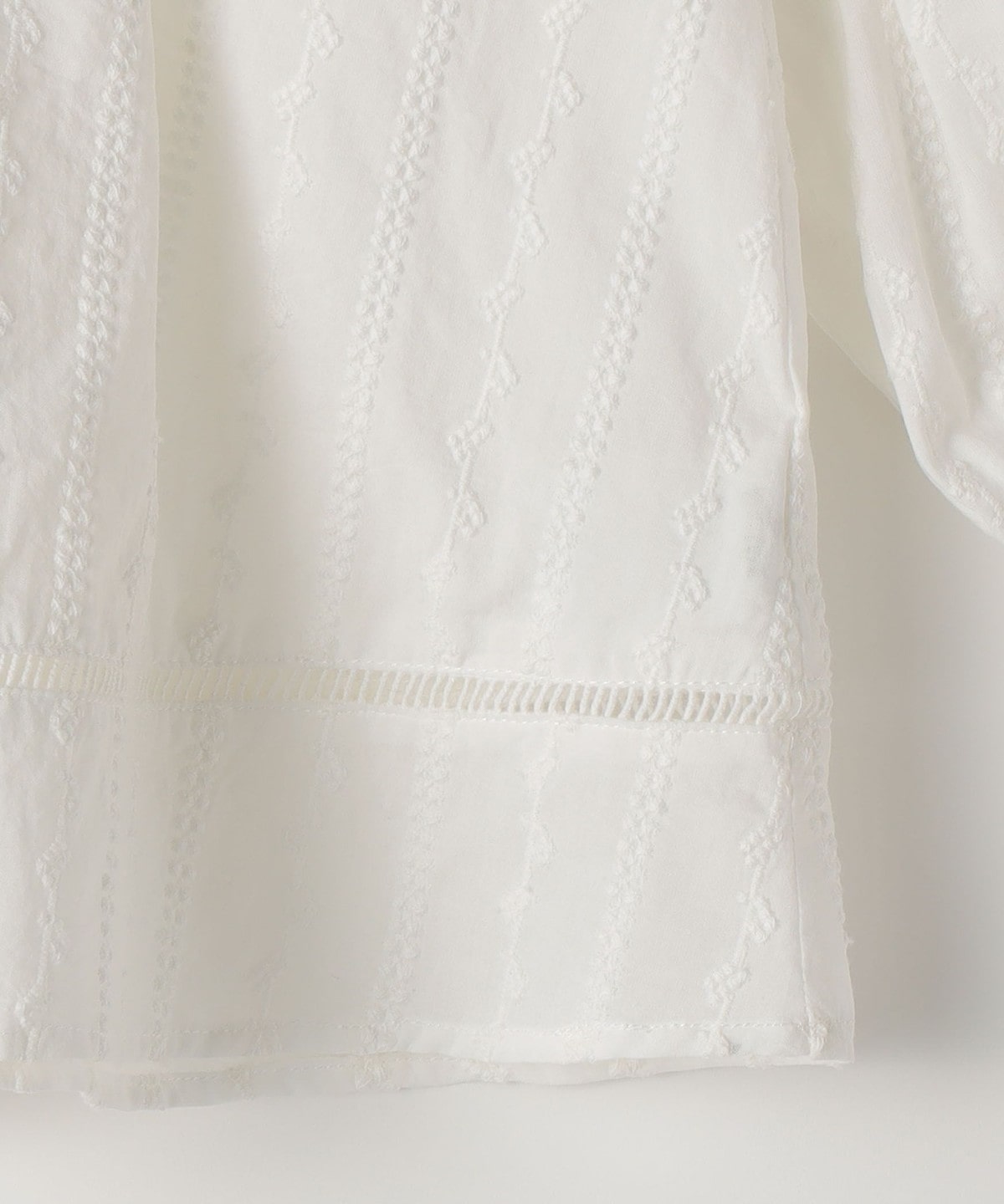 薄手の綿ローンに、繊細な刺繍をストライプ状にあしらった、やや透け感のある素材のブラウス。ふんわり軽く、思わず触れたくなるような繊細さが魅力です。