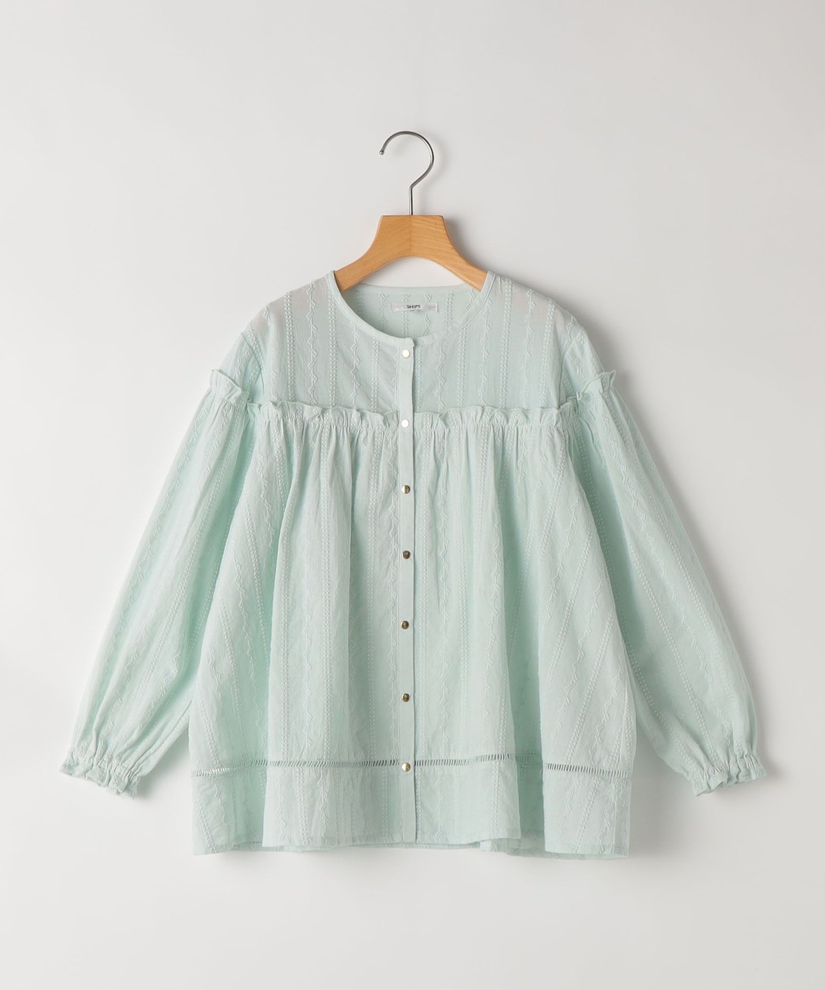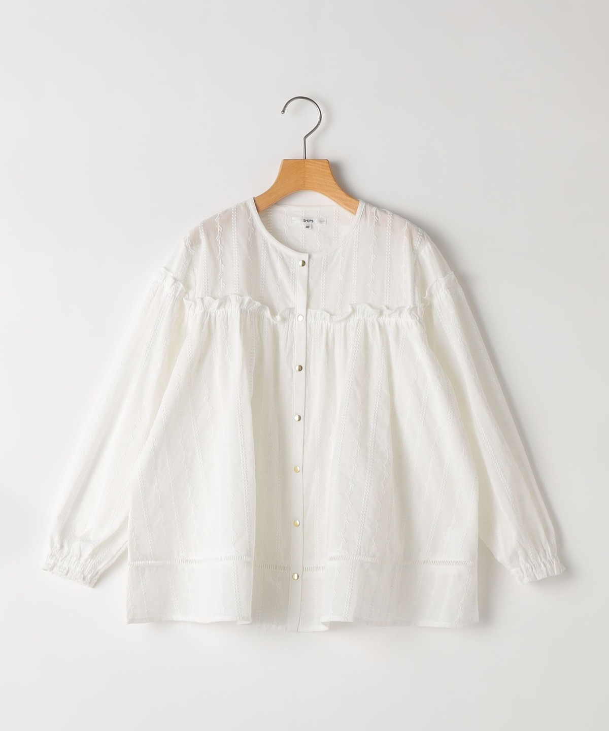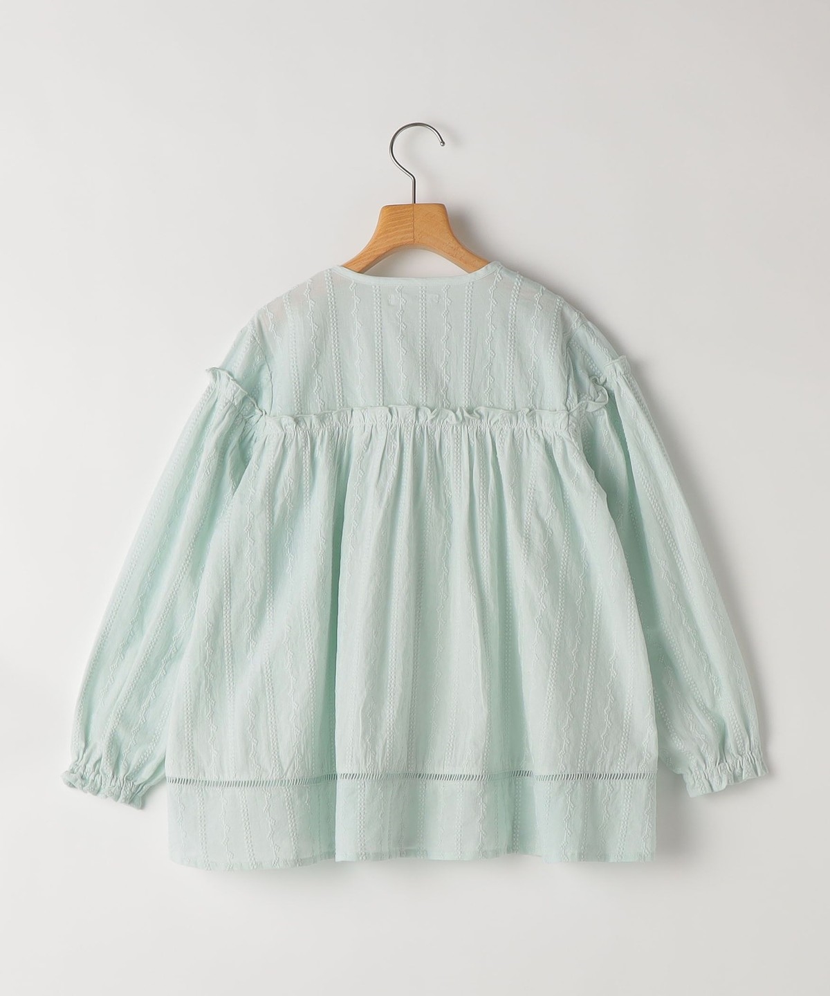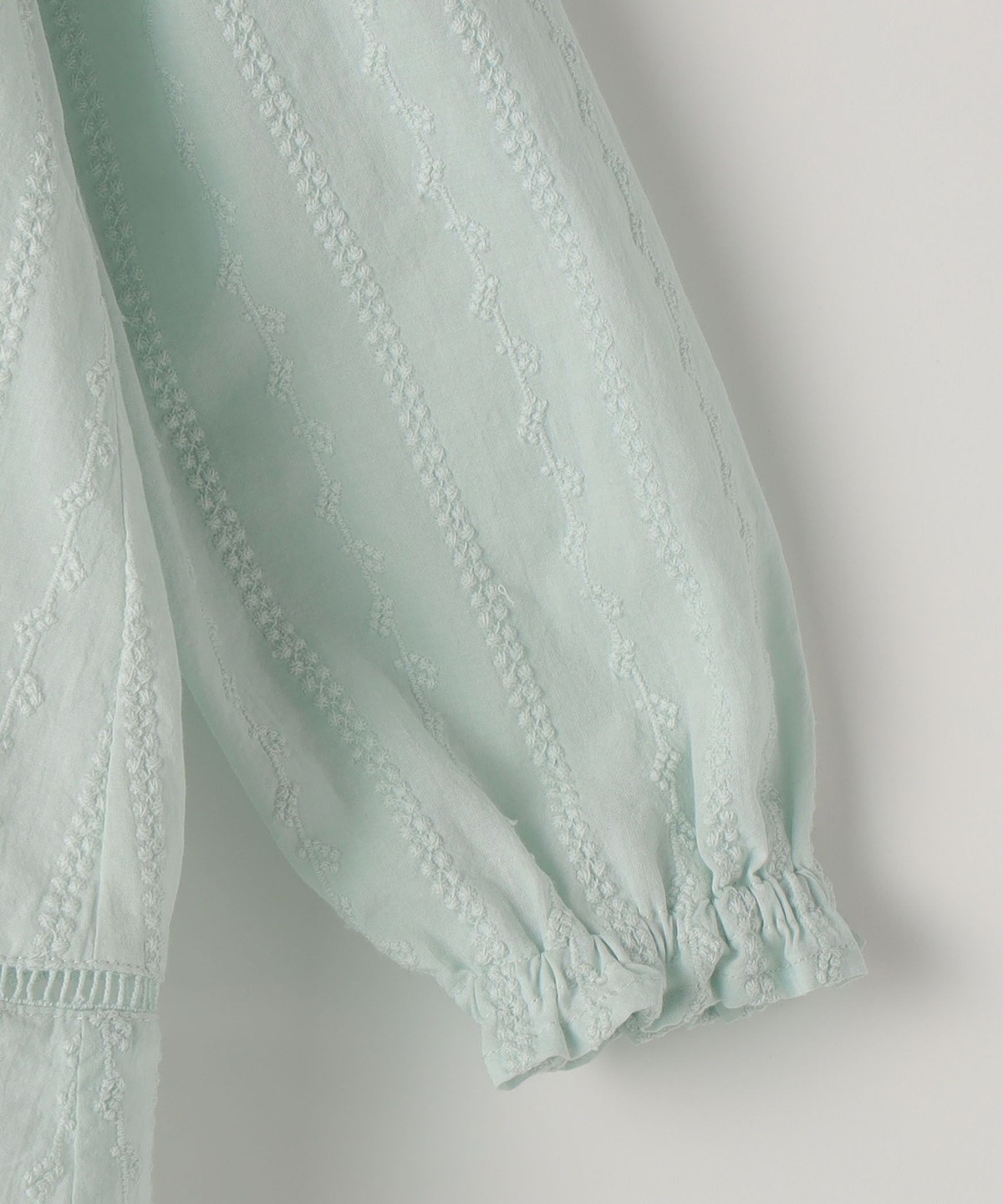 薄手の綿ローンに、繊細な刺繍をストライプ状にあしらった、やや透け感のある素材のブラウス。ふんわり軽く、思わず触れたくなるような繊細さが魅力です。