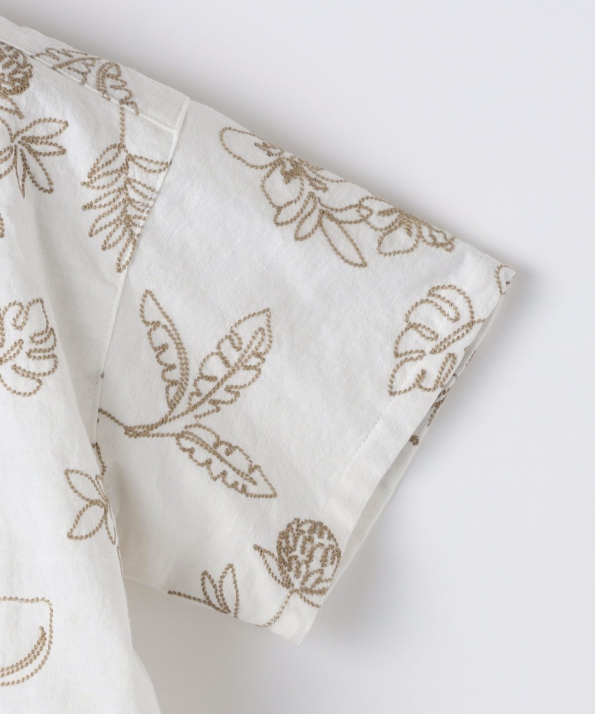 ふんわり軽やかなコットンリネン素材に、ハイビスカスやレモン、シュロの葉など南国モチーフの繊細なステッチをあしらった一枚。襟元はオープンカラー仕様で胸元にはポケットを配しています。