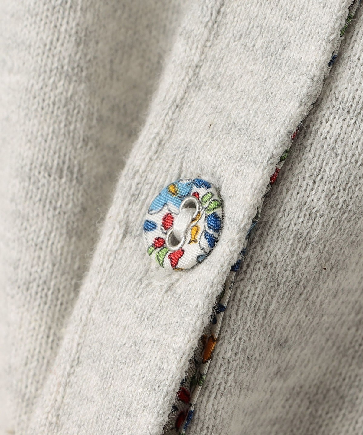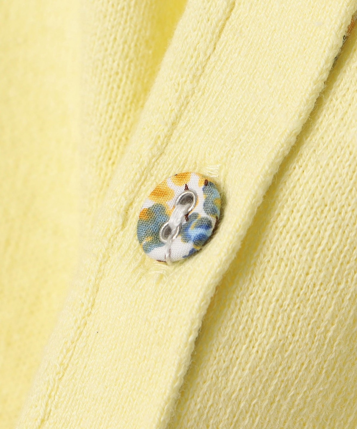 無地のカーディガンにリバティ柄のボタンを掛け合わせた上品なデザイン。