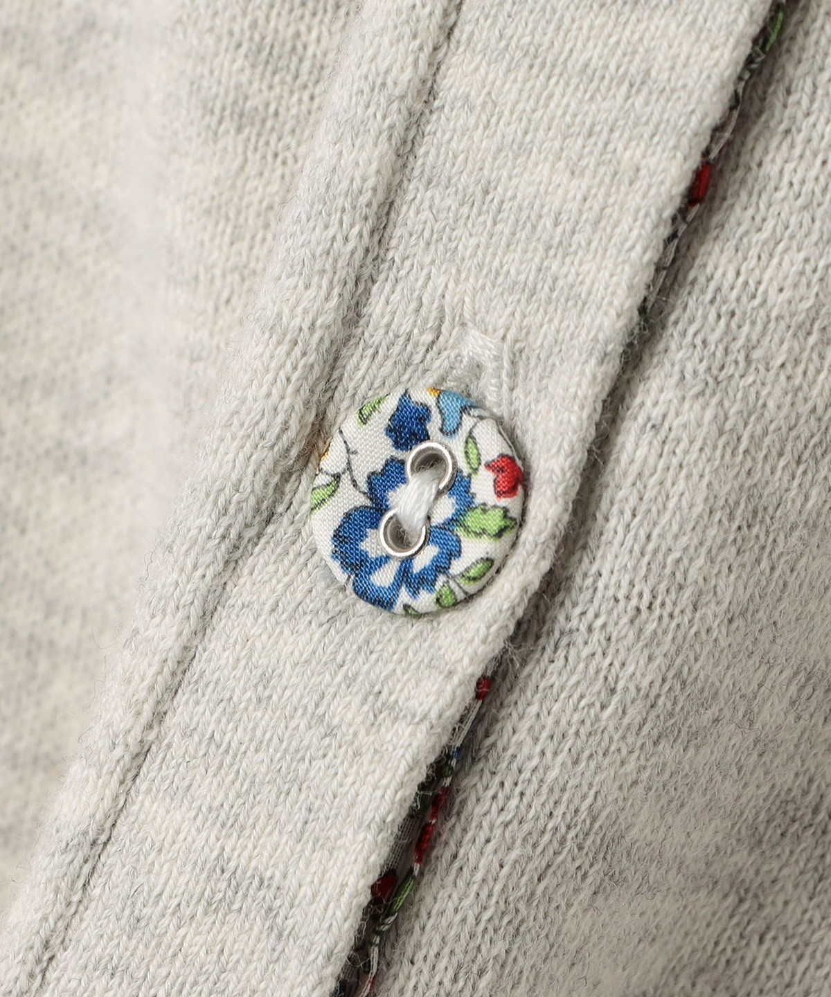 無地のカーディガンにリバティ柄のボタンを掛け合わせた上品なデザイン。