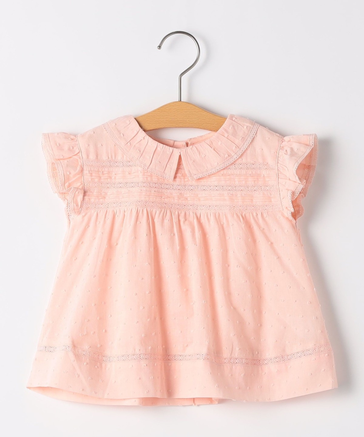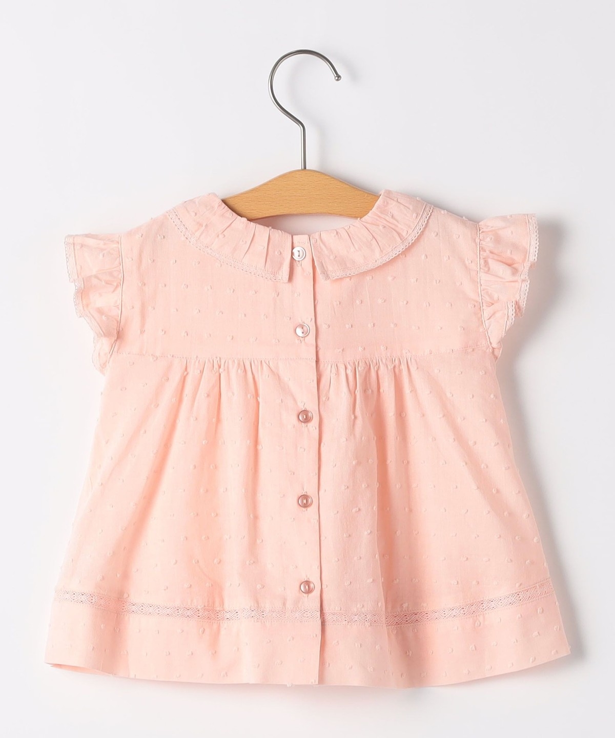 胸元にはピンタックとレースを施し、襟と袖にはフリルをつけて上品で可愛らしいデザインに仕上げています。