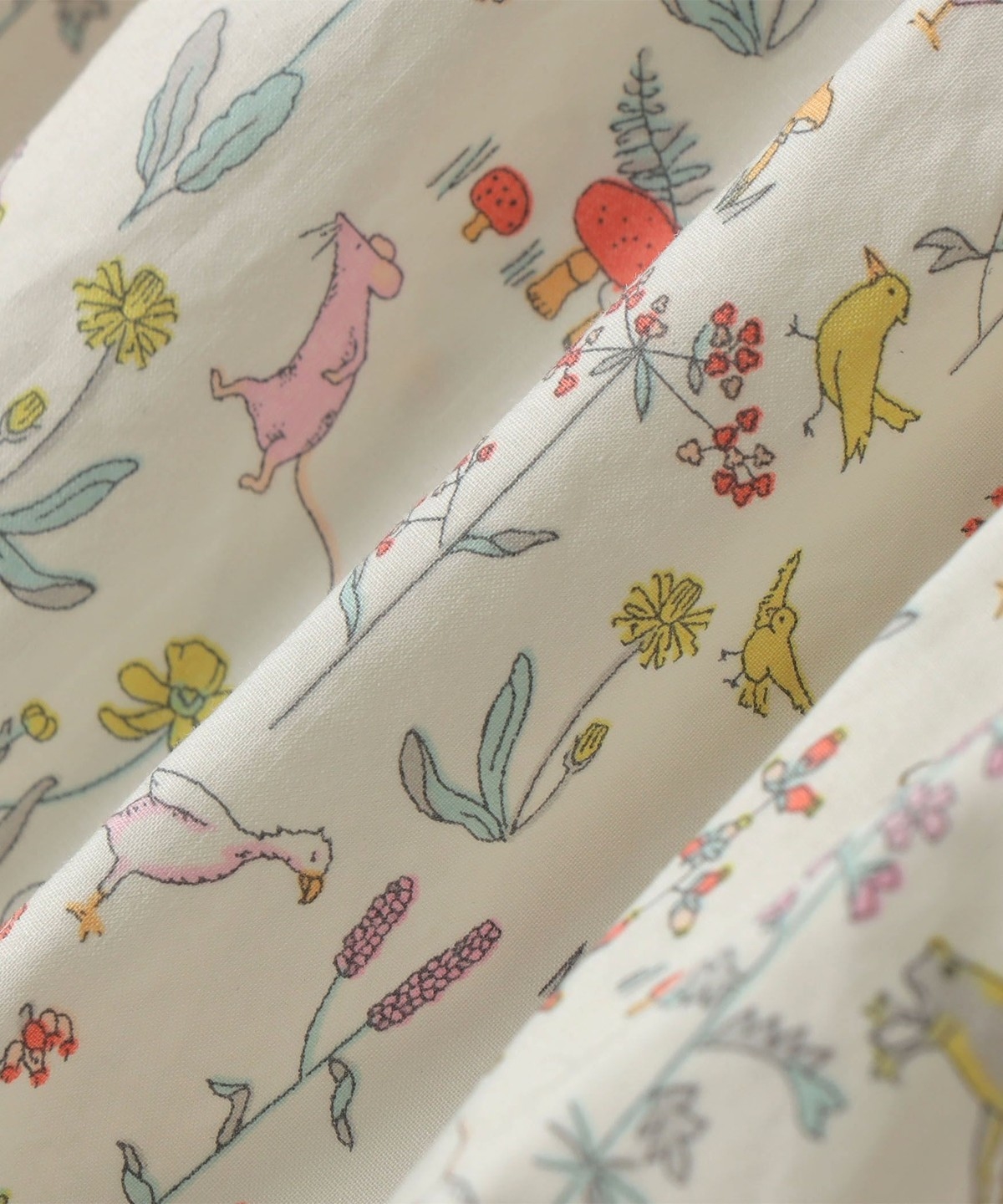 まるで動物や植物たちが布の上を縦横無尽に走り回っているかのような遊び心のある柄で、タマラ・ドゥ・ペオンによるものです。