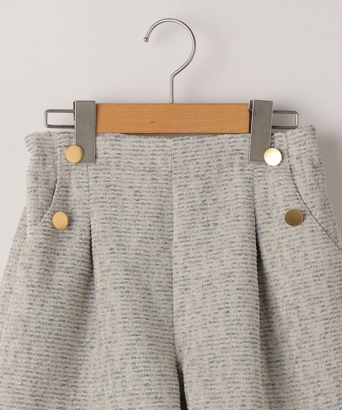 ウエスト部分にタックが入っているのでふんわりと立体的なシルエットを実現。ポケット部分にはゴールドボタンをあしらい、トップスをインしても可愛いデザイン◎