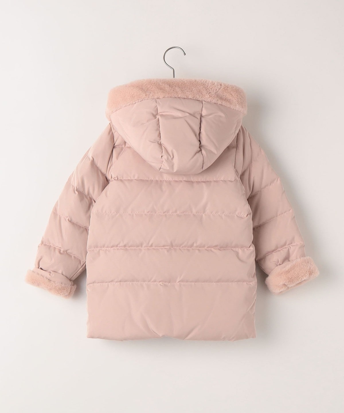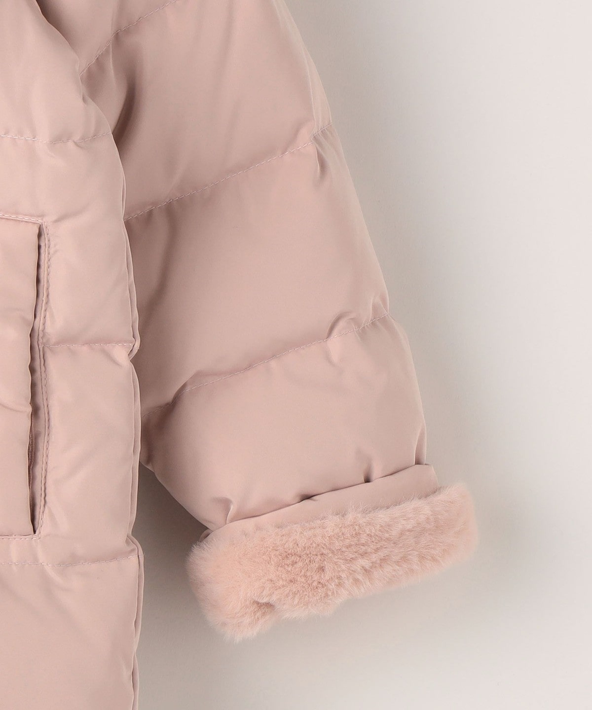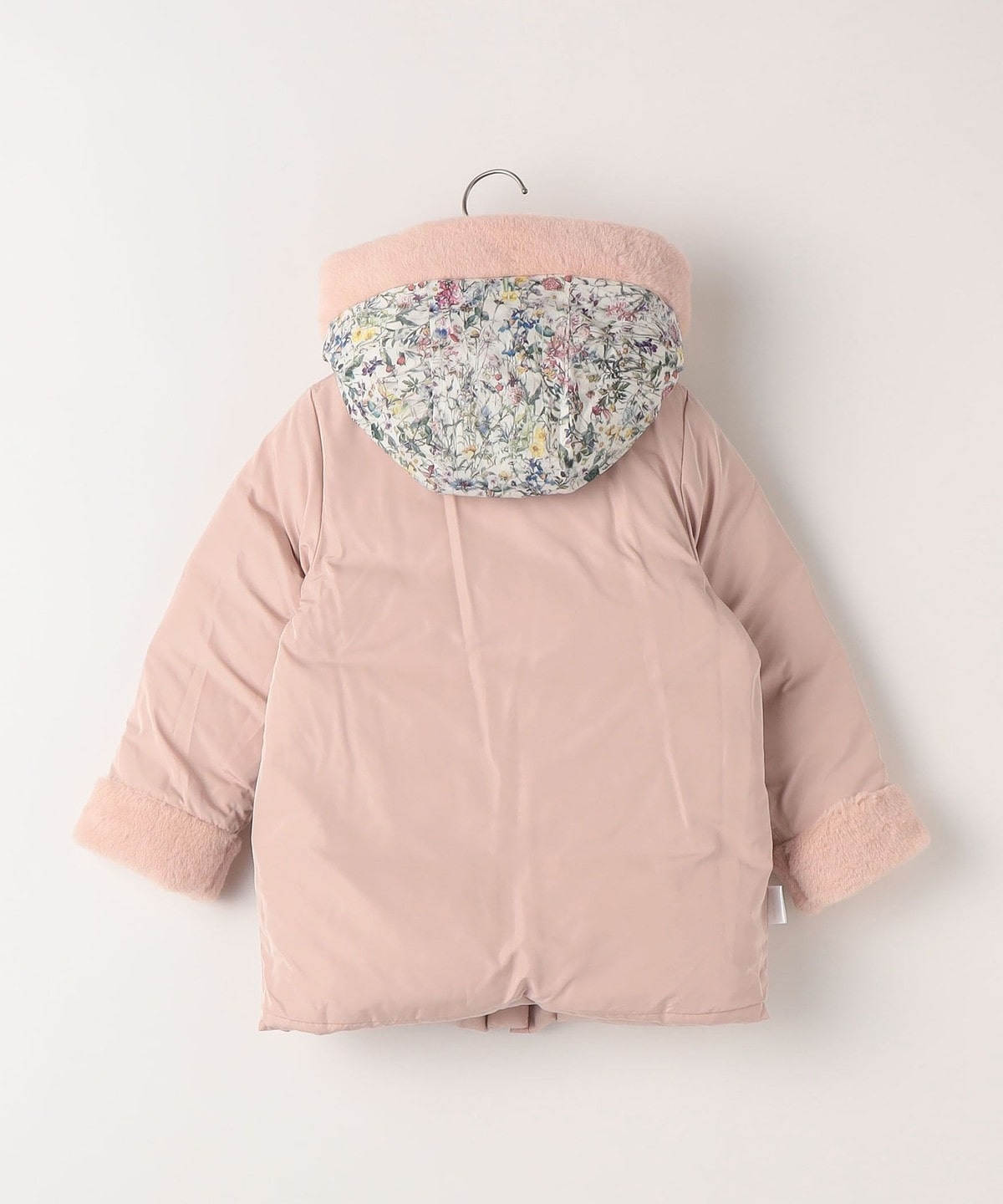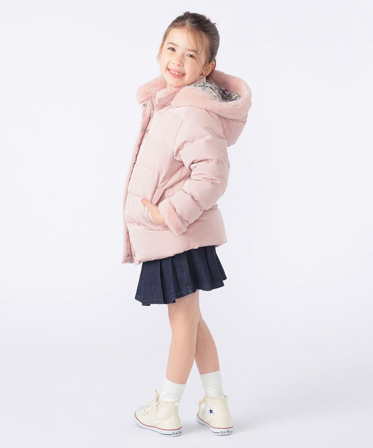 フード周りや袖口にはフェイクファーをあしらい、フードの内側には華やかなリバティプリントを使用し、カジュアルになりがちなダウンも可愛らしい印象に。