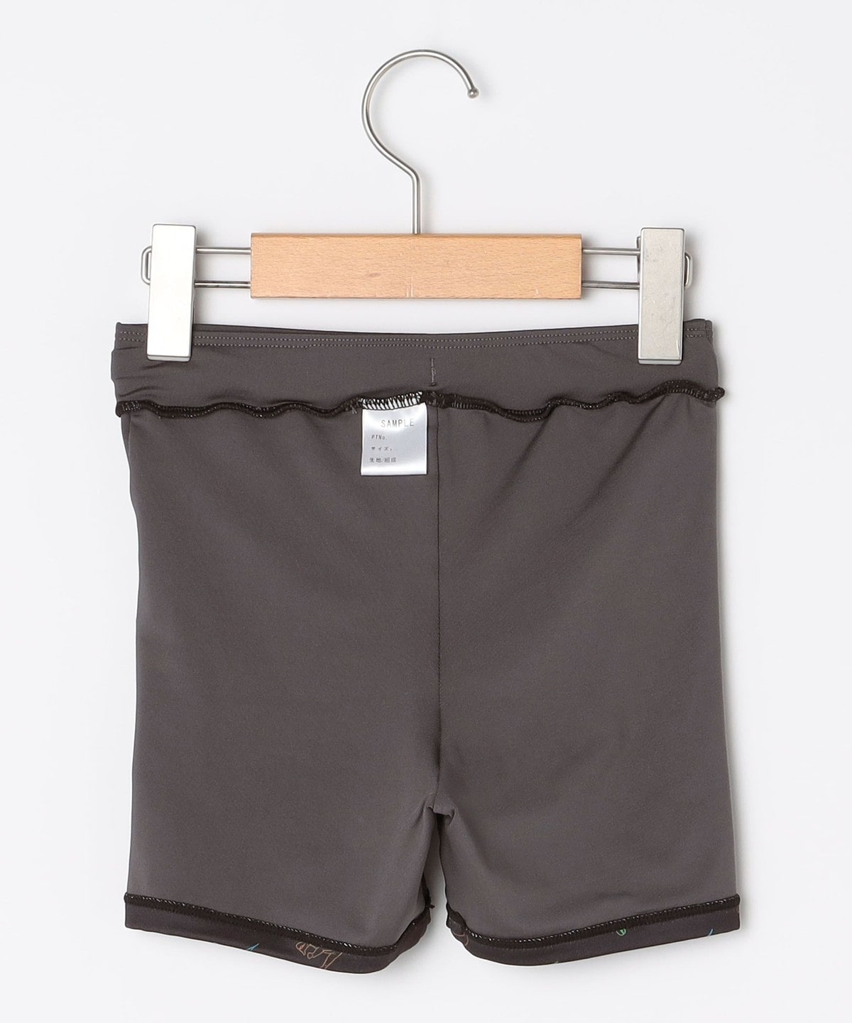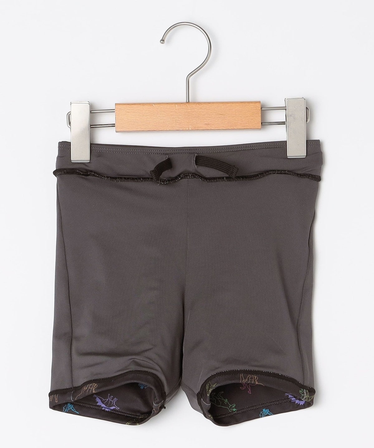 恐竜柄が映えるよう、ベースは落ち着いたチャコールグレーを採用。からだにフィットするシルエットで、内側の紐でウエストの調節も可能なところも嬉しいポイント◎